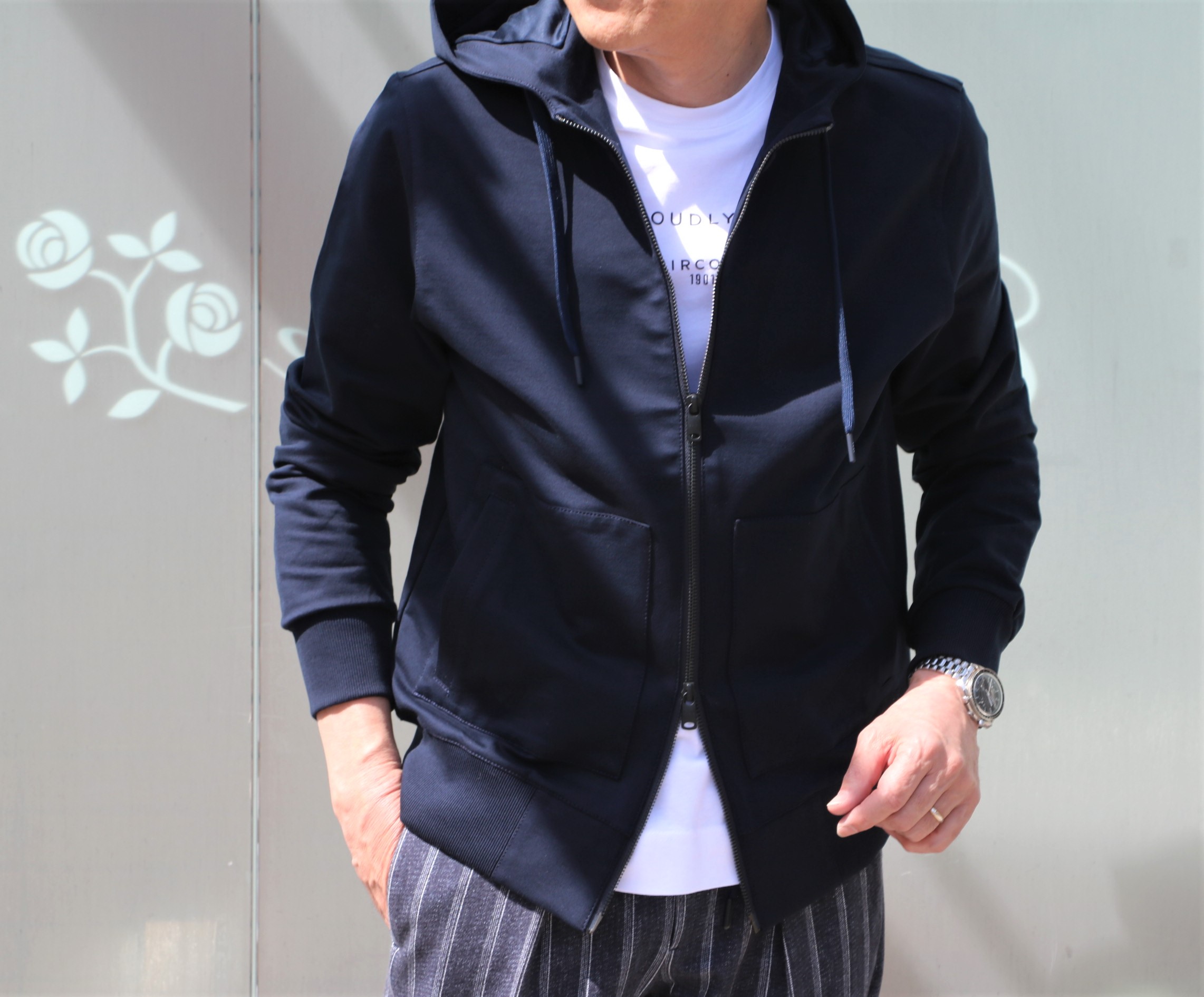 秋冬ならプルオーバー。気温が上がっていく、これからの季節なら、脱ぎ着のしやすい前開きのパーカーが便利です。