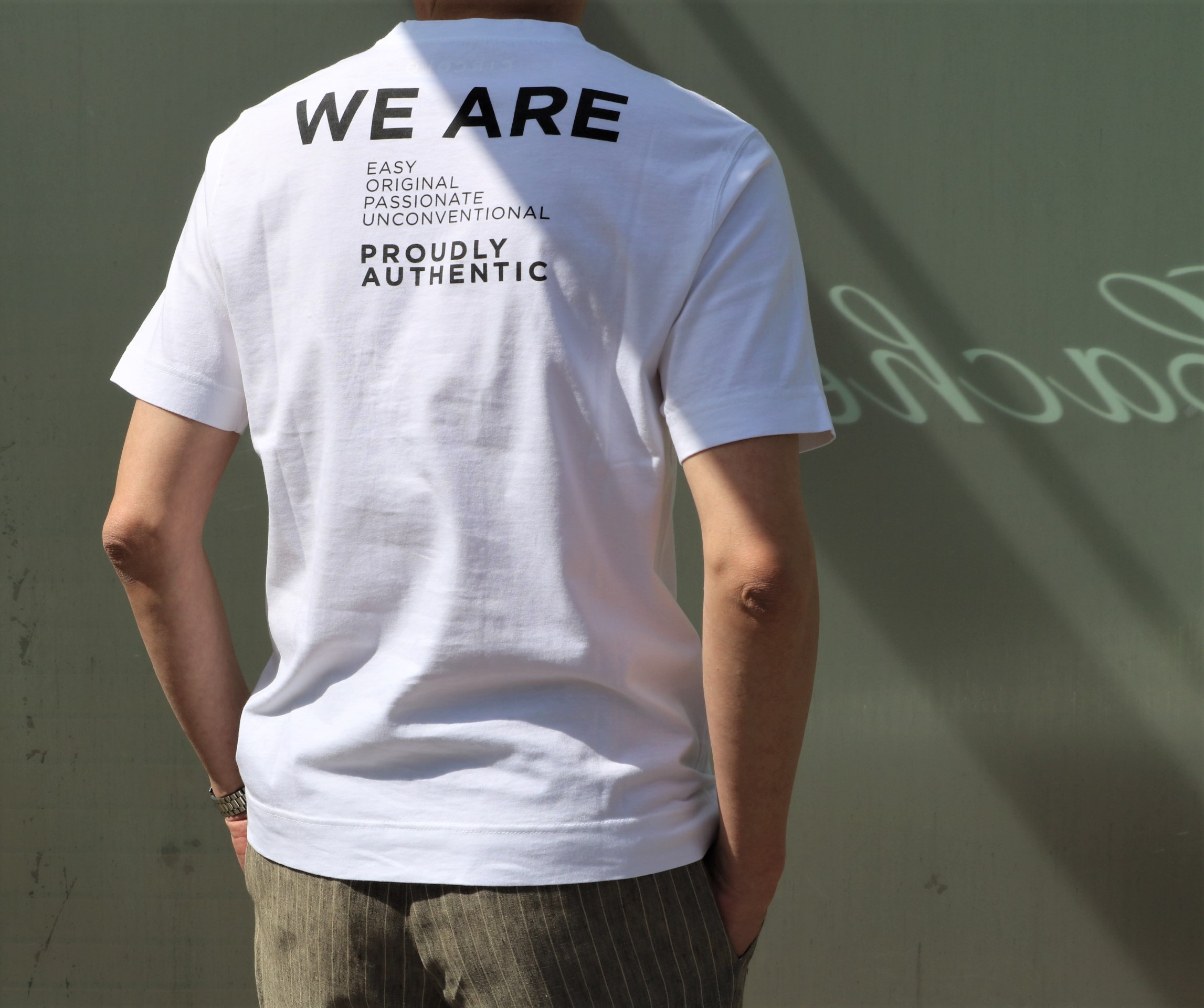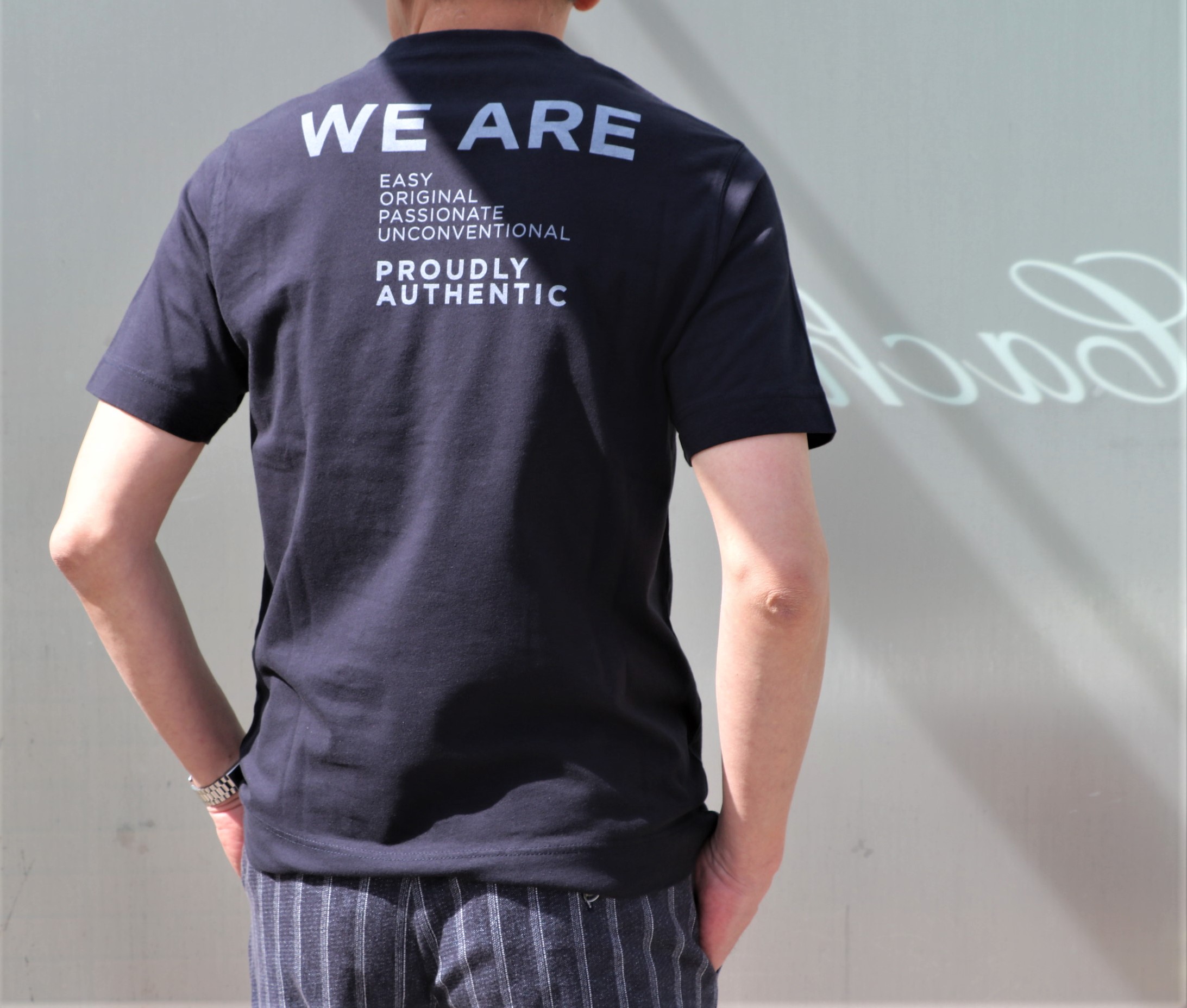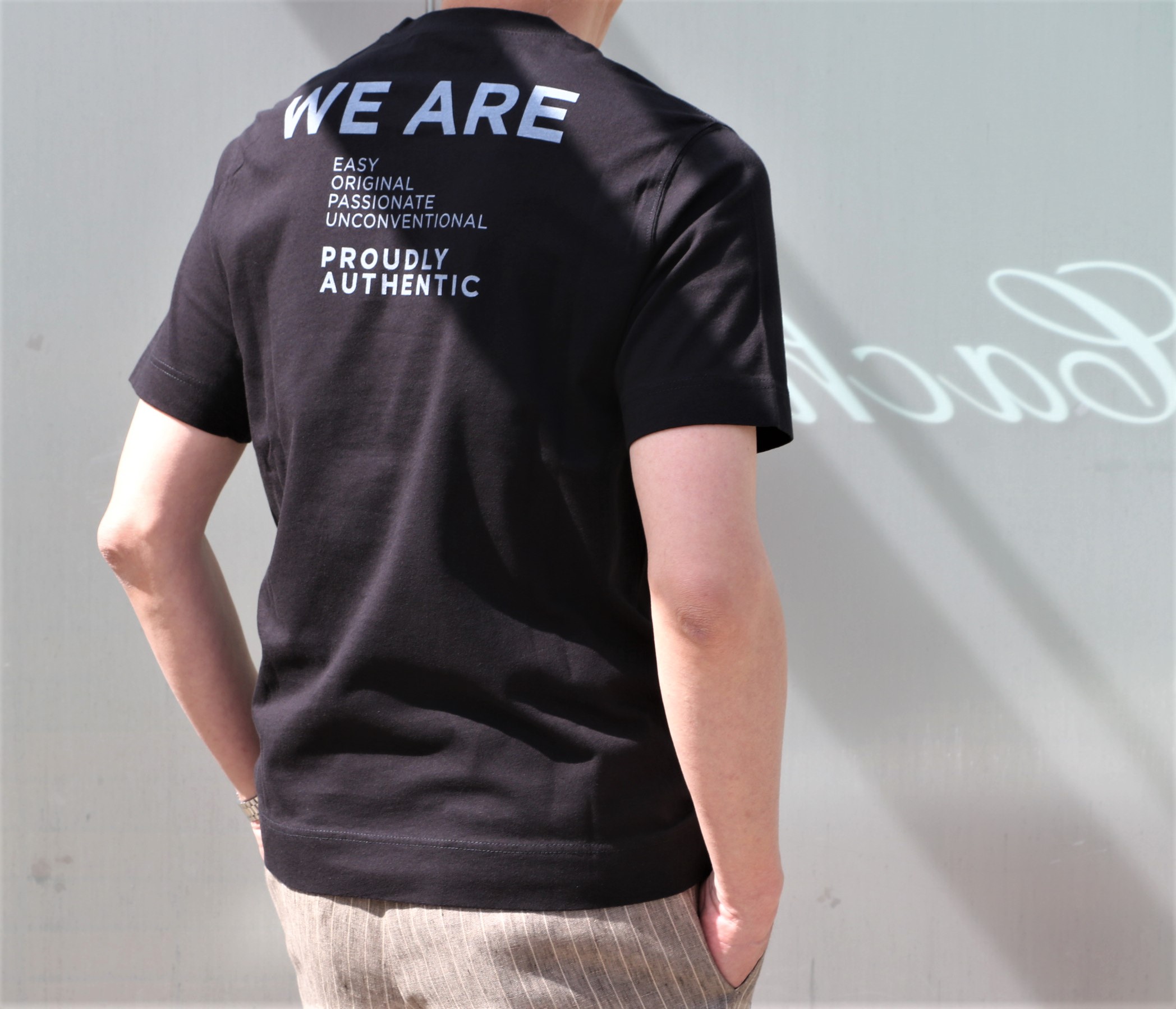 着ている本人は見えないけど、後ろからやってくる人には、ちゃんと確認できる、後ろにも目のある防衛力の高いバックロゴTシャツです。同素材、同色でのご提案になります。