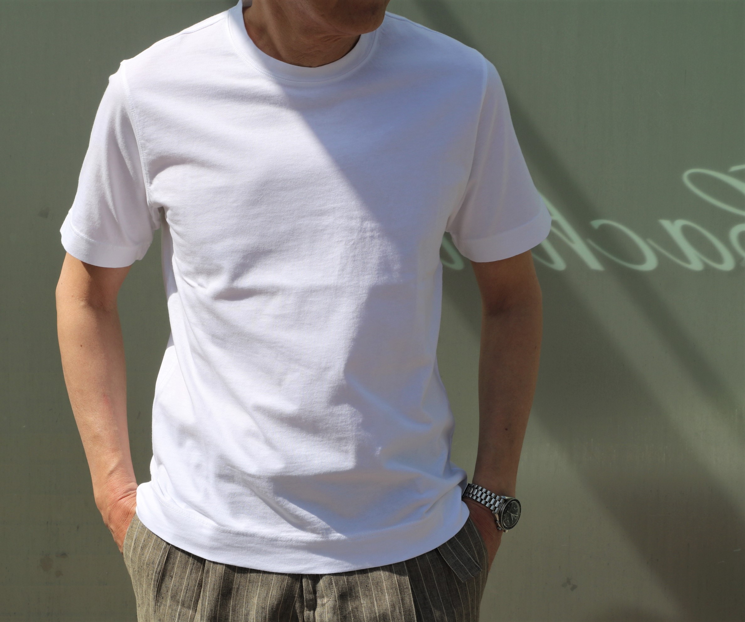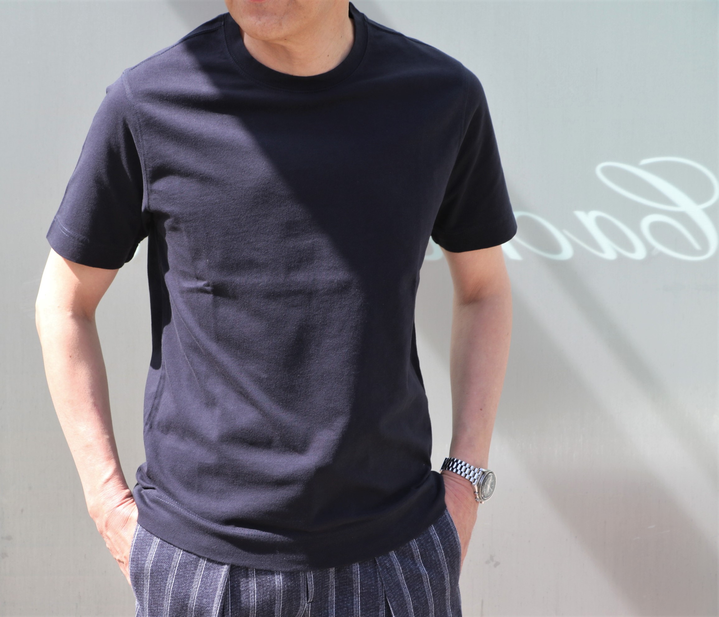 今季、無地以外に意識してセレクトしたのが、ロゴ入り。単調になる夏のコーディネートに線香花火のような華やかさを足すには、ちょうどよい塩梅のデザインになります。ホワイト・ダークネイビー、ブラックの基本3色でご提案です。