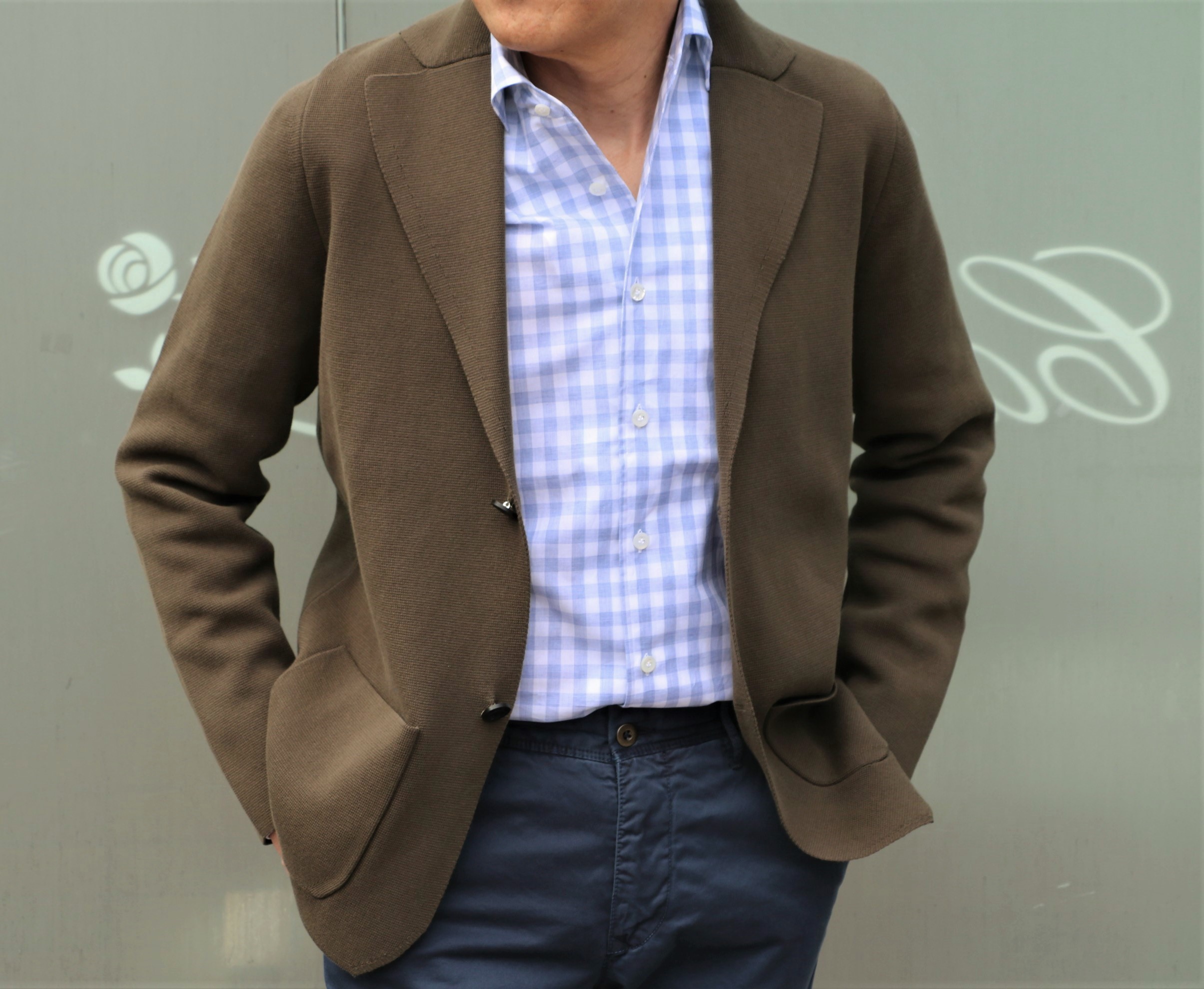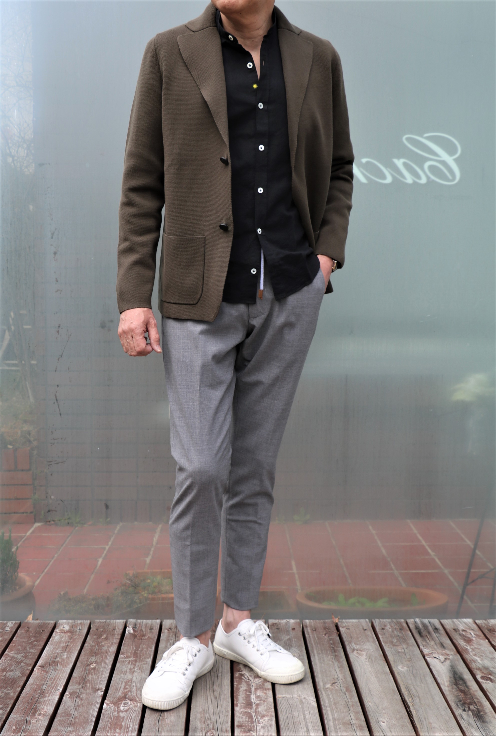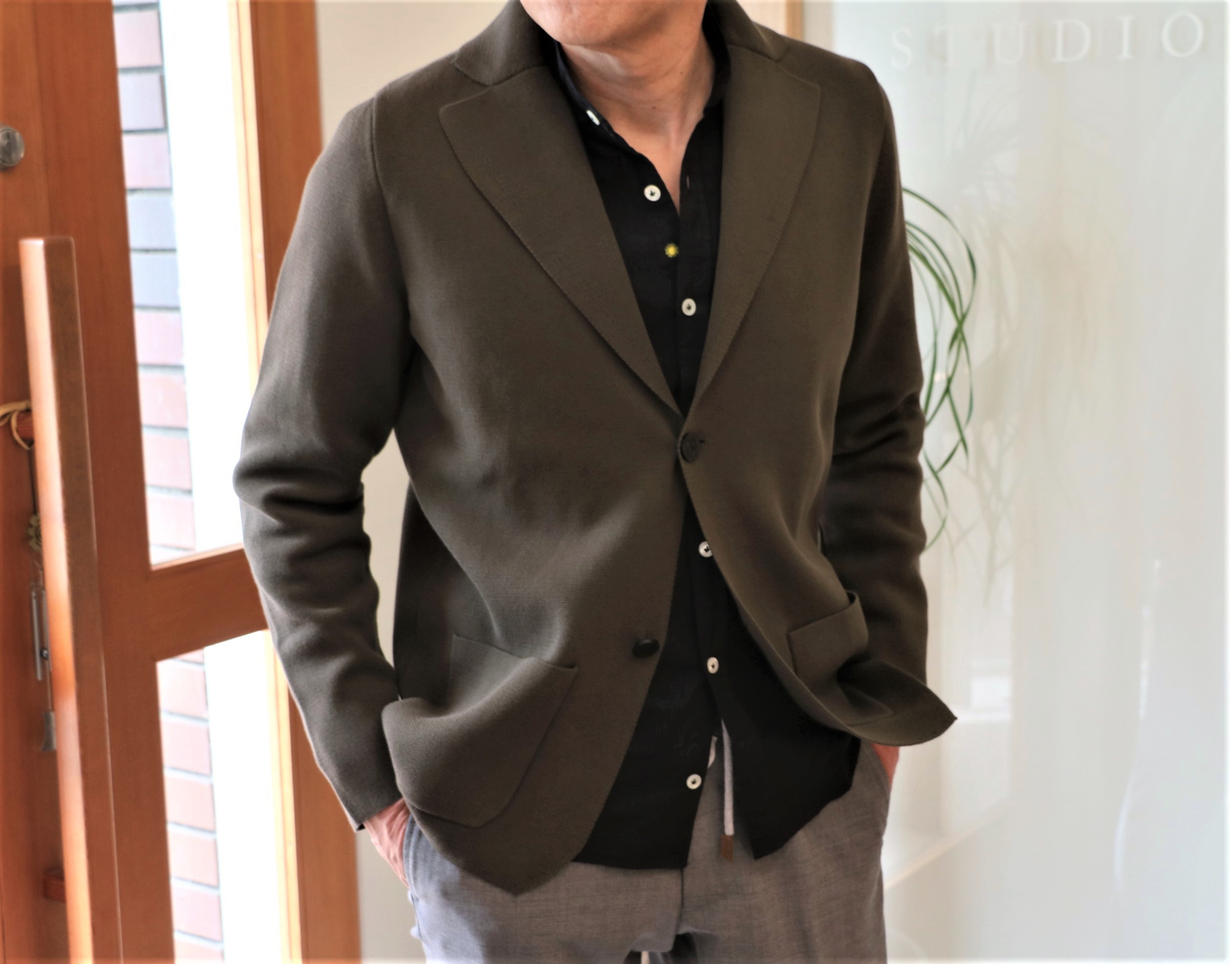 外と室内で写真を撮って色の違いをお見せしようと思いましたが、あまり変わらないようです。現在、蛍光灯の下で色を見ているのですが、屋外で見るより緑がかっています。合わせているシャツはGiannette(ジャンネット)、パンツはeleventy(イレブンティ)です。