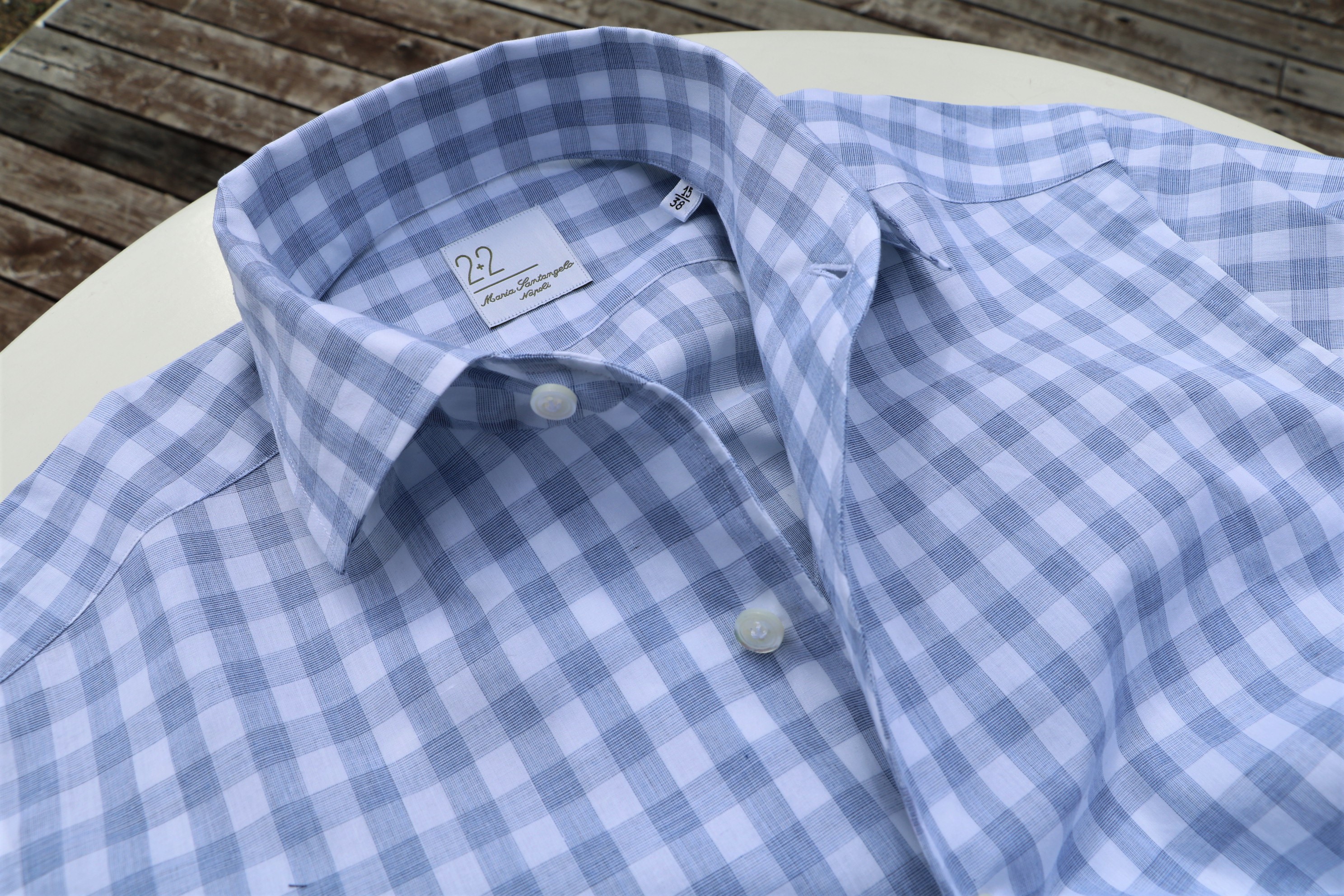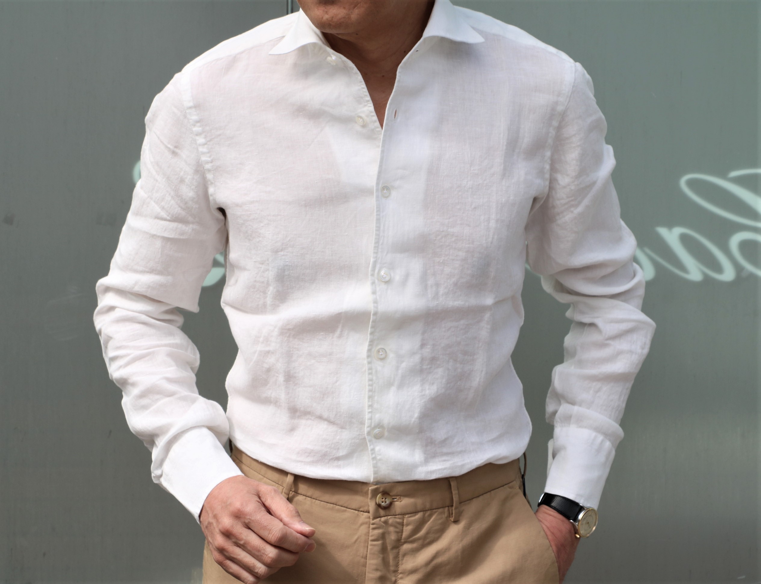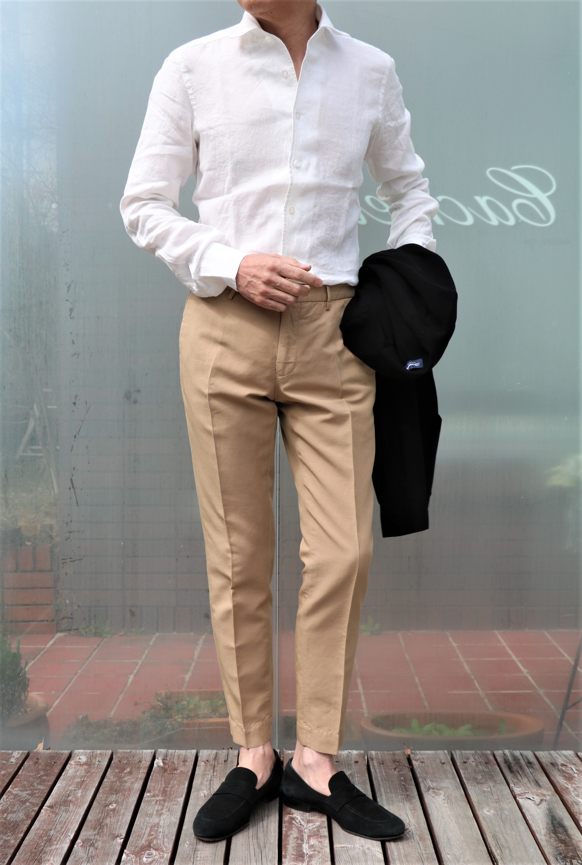 上着を脱いでみましょう。ベージュのチノパンツ(未公開のINCOTEX)にシンプルに合わせたパールホワイト(生成り)のシャツは、【Maria Santangelo/マリア サンタンジェロ】です。