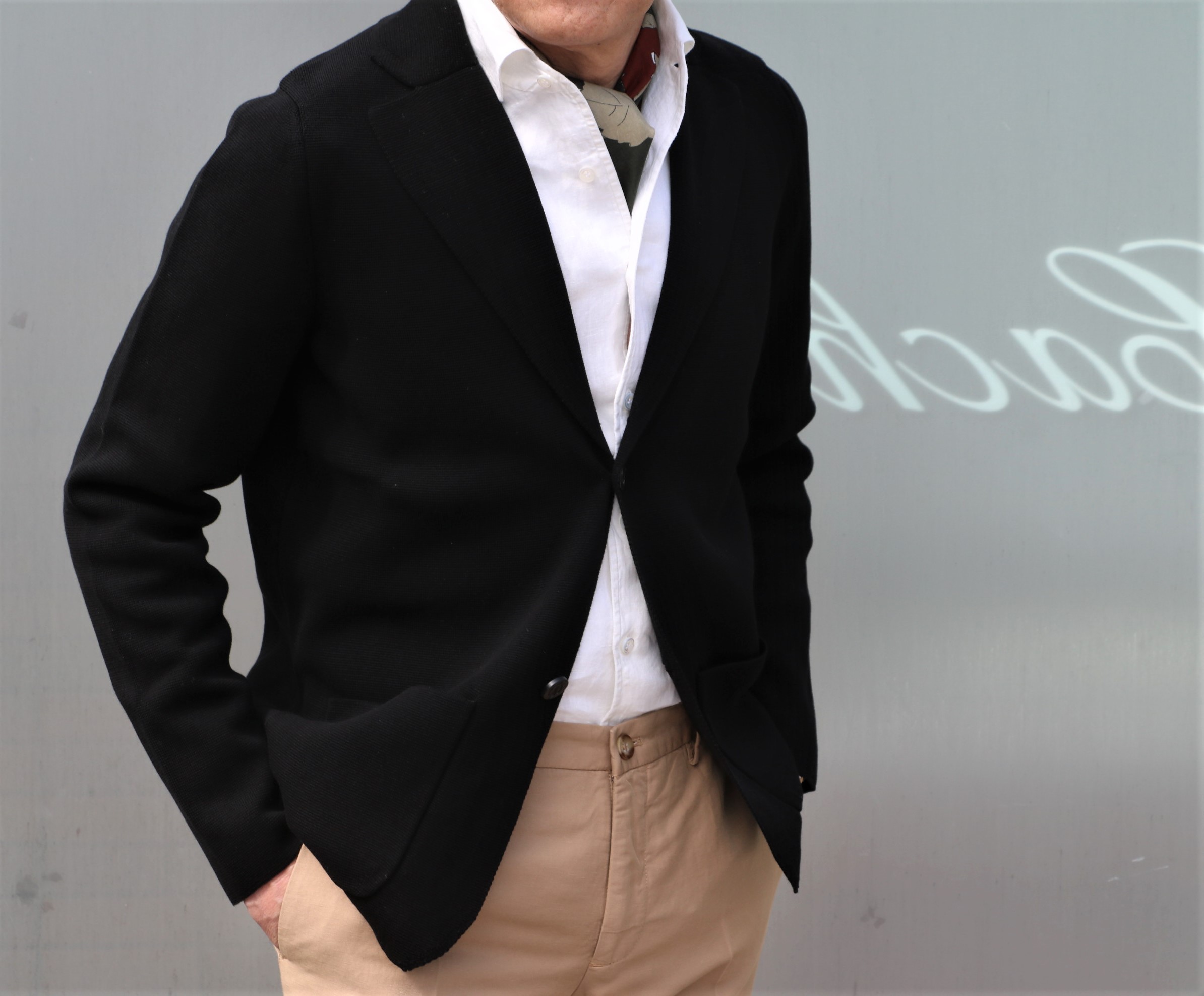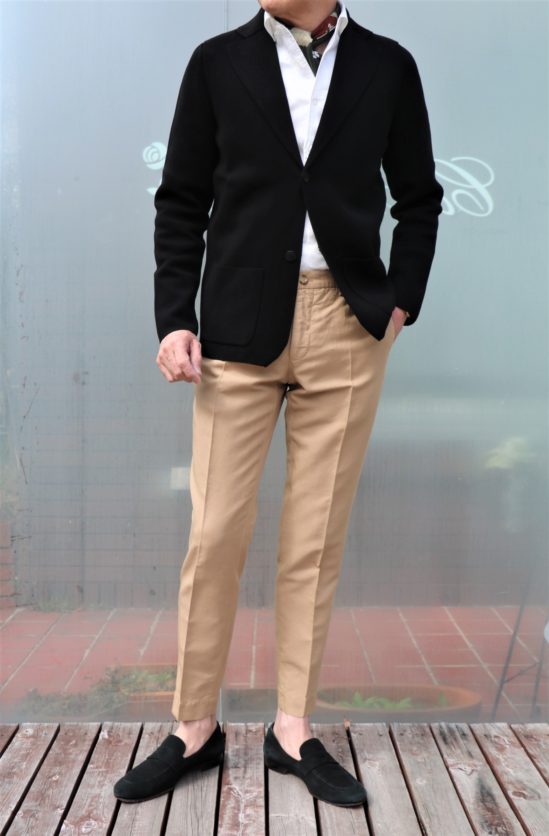 ラフに着るならTシャツですが、他のニットに比べ、カチッと成形されたミラノリブ。タイドアップとまでいかなくても、シャツを合わせて、場合によってはオンで使うことができます。さらに首元にネッカチーフ(Fumagalli)を巻けば、最強です。