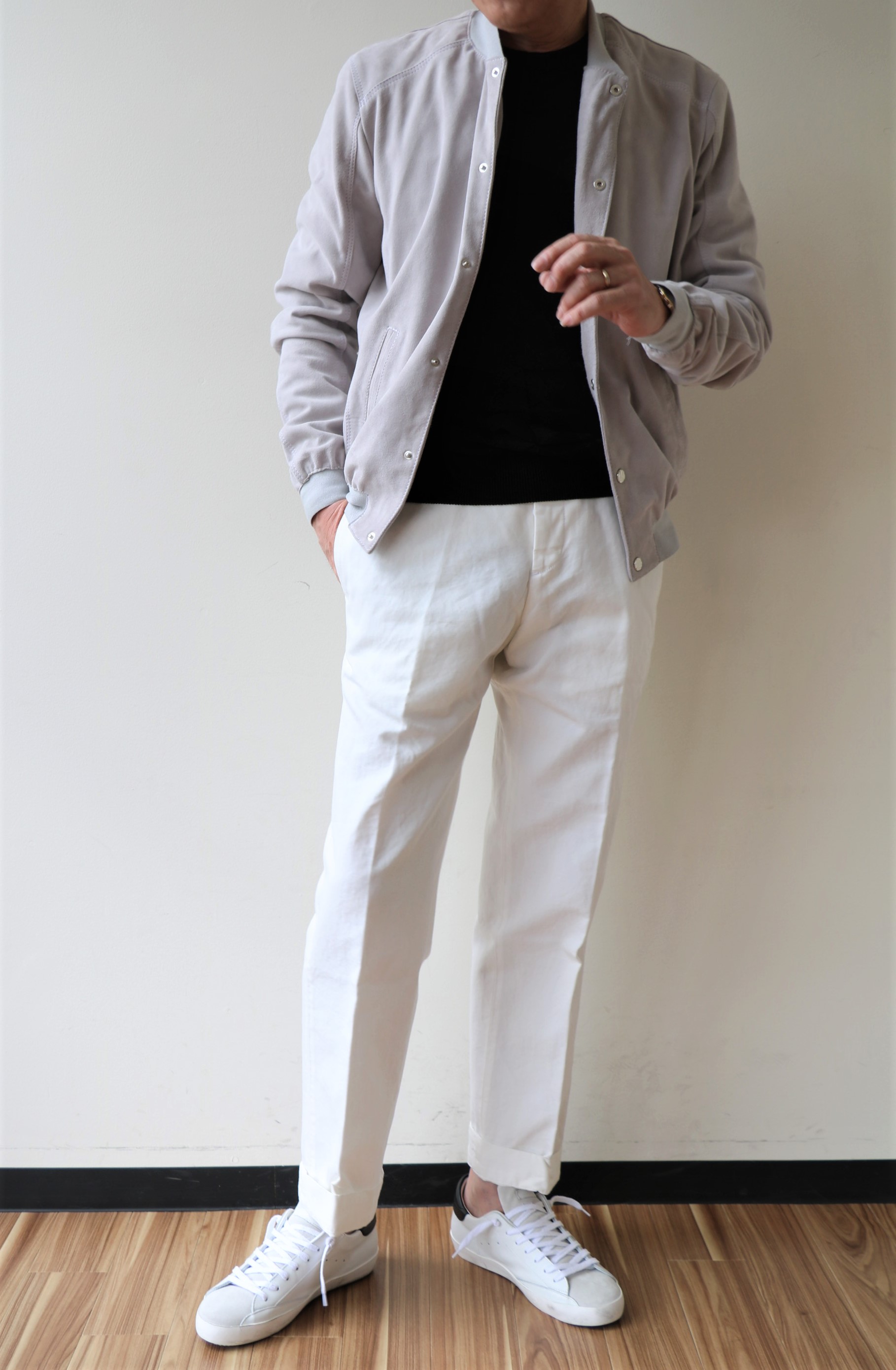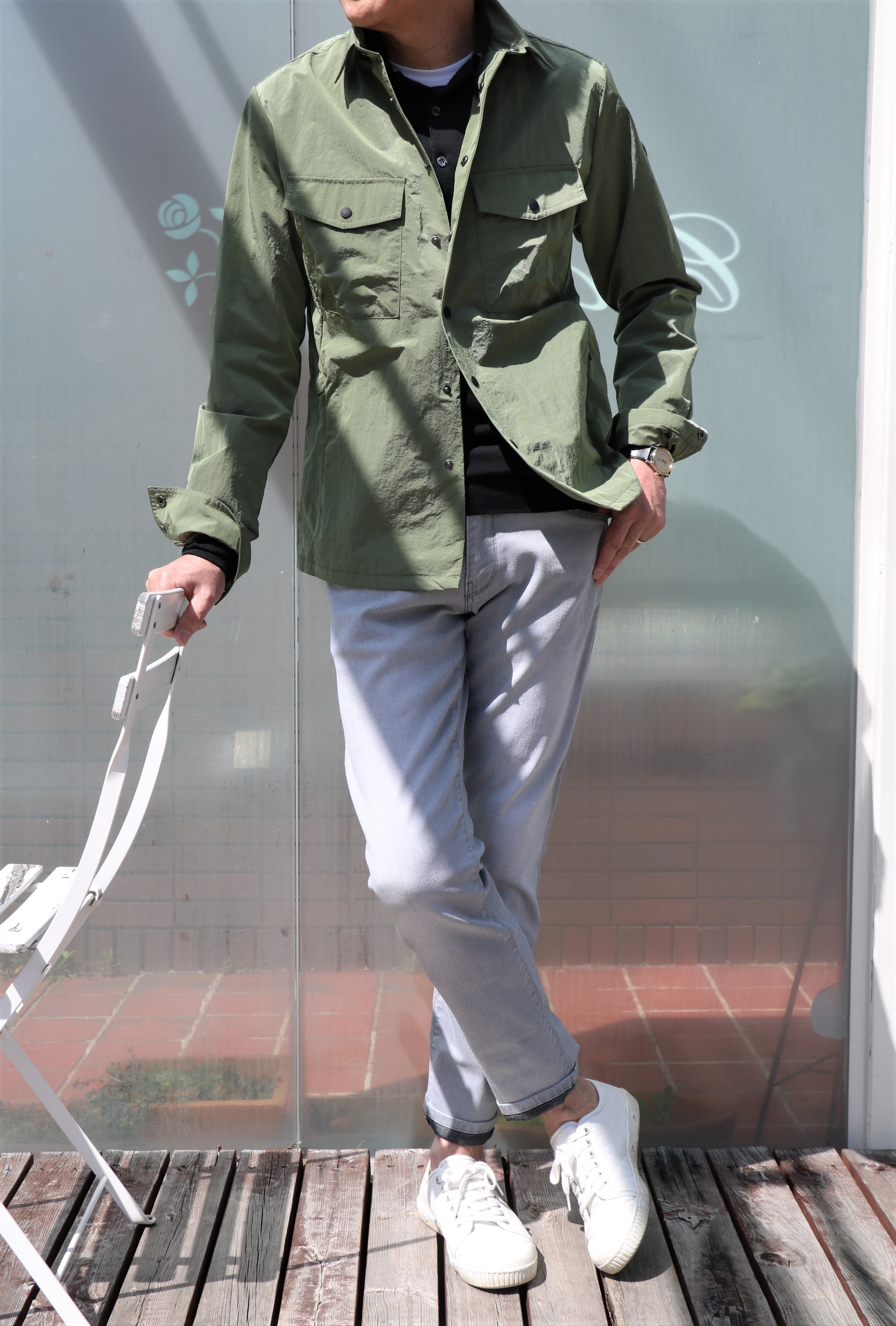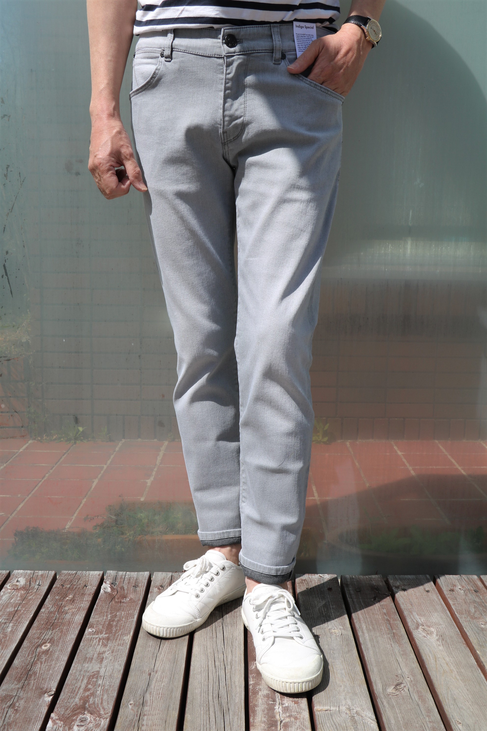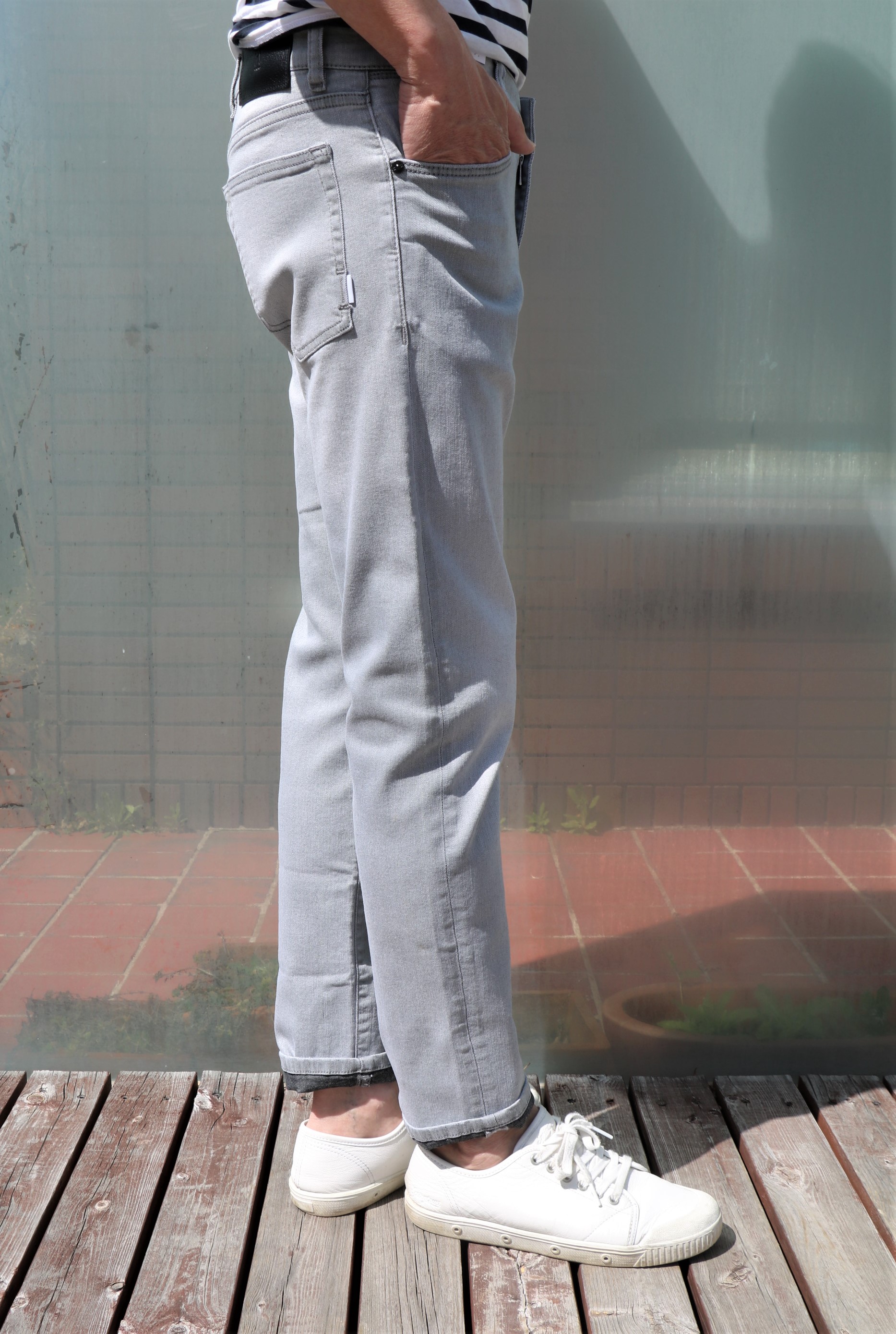 ライトグレイのジーンズに白シャツを着てベージュのジャケットを合わせ、ニュアンスカラーで統一感を演出。そんな言葉がどこかに出ていたような、そんなコーディネートがまず思い浮かぶデニムパンツです。ならば、昨日ご案内のBOGLIOLI(ボリオリ)の亜麻色ジャケットに合わせればよかった...なんて思いも出てきますが、とにかく合わせやすさ、カッコよさを求めるなら、ぜひ揃えておきたいカラーです。モデルはスッキリスリムの「SWING」でセレクトしております。