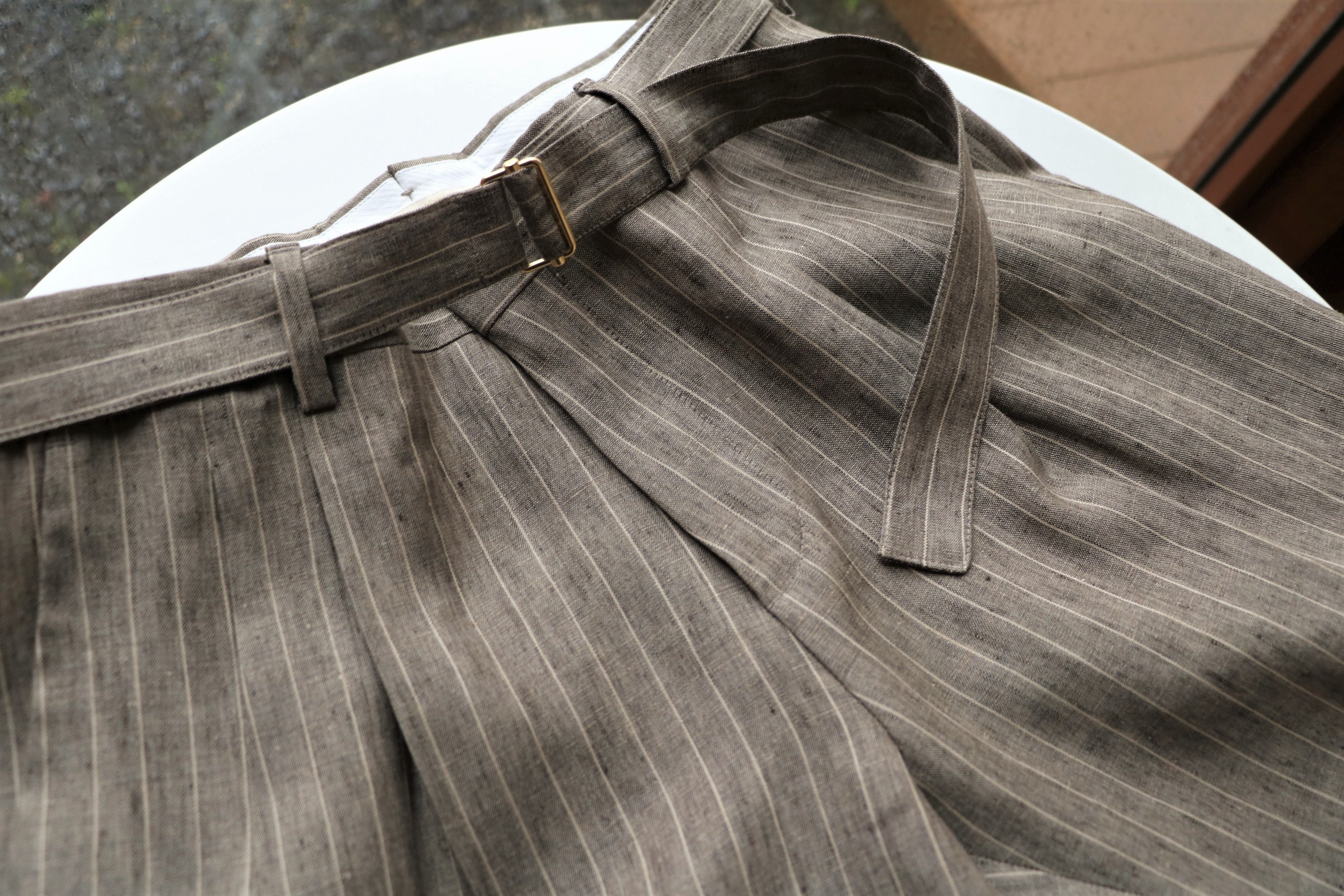 MODEL:「BRERAS」リネンストライプ共地ベルト付きパンツ