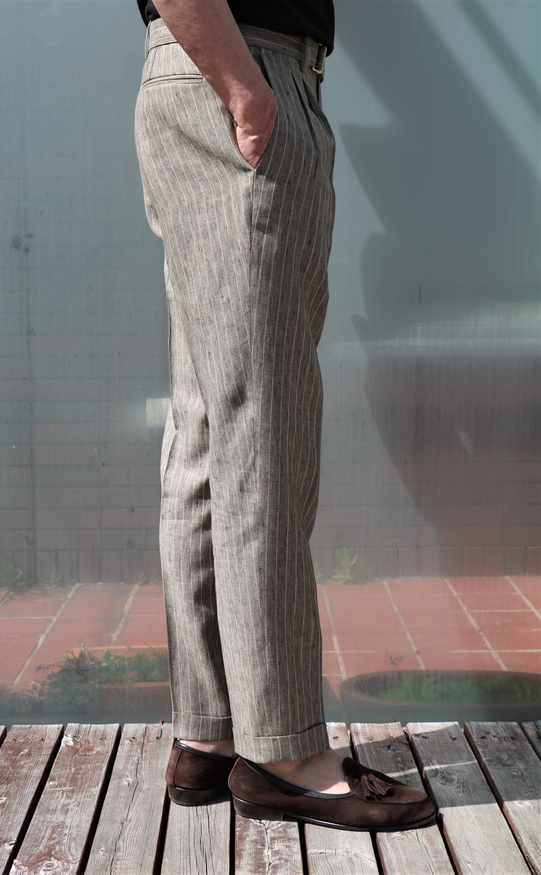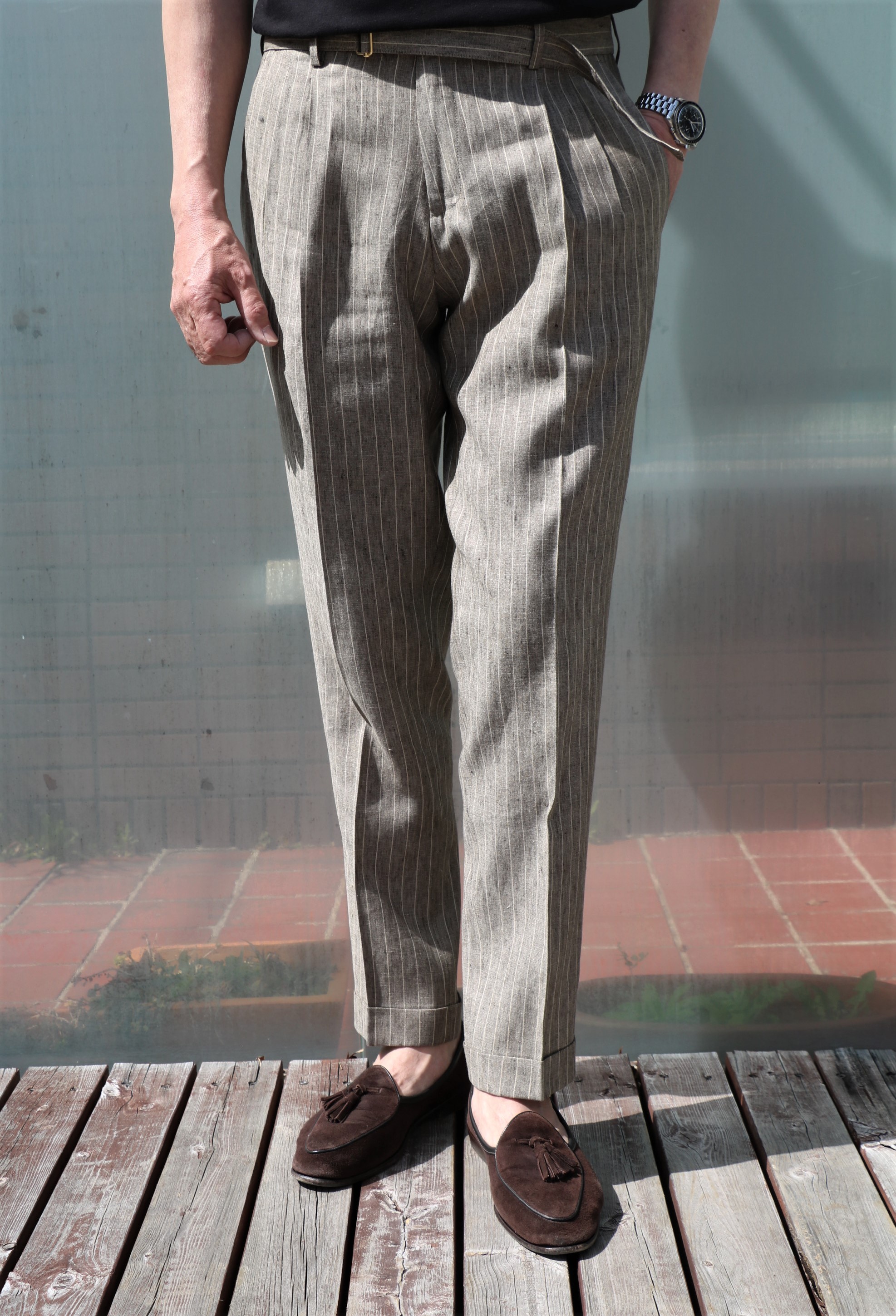 リネン100%のクラシックな表情を持つミディアムブラウンのストライプ柄。白のスニーカーで合わせた、スポーティーなコーディネートも頭に浮かびます。