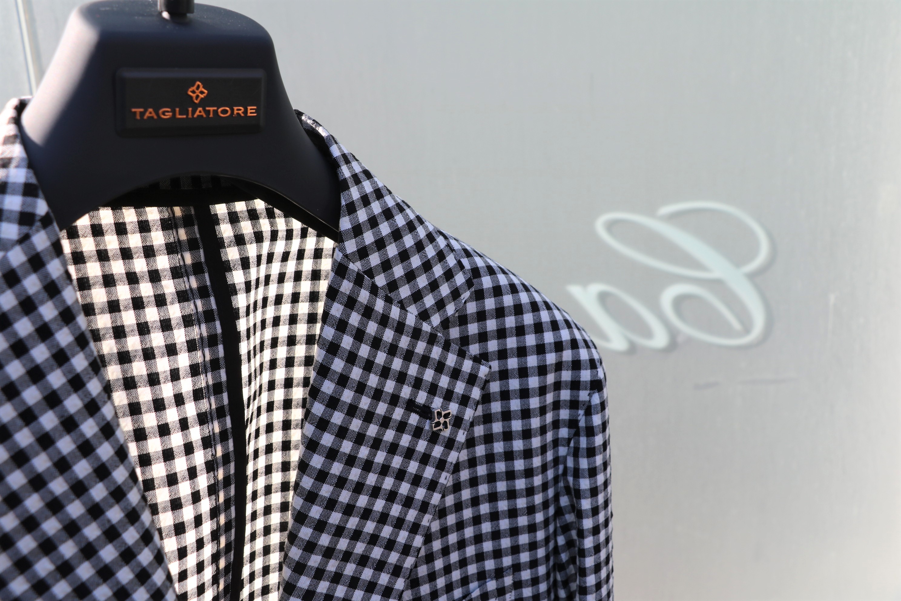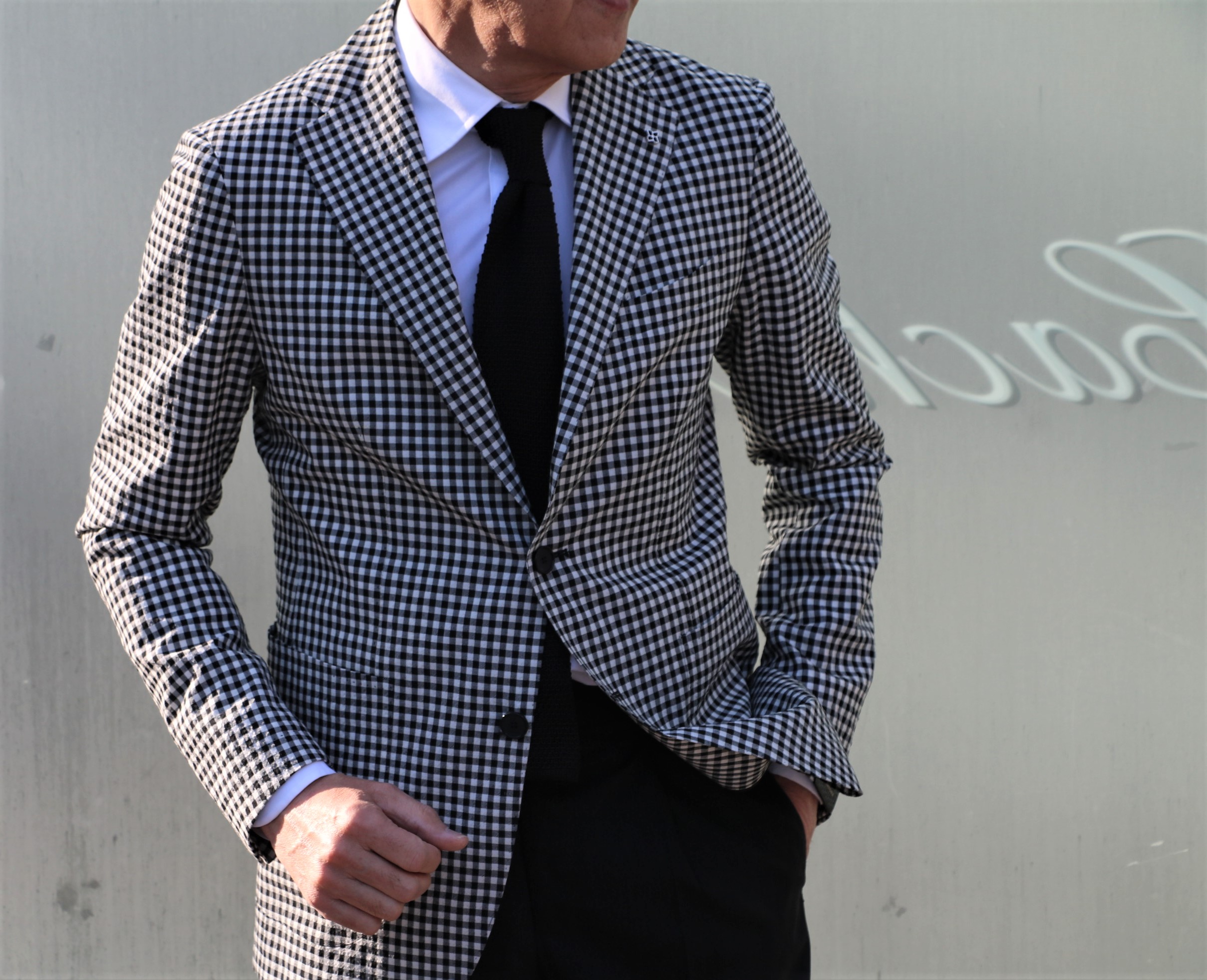 どうです?涼しげです。ウール・コットンのシアサッカーのような優しい凹凸感をもつモノクロのチェック柄ジャケットです。シアサッカーseersuckerとは、ペルシア語のshir va shakkarに由来していて、「ミルクと砂糖」の意味があるようです。なんとなく甘みのあるジャケットにも見えてきます。