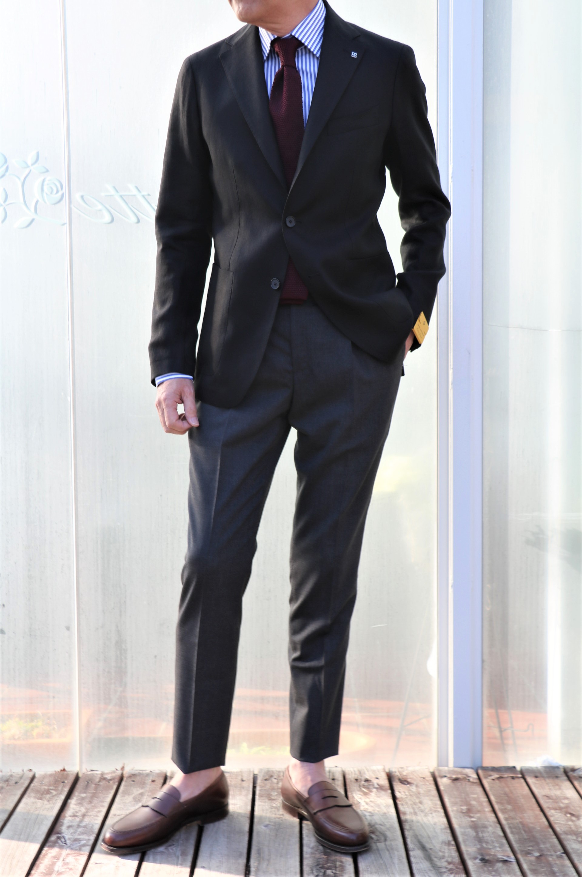 こちらも同様、PT TORINO(ピーティートリノ)のグレイなウールパンツのご案内の際に合わせていました。ロンドンストライプのシャツ(Maria Santangello)にエンジのニットタイ、パンツはチャコールグレイではなく、もう少し明るいグレイを合わせています。まるでミルクと砂糖なしのブラックコーヒーのように...くどいですね。モデルは、こちらもアンコンタイプの「DAKAR」。軽い着心地が魅力です。
