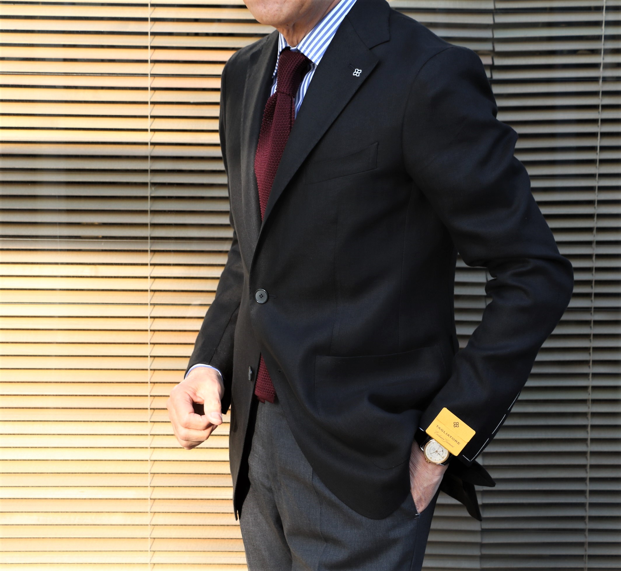 甘みを抑えるなら、タイドアップ。白シャツ(Maria Santangello)に黒のニットタイ、ブラックではなくチャコールグレイのパンツに合わせると、ミルクと砂糖は苦めなコーヒーによく合います。個人的には、ブラックしか飲みませんが...なんて無駄話をしている場合ではありません。モデルは「DAKAR」。副資材を省いたアンコンジャケットになります。