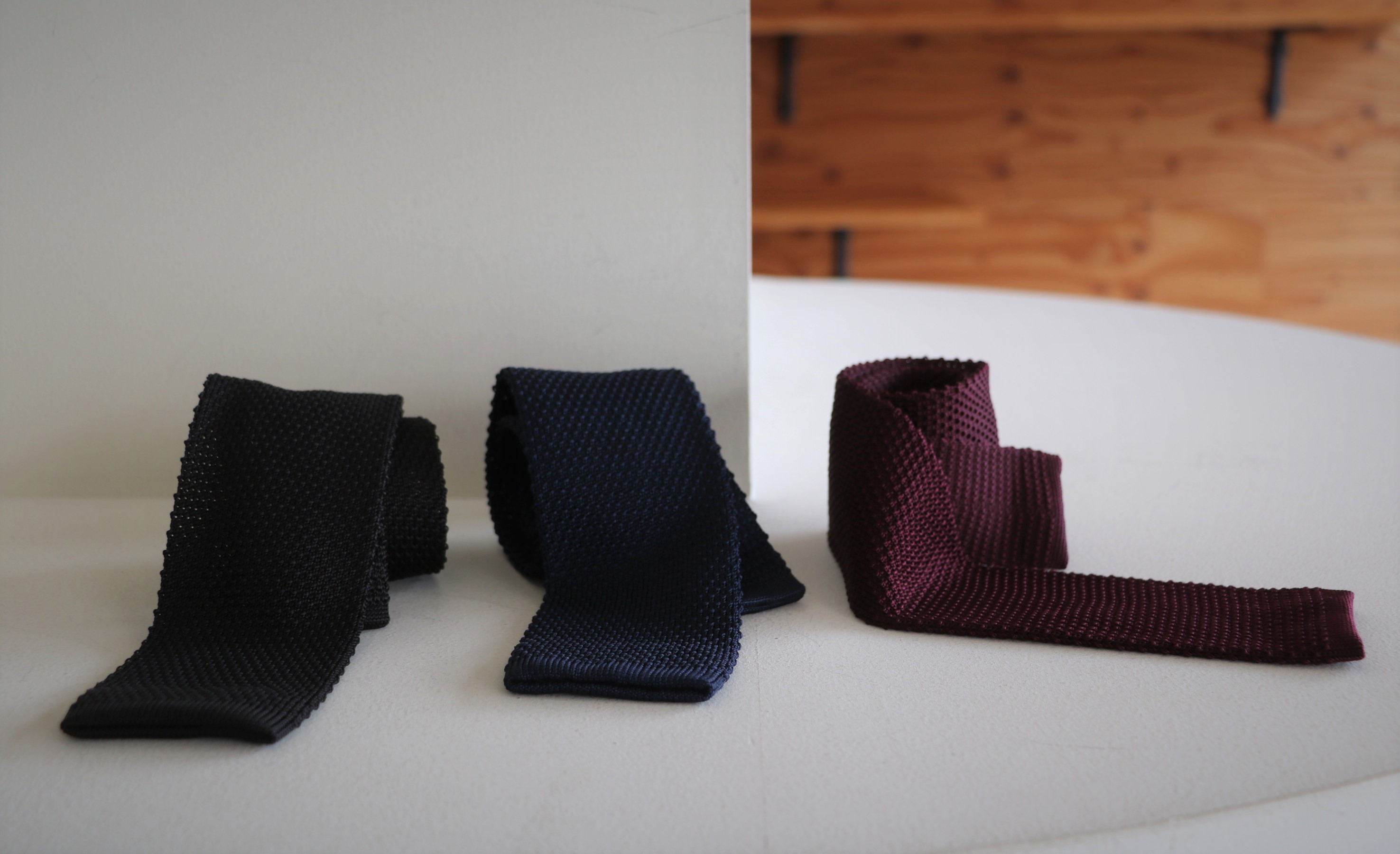 セレクトカラーは、右からエンジ、ネイビー、ブラックの3色。通年、使うことのできるシルクニットです。前回ご案内のFRANCO BASSI(フランコ バッシ)のシルクメッシュタイよりラフに使えます。学生時代、半袖のポロシャツに結んで、颯爽と歩いていた世間知らずの私。ただ、大学の近くにあるメンズショップのお兄さんには受けたようで、その後、近くを通った際、その方が同じスタイルで売り場に立っておられたのを遠巻きに見て、ほくそ笑んでいたことを思い出しました。