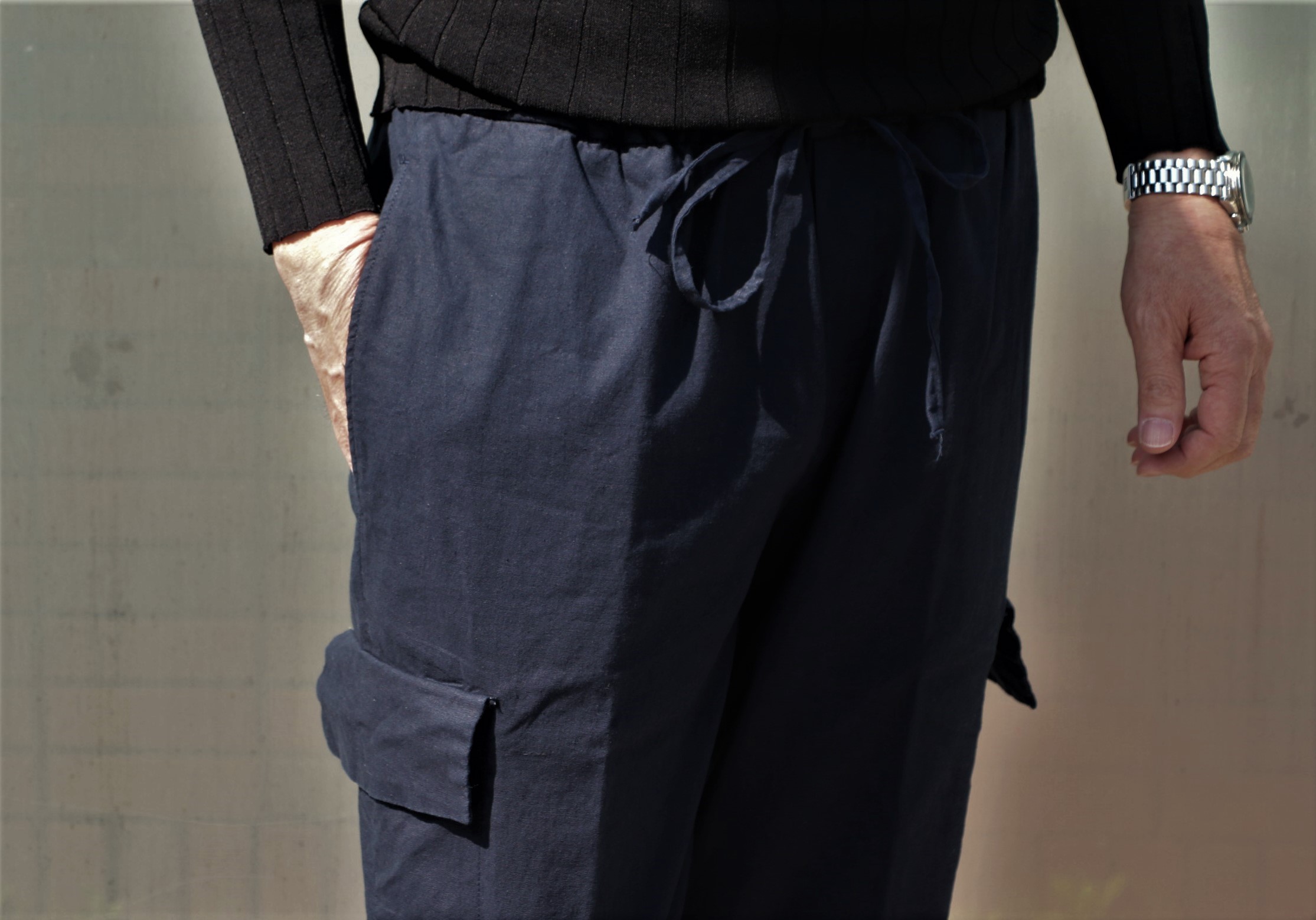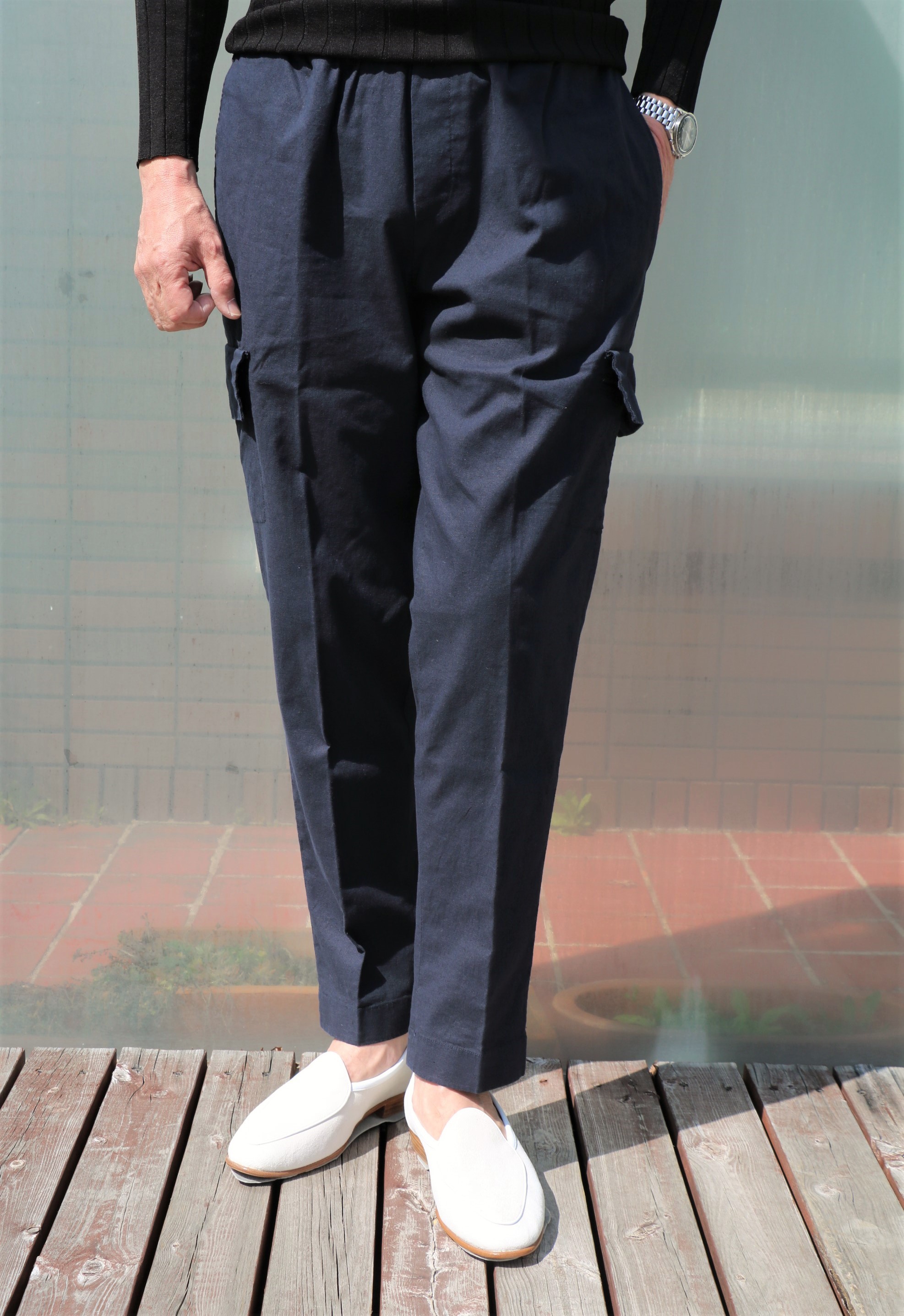 ネイビー好きにとって、夏のネイビーパンツには自ずから力が入ります。今季、ネイビーでセレクトしたパンツは、eleventy(イレヴンティ)のストレッチカーゴ、INCOTEX(インコテックス)の「後染めコットンチノパンツ」。そして、この【Borelio/ボレリオ】の新型モデル「CALLEN」。ドローコード付きシャーリングパンツ「CHAD2」にカーゴポケットが付いたモデルです。