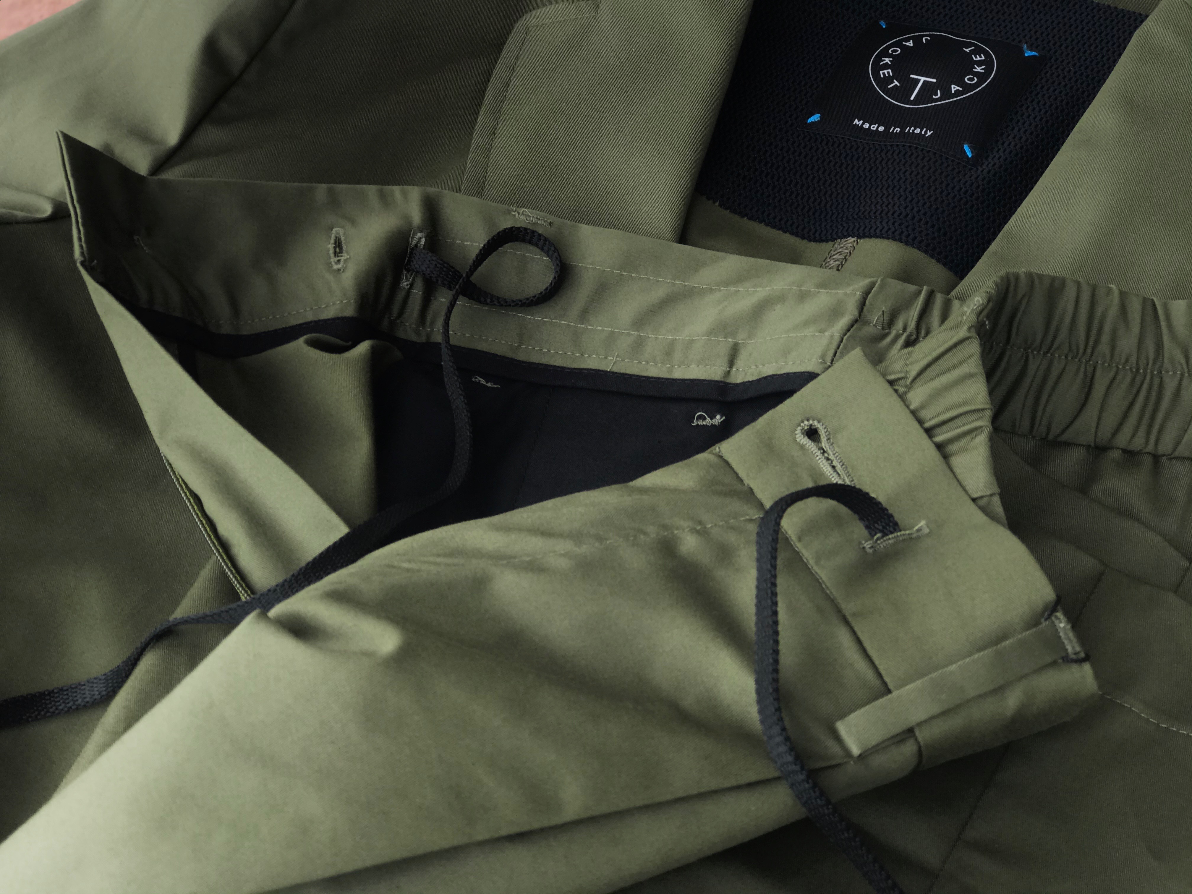 ネイビーはジャケットのみのご案内でしたが、こちらのオリーブグリーンは、別売りのパンツを合わせたセットアップ提案です。