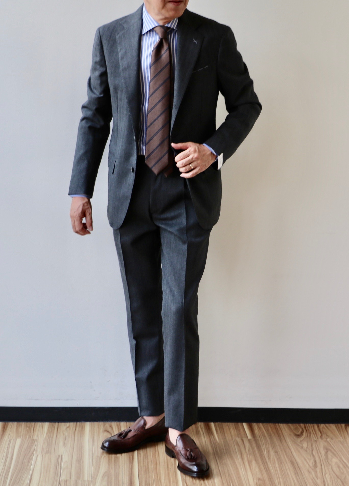 チャコールよりワントーン明るいミディアムグレイのヘリンボーン柄スーツ。展示会に臨む前から、決めていた今最も気分な色柄です。ネイビーやチャコールグレイの無地と同様、流行にも左右されない、常に鮮度のあるスーツとして活躍するはずです。