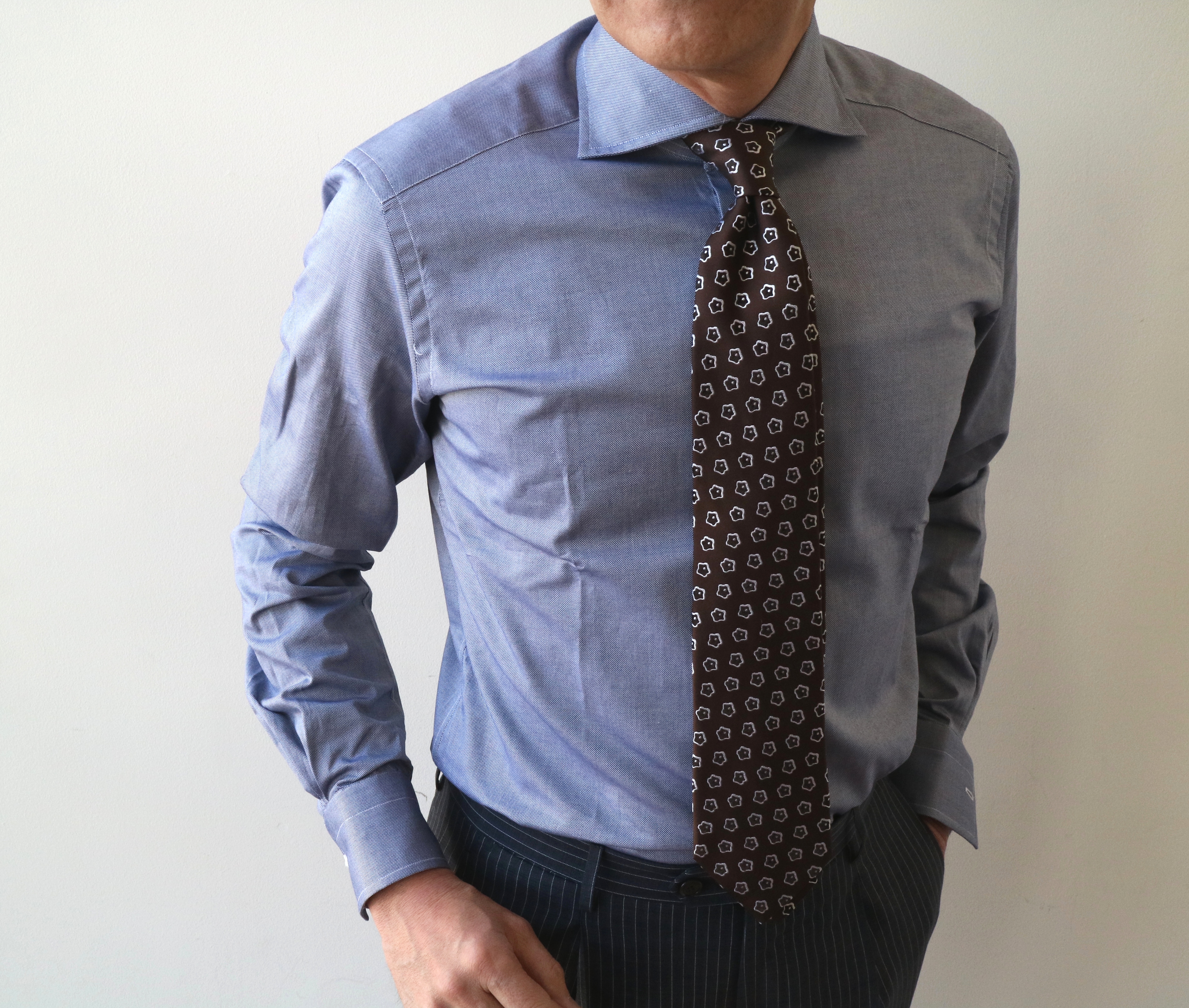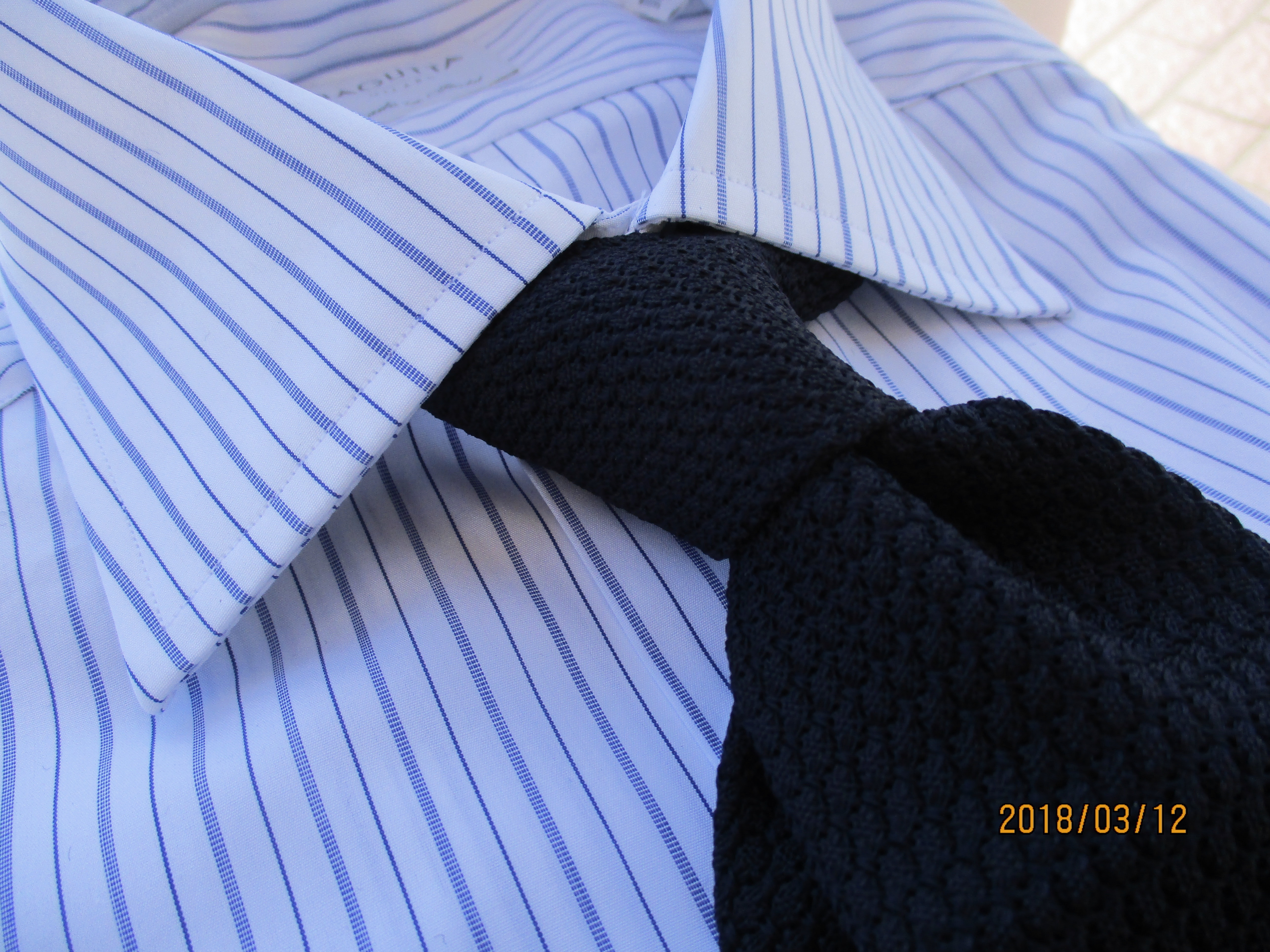 二つの異なる縞が交互に配される、英国柄らしいオルタネートストライプ。生地、色柄に合わせた選んだ襟型も、ワイドよりレギュラーに近いセミワイドです。憧れだったTumbull&Asser(ターンブル&アッサー)。かつて展開を決めながら、大きすぎるサイズ数値で断念した無念さが、ようやく、ここで晴れたような気がします。