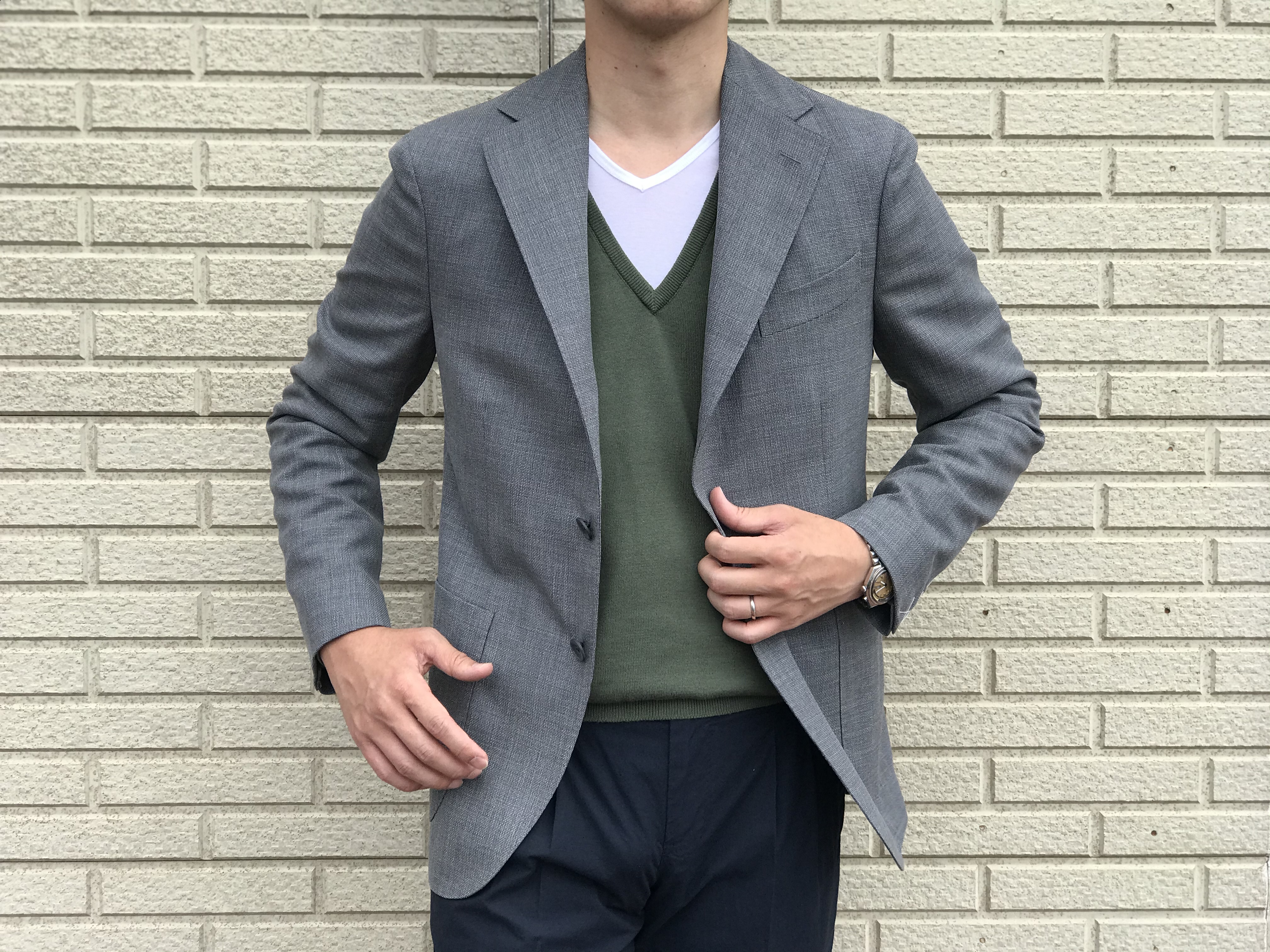 比較的、Vゾーンは深めの5つ釦です。単品でも使いやすいジレですが、予算に余裕があれば、ジャケットに合わせて揃えていただきたい。ツインニットのエレガントさのように、女性の視線を感じるとともに、その目をも楽しませることができる...そんなジレです。