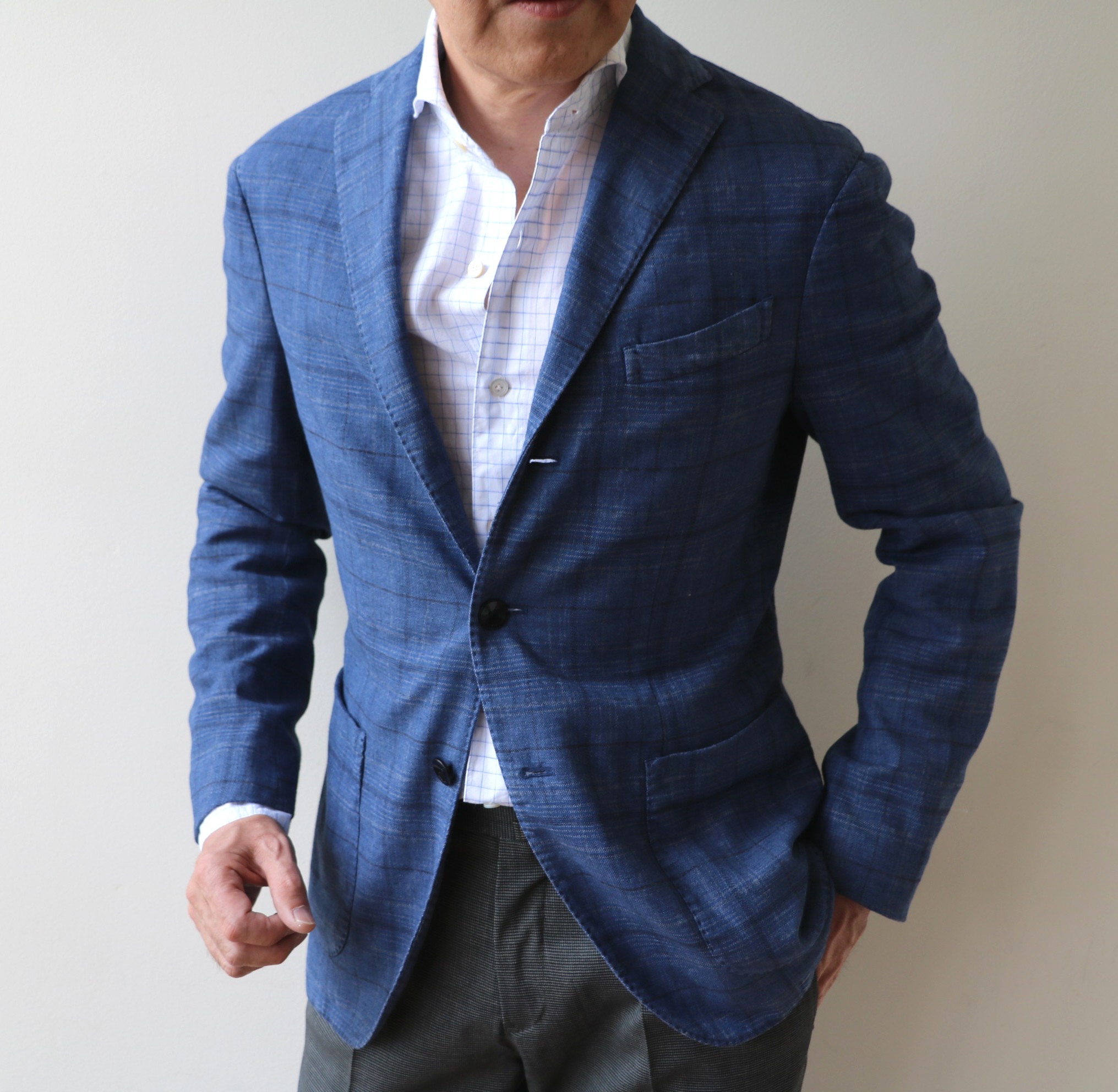 コットン・リネン中心のチェック柄ジャケットです。ブルーの青さを抑えているのが、シルバーグレイの糸とオーバーペンのネイビー。エレガントさを損なわない絶妙な抜け感は、やはり【BOGLIOLI/ボリオリ】ならではのテクニックです。