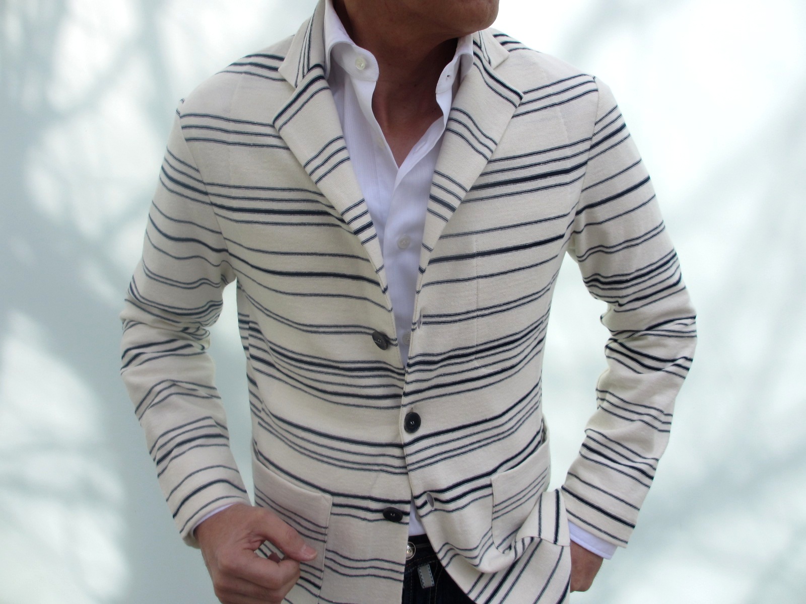 ジーンズにタイドアップは、時々したくなるコーディネートです(前回ご紹介のウインドウペン柄ジャケットもタイドアップすればよかったと後悔しております)。ただジーンズにネクタイをした最初の人は誰なんだろう...なんて、また余計なことを考えていますが、残念ながら、今は調べる時間がありません。展示会でこのジャケットを見た時、カーキ系のチノパンツかジーンズを穿いて、オックスフォードのシャツに黒のニットタイ、そんな姿が浮かんできました。真夏になれば、ピンクやブルーのリネンシャツにショーツなんてコーディネートも素敵です。イメージの膨らむジャケットといえるでしょう。