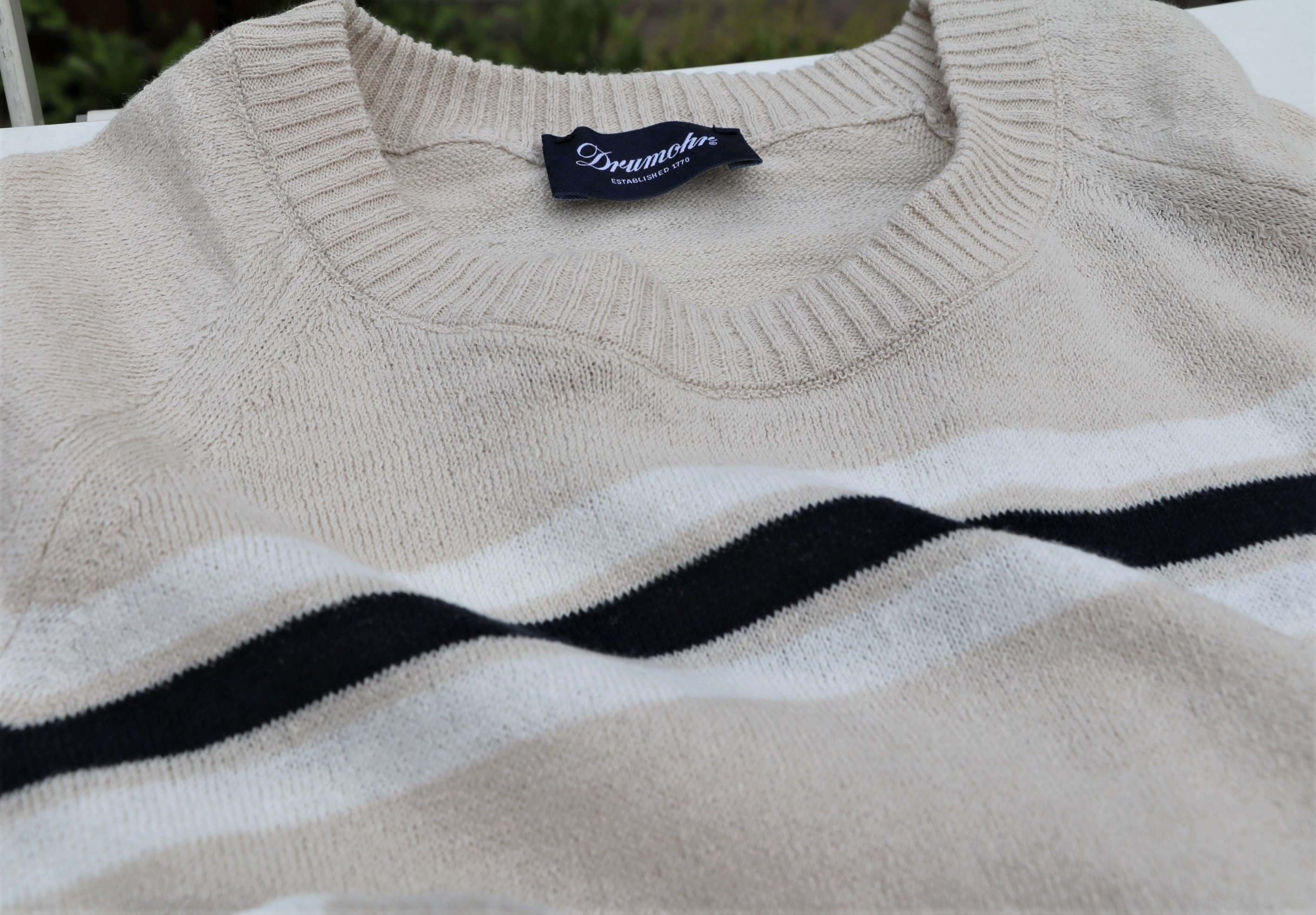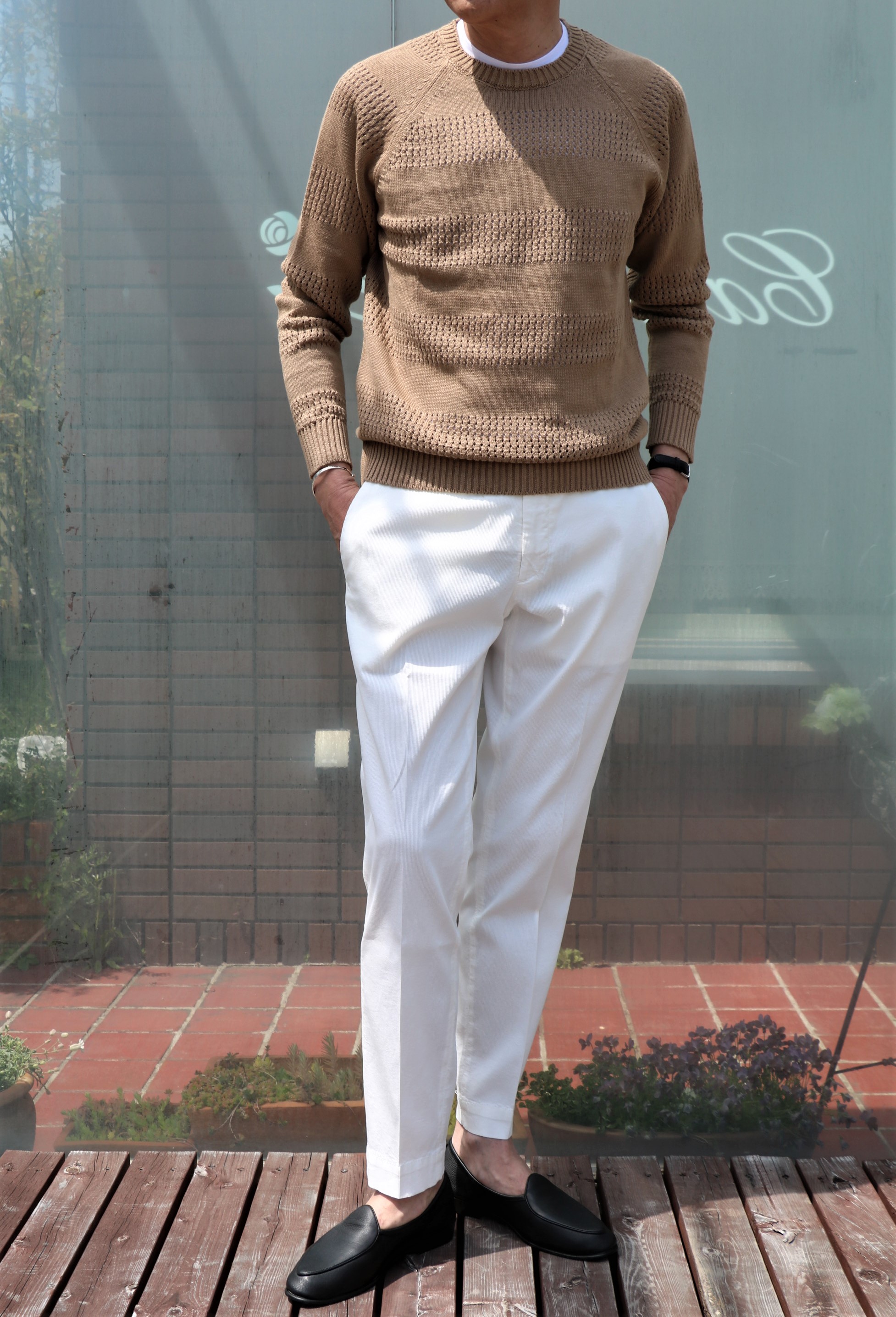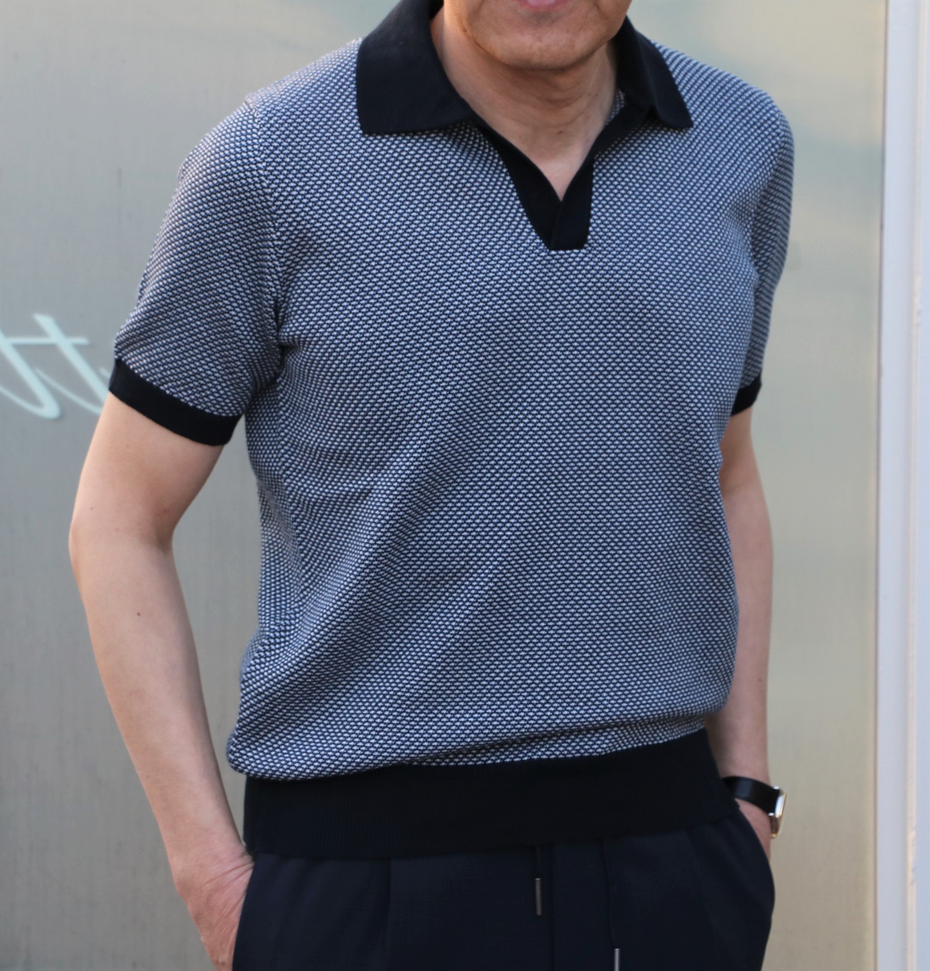 本日のご案内は、【Drumohr/ドルモア】から、昔、流行ったなと思いながら、やや懐かしい柄行のサマーニットです。背景イメージとしては、海のリゾート地。本来なら、短パン。それもホワイトショーツに足元はデッキシューズですが、マリン体験の少ない私。そこまで振り切れませんでした。皆さんで妄想していただけると助かります。