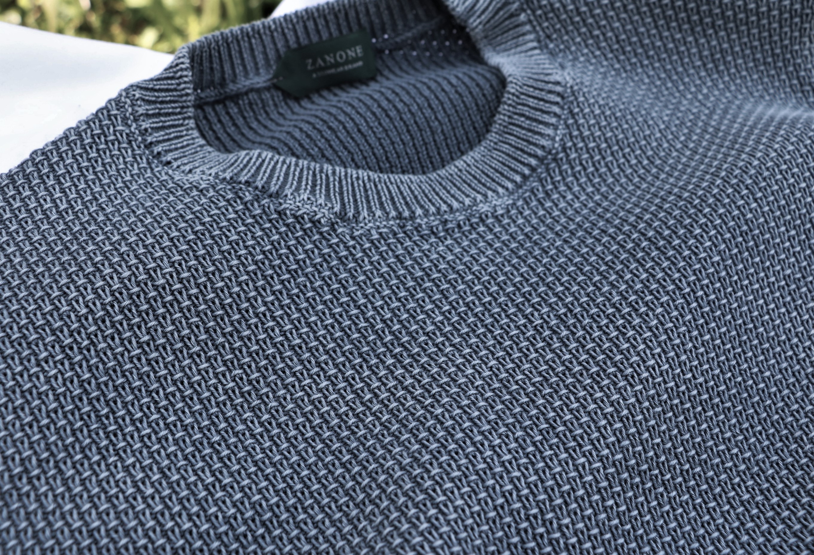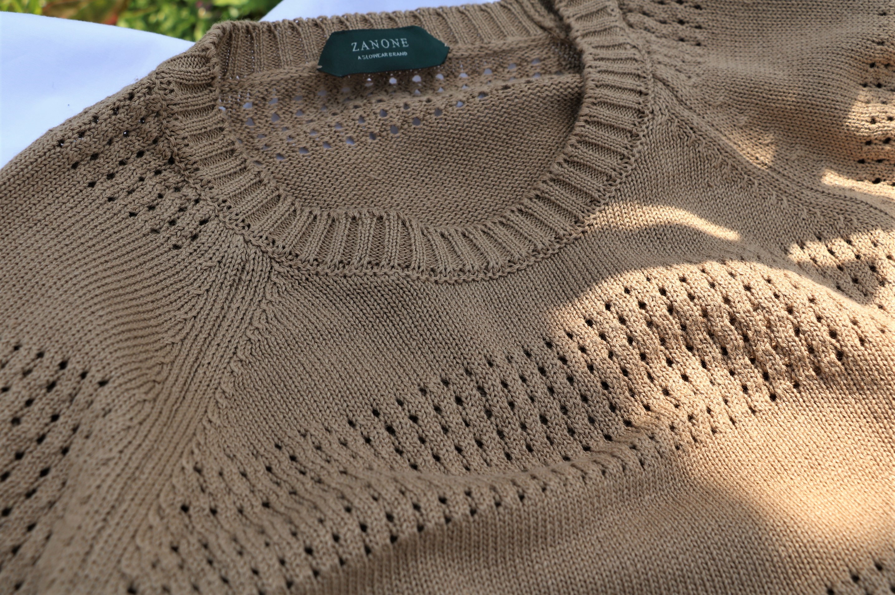 ザノーネの夏の風物詩といえば、ICE COTTON。今季はロングスリーブで、ホワイトとシャワーブルー(勝手に付けた名前です)の2色です。色目は、下の写真を参考にしてください。