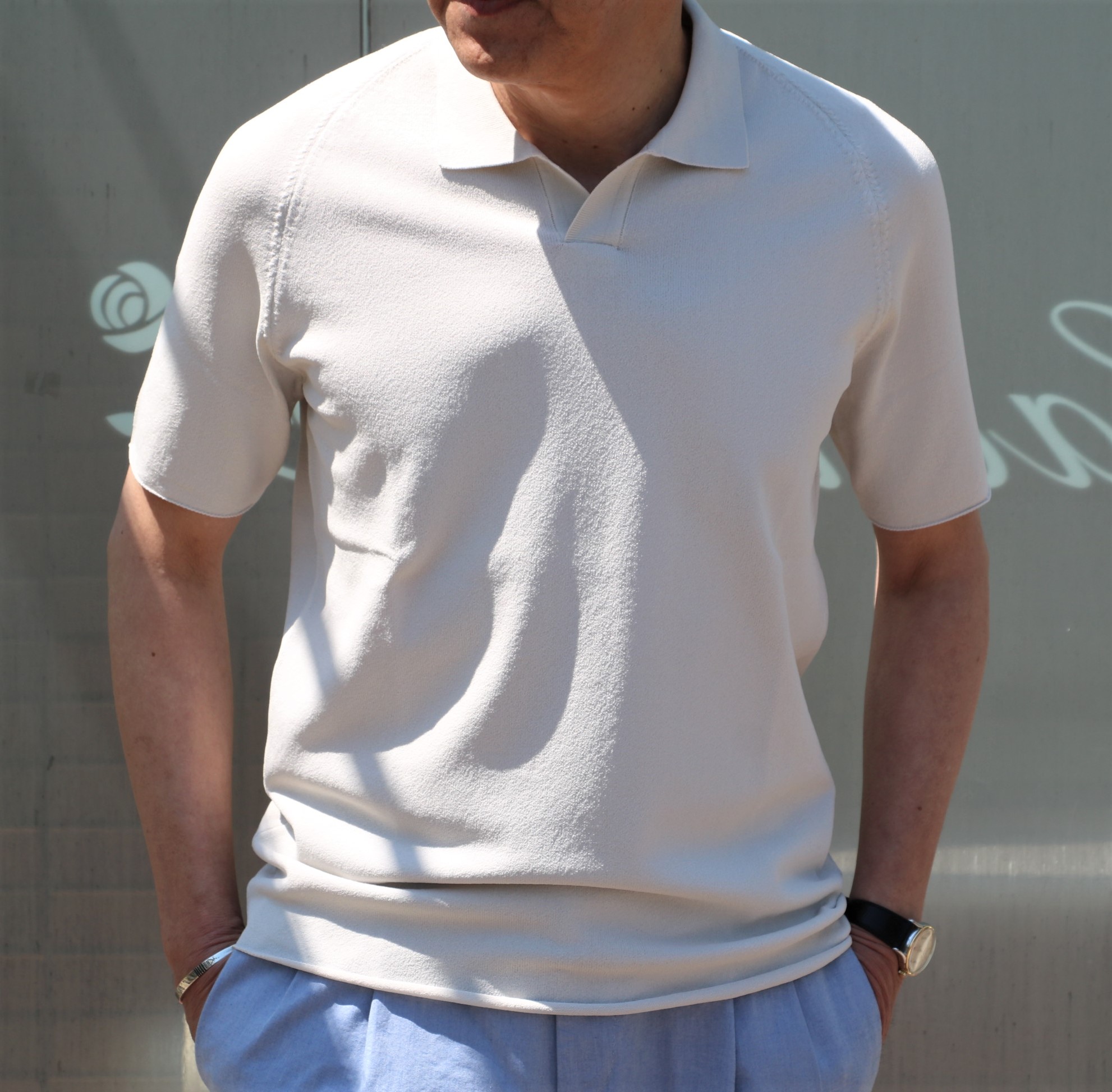 素材は、レーヨン・ポリアミド。レーヨンとは、フランス語の「光」が語源。紙と同じ木材から作られた再生繊維。ポリアミドは、デュポン社が開発したナイロンと同じプラスチック素材です。吸水性が高く、さらっとした肌触りと柔らかなドレープ性が特徴のレーヨン。ただ欠点として、シワになりやすく、水分を含むと収縮しやすく、強度も低下します。その欠点を補うのが、弾力性に優れているポリアミド、いわゆるナイロン。素材としてメインになるよりは、他の素材をサポートし、衣服の性能をアップさせる存在なんですね。最強コンビで作られたポロニット。一度、体感したら、たぶん忘れられなくなってしまう...はずです。