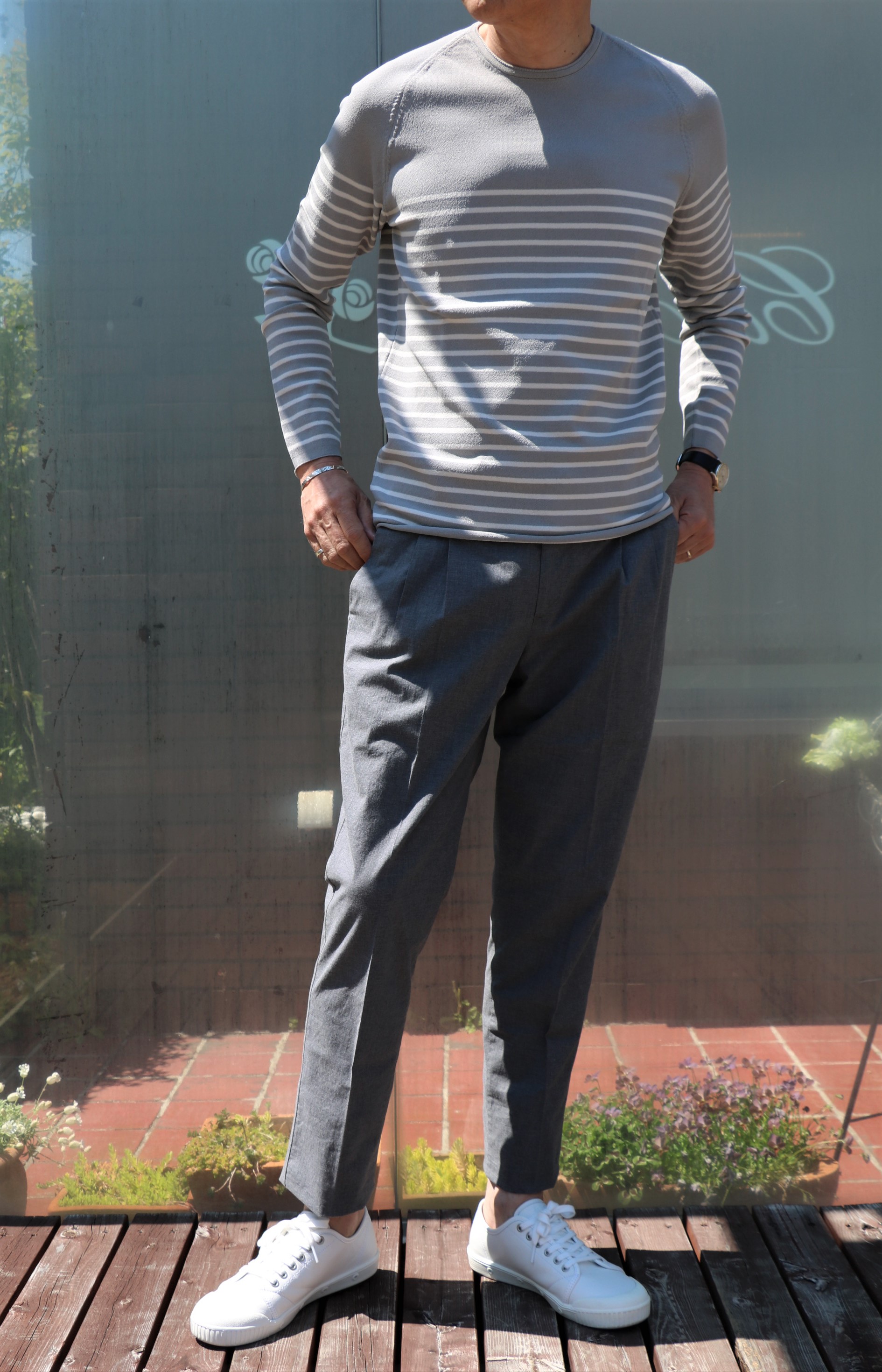 参考までに。ネイビーのボーダーに合わせたパンツも【GTA/ジーティーアー】です。