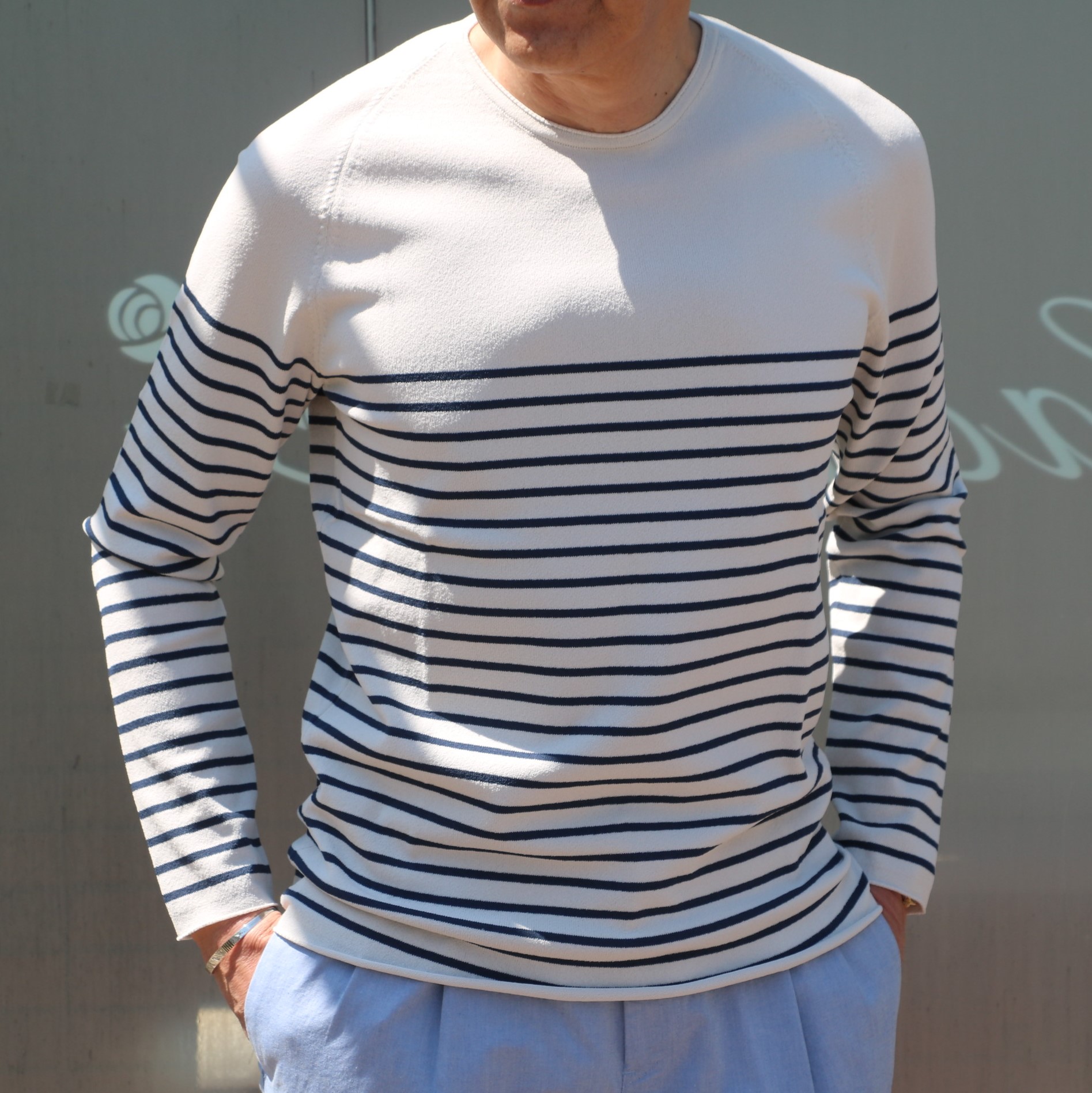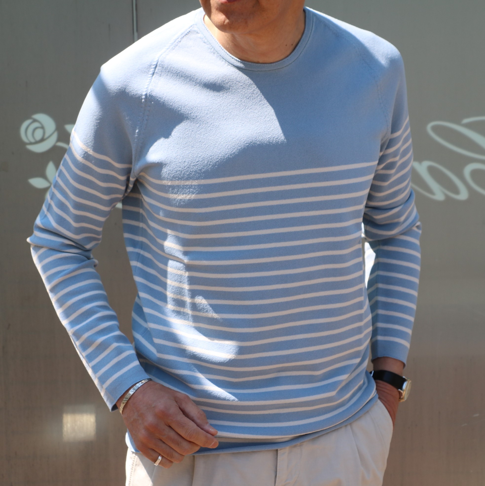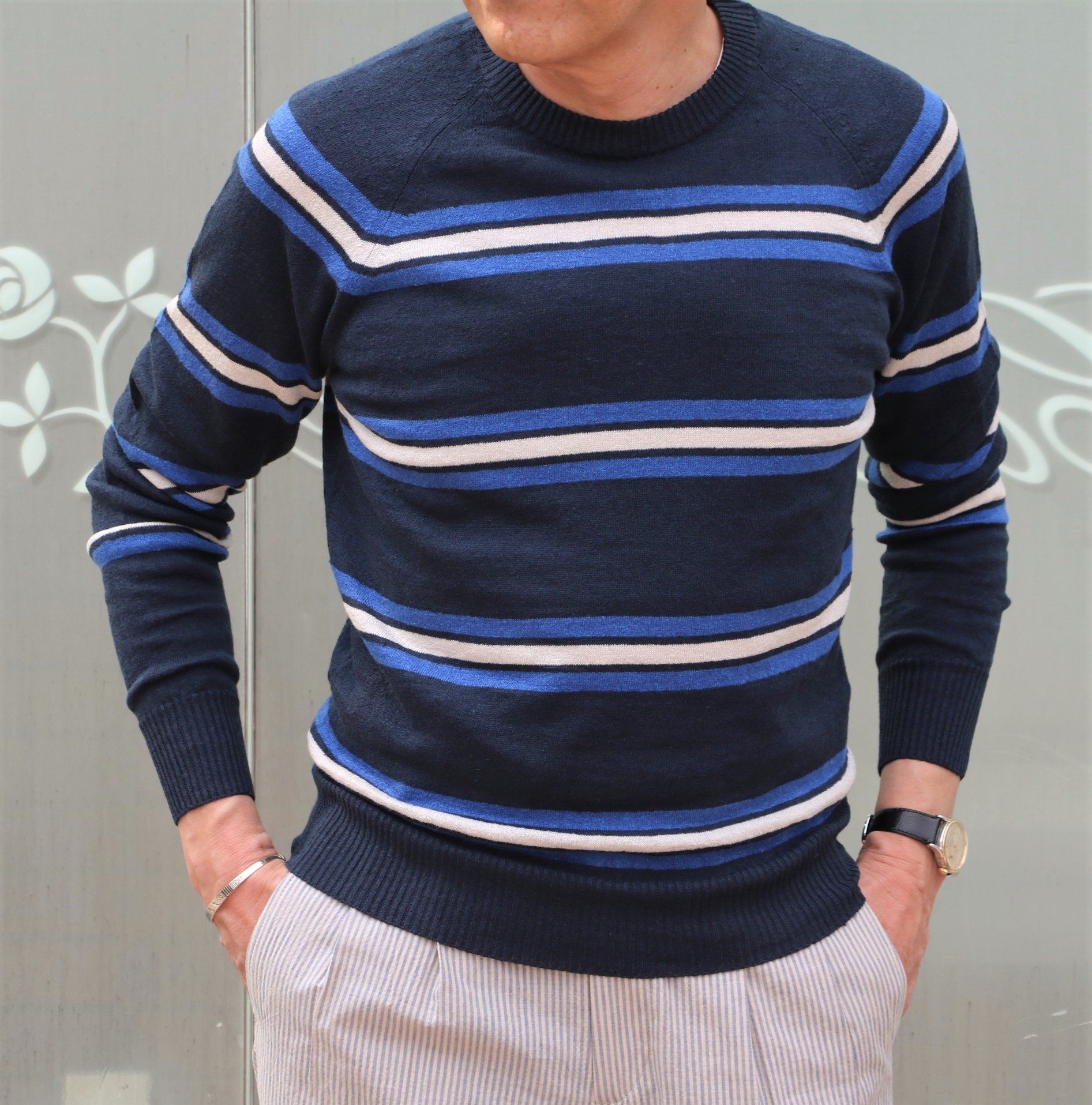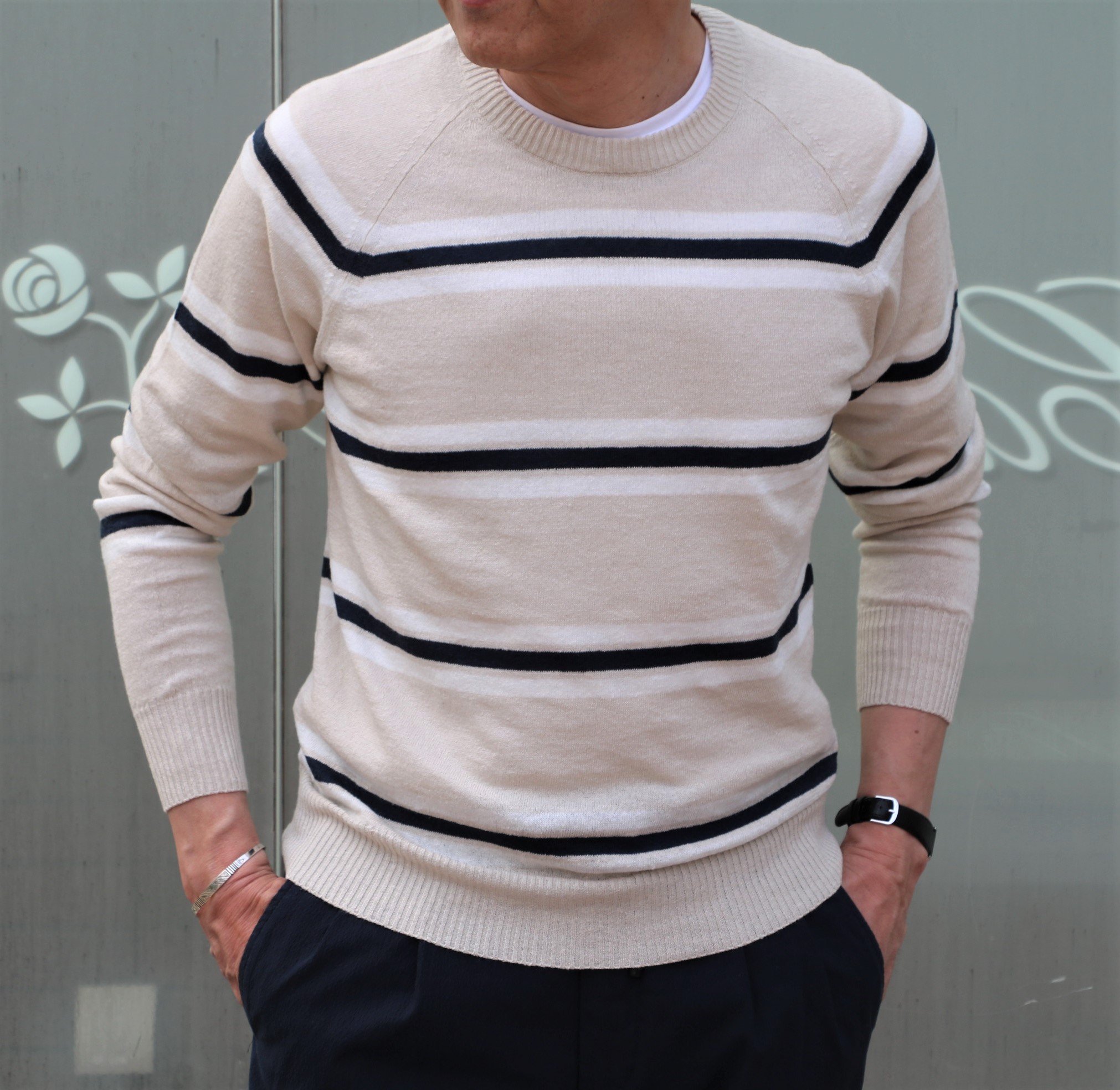 大人が着れるボーダー柄としてセレクトしたロングスリーブのラウンドネックニット。今一つ、人気がないのは、柄行?それとも価格でしょうか。2月24日のブログでタカイがご案内しておりますが、もしかしてモデルが悪かった?いやいや、そんなはずはない。バイイングした私が悪いのでしょう。その責任をとって、再度、ご提案です。素材は、上のポロニットと同じレーヨンとポリアミド。この高級な素材は、もしメゾンブランドであれば、倍以上、いや、もっとするはずです。