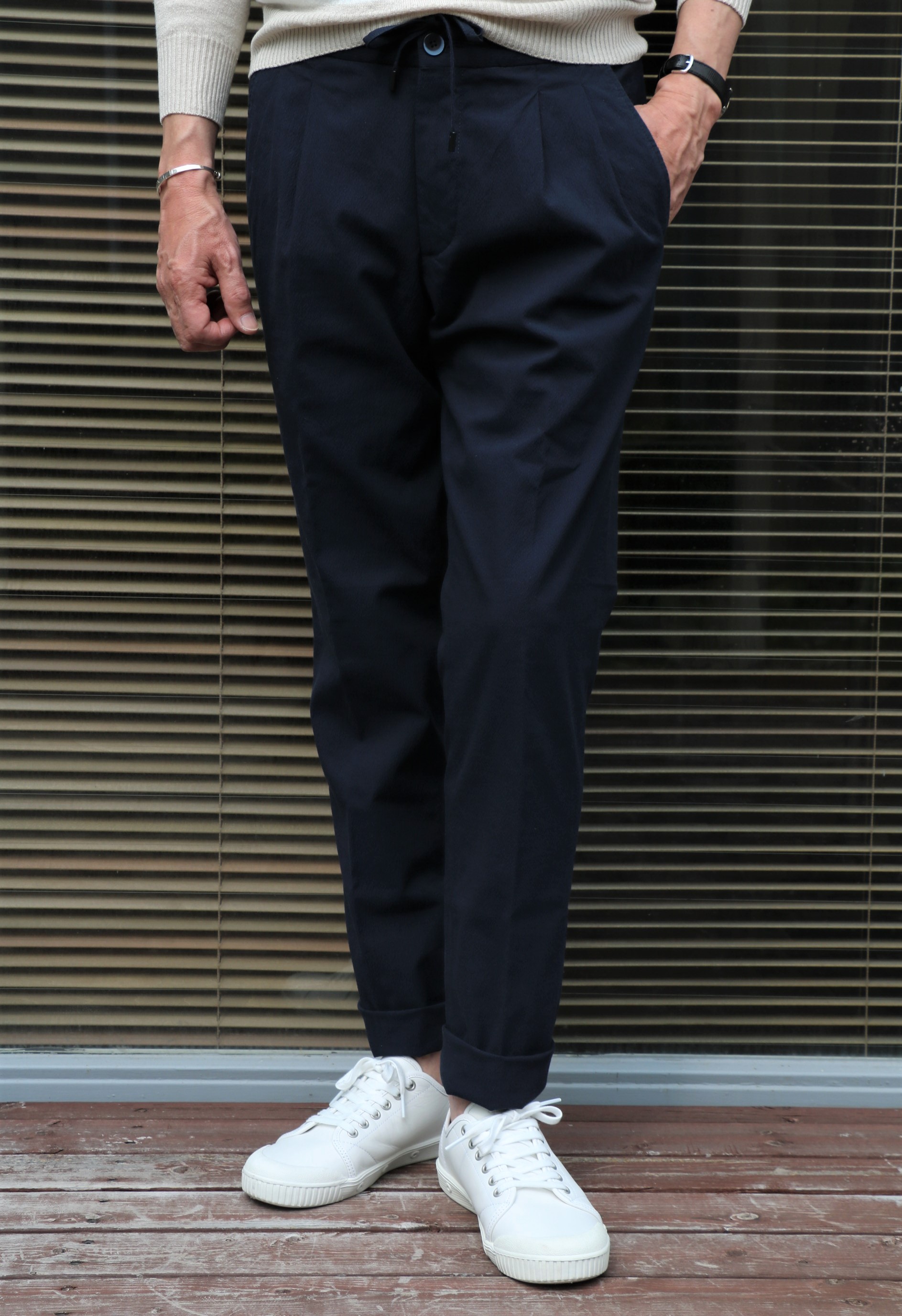 昨日ご案内の立ち襟カーディガン「CHIOTO」に、そしてドライコットンのVネックカーディガンに合わせていたのが、こちら【INCOTEX/インコテックス】のドローコード付きシャーリングパンツ「1AG064」モデル。欲張りにもウール・リネン・コットン・ポリウレタン混紡と、いいとこどりのイージーパンツです。朝陽を浴びた砂浜のような柔らかなライトベージュは、ドライな手触りです。
