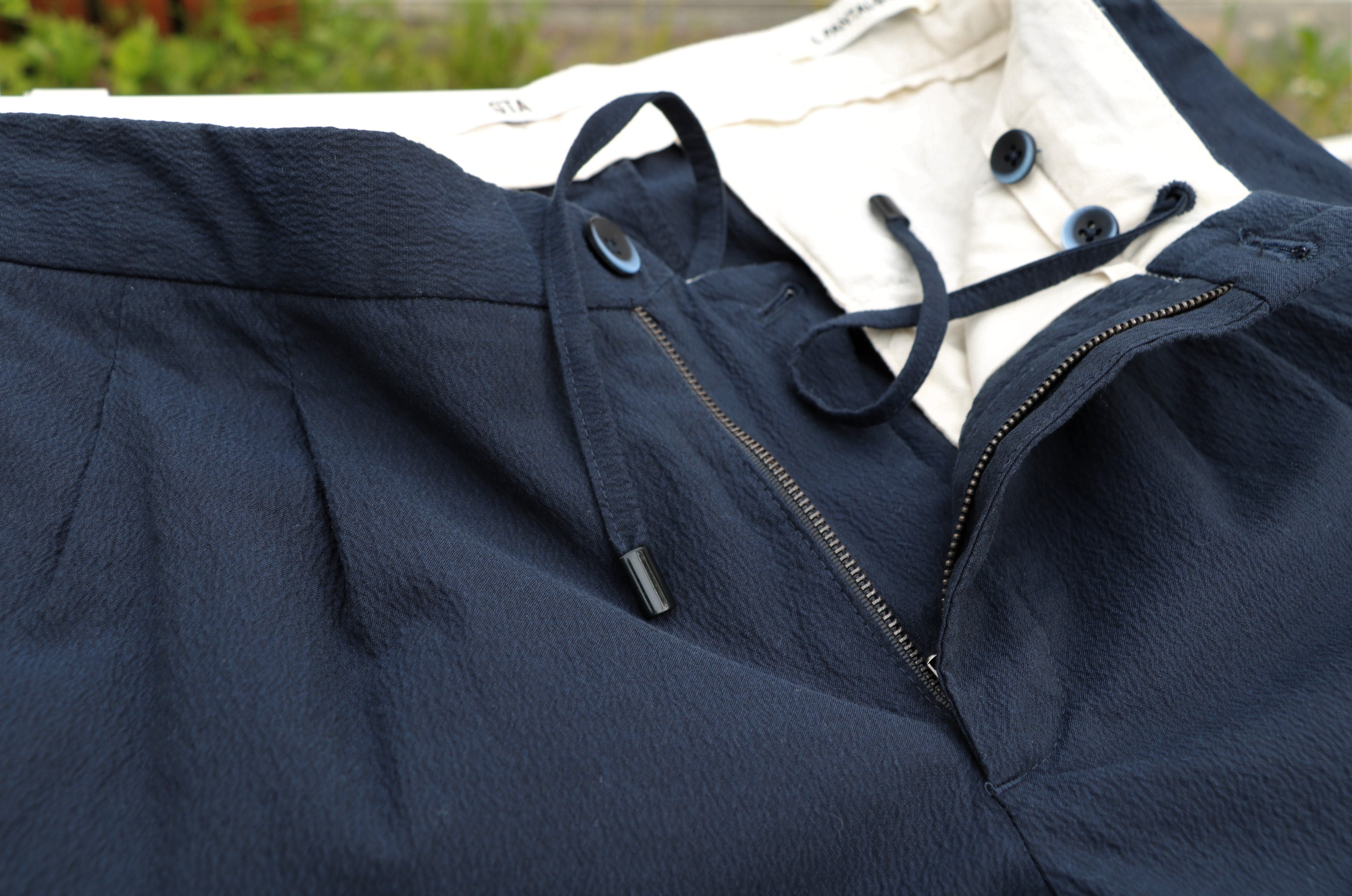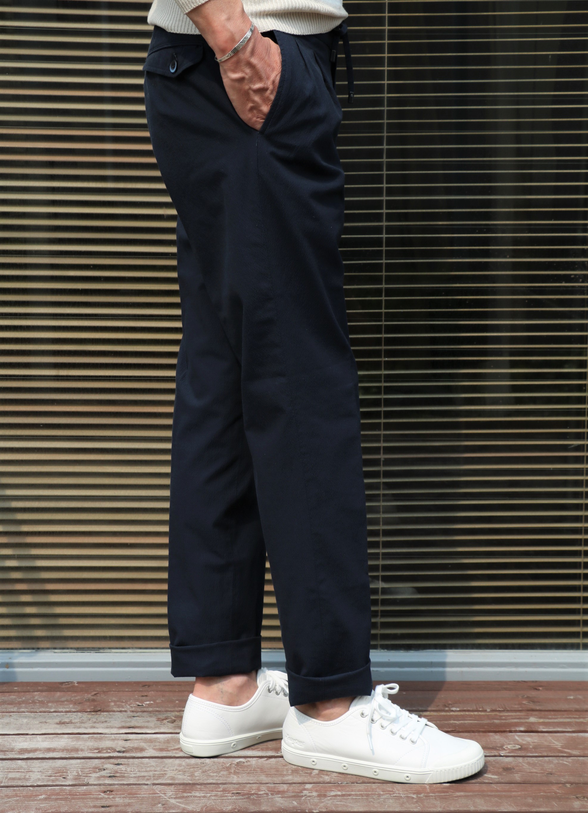 ベージュのボーダーに合わせたのは、【GTA/ジーティーアー】のドローコード付きシャーリングパンツ。シアサッカーのストレッチパンツは、ラフだけど端正な顔つきです。美脚、美尻、足長効果抜群のシルエットと、極上の穿き心地に定評があり、10年ほど前、「872 CARGO」のモデル名で爆発的な人気を博したカーゴパンツ。「ドレスカーゴ」という新たなカテゴリーを確立したことでも有名です。