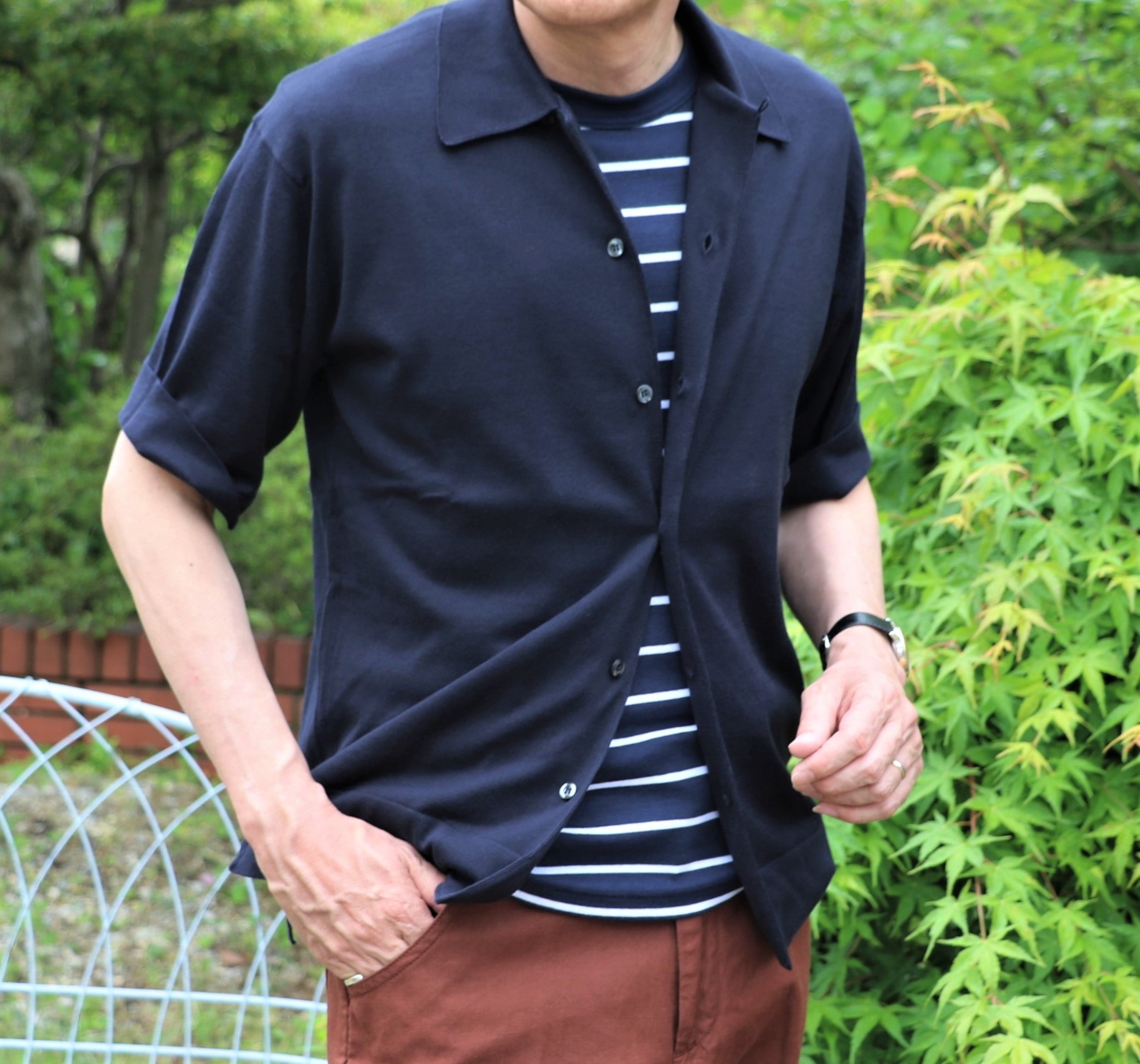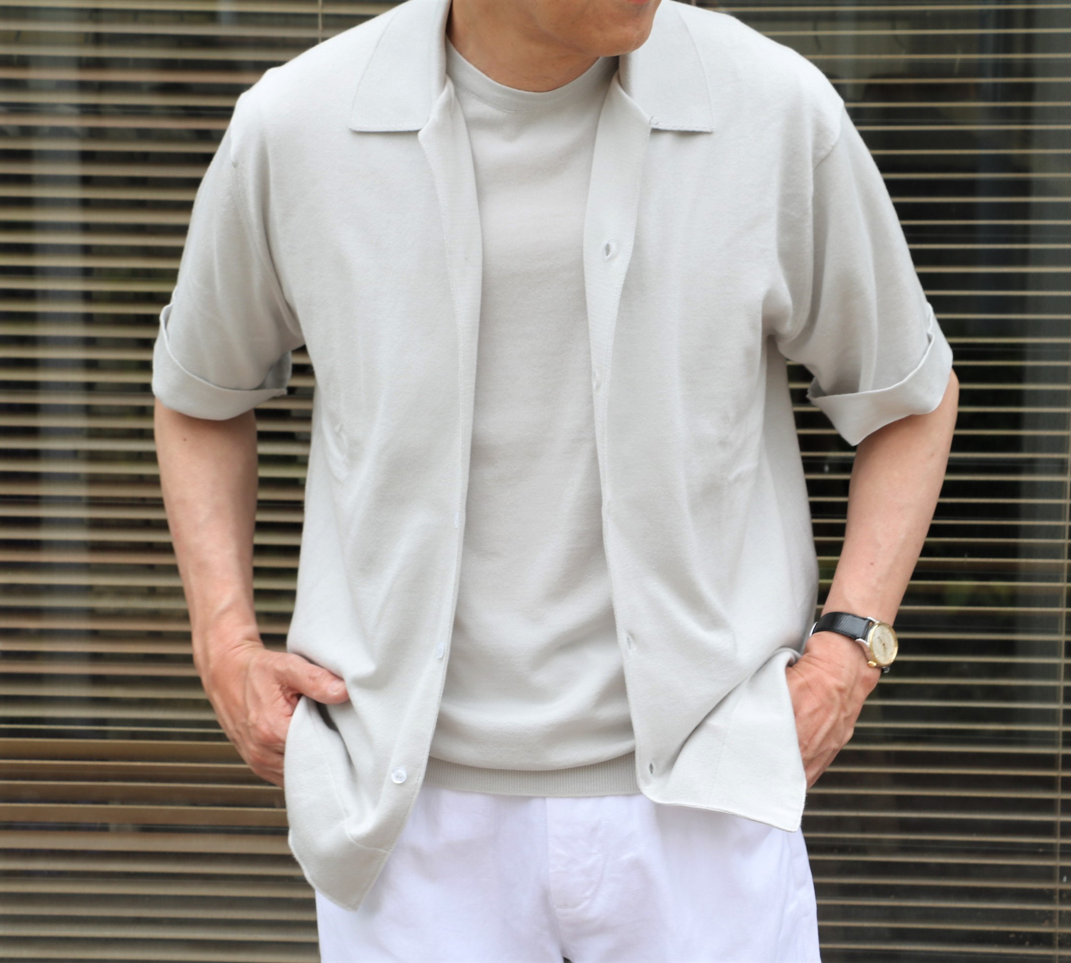 ショートスリーブのニットは、シャツのように一枚で着ることもできる、シャツ型のカーディガンです。