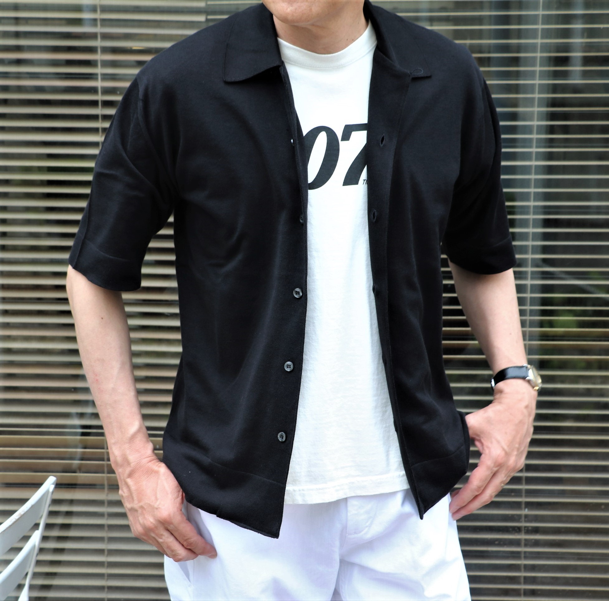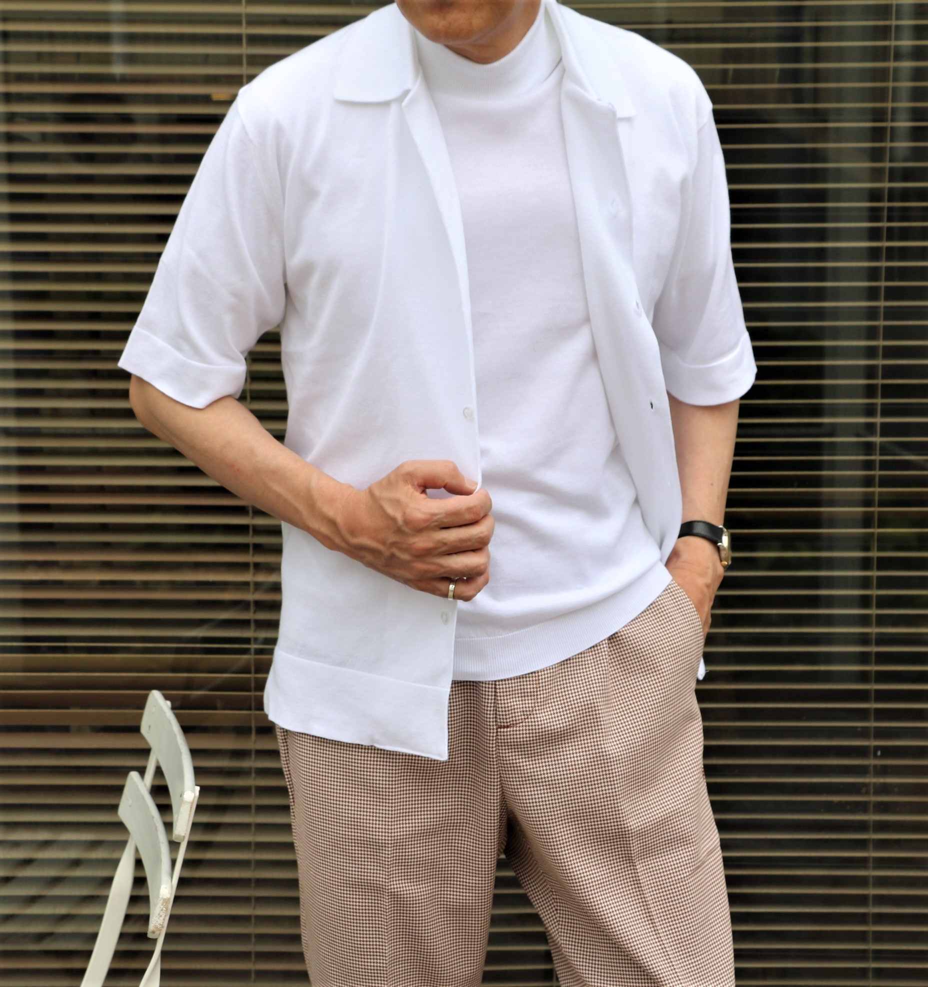 でも、やっぱり装うのは好き。新しい服に身を包むと、いきなりテンションが上がります。写真に写った顔も、どことなくにこやかです。本日、デビューしたのは、【JOHN SMEDLEY/ジョン スメドレー】のツインニット。クルーネックカーディガンとマスヤマも嵌っている半袖のモックネックニットを重ね着しております。ニュークラシックをテーマに、今季、大幅に変更されたコレクション。伝統と実績のあるブランドだけに、変わらないことの凄さを認めながらも、新たな挑戦に敬意を払いたいものです。詳しくは、こちらのブログとYou Tube「SUGURU STORY by gloryguy」第13弾で特集をしております。ぜひ、ご覧ください。