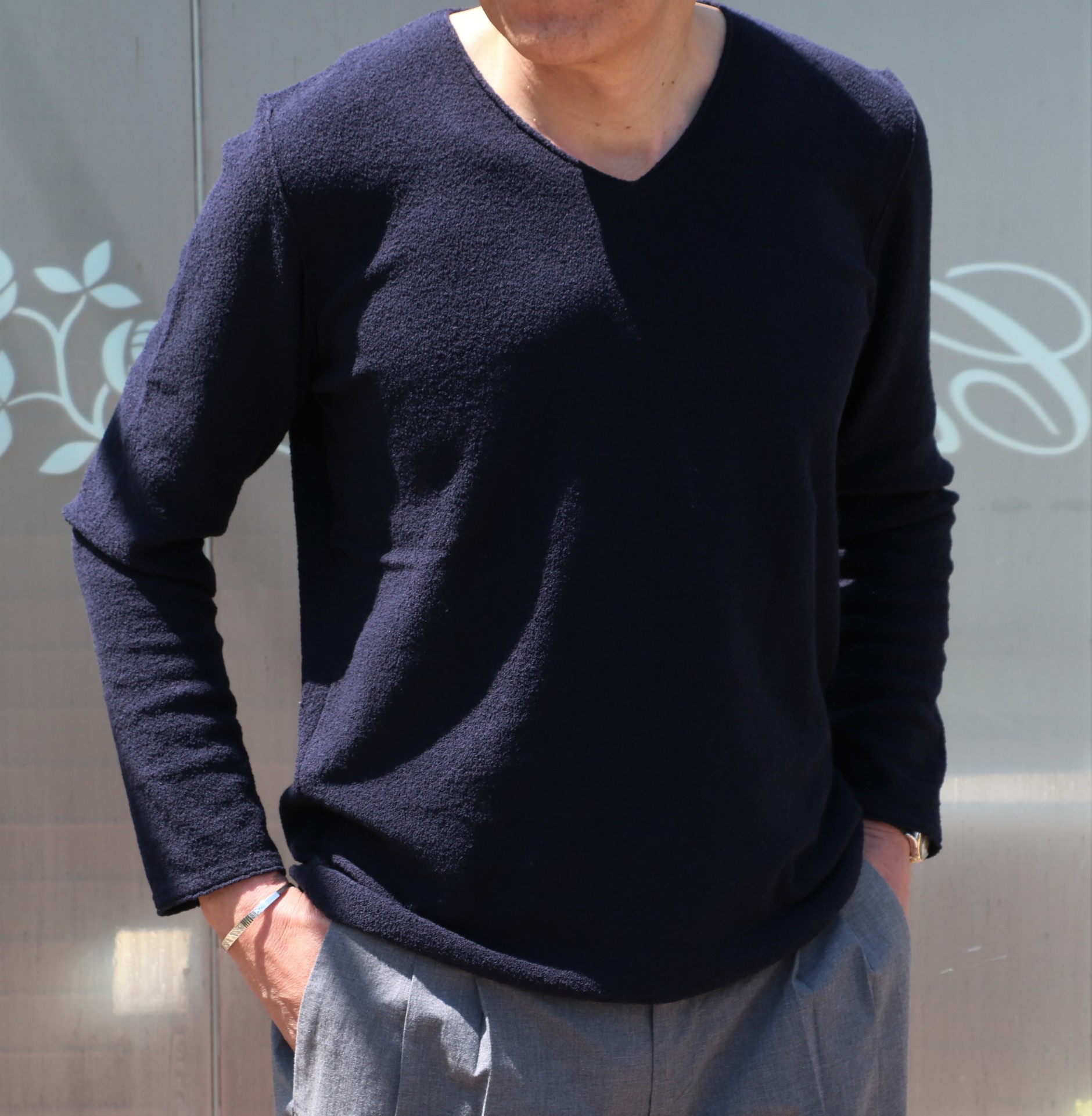 シンプルなVネックのロングスリーブ。ここで筆、いや手が止まったのは、カットソーというべきか、ニットというべきか。デザインはカットソー、でも膨らみ感はニット。その前に知らなければいけないことは、Tシャツもニットだということです。ニットとカットソーの使い分けは、その縫製方法。カットソーとは、カット&ソーイングの略。切って、縫い合わせることですが、ニットは洋服のパーツの形を編みながら、そのままはぎ合せた作り方をします。ただ、一般的に言うTシャツなどのカットソーと区別するために、ニットと呼ぶことにします。