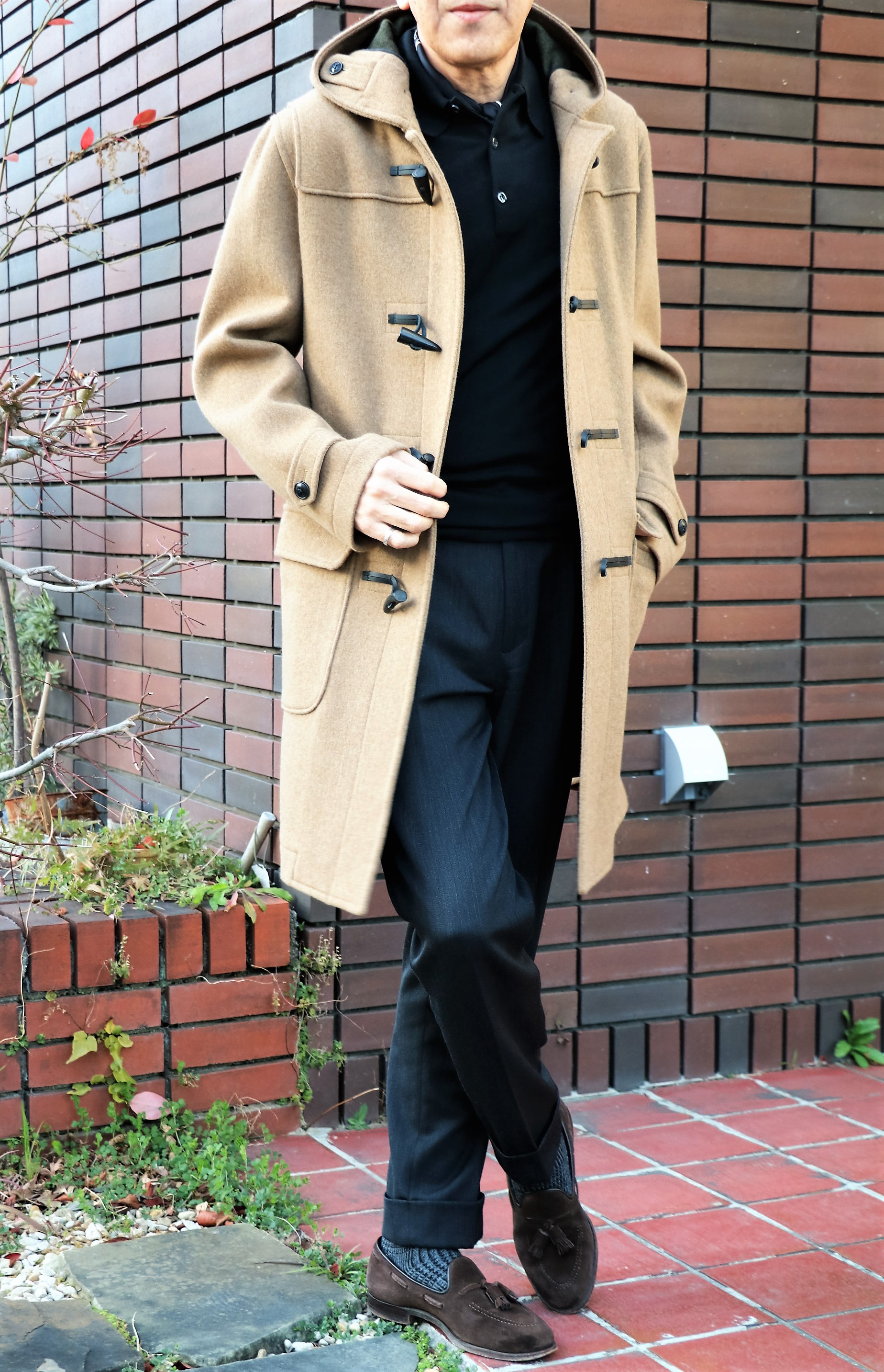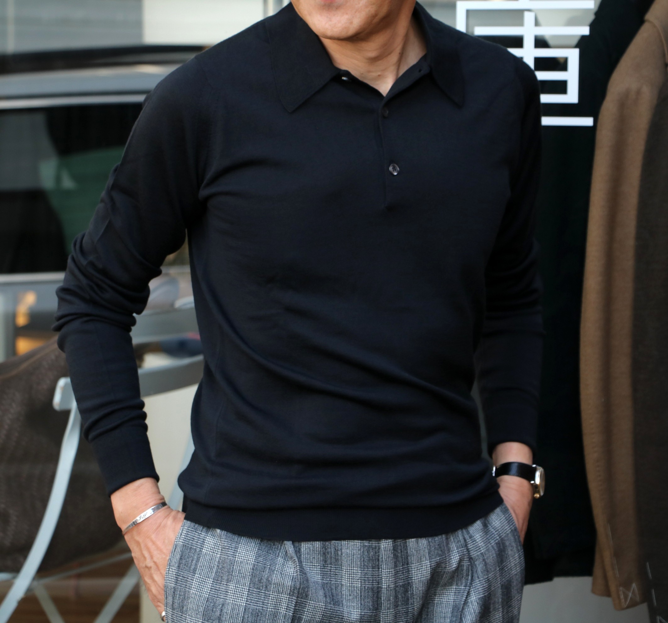 本日の出で立ちですが、ダッフルコートだけは購入検討中。注目していただきたいのは、中に着ているポロニット。JOHN SMEDLEY(ジョンスメドレー)のものですが、展示会でも一押ししていたモデルです。