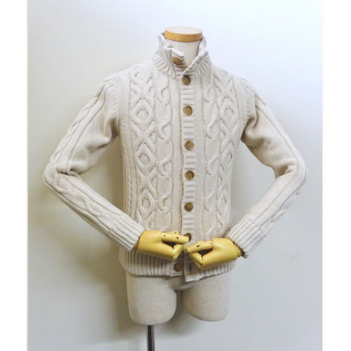 続いてはもニット。ジャケット感覚のZANONEに対し、ブルゾン感覚で羽織るSettefili Cashmereのケーブル編み立ち襟カーディガンです。顔映りに悩むナグラにとって、前回提案したジャケット着てから、映える(ばえる)明るい色やデザインは気になるようです。