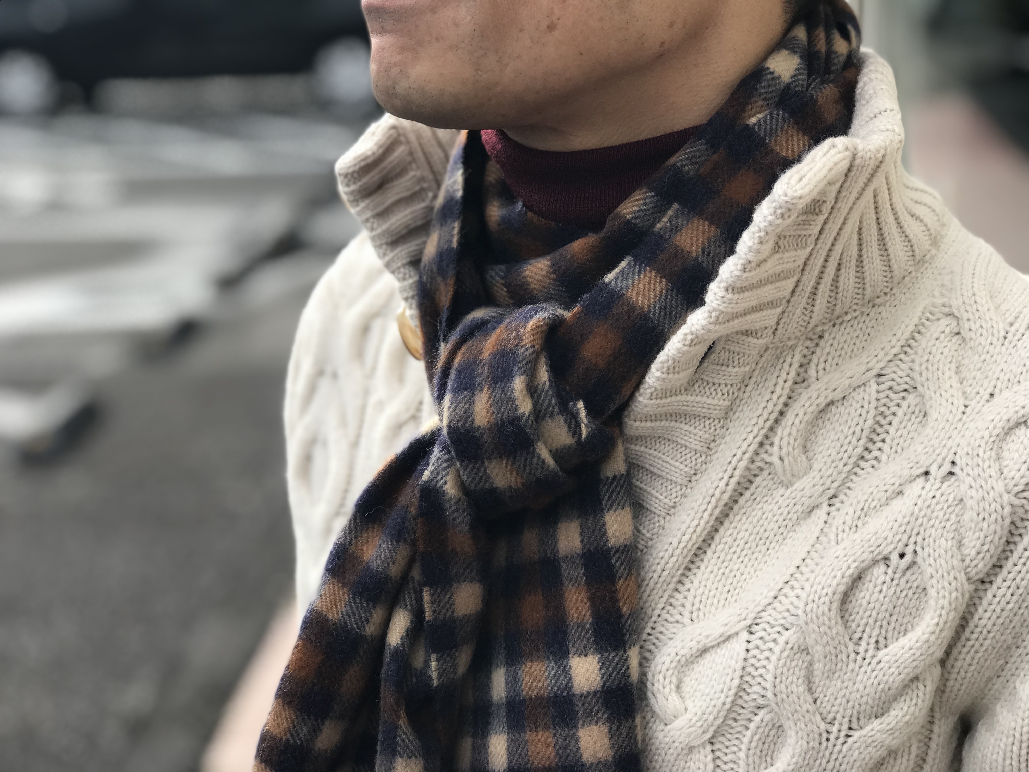 インナーからチラッと覗くのは、FILIPPO DE LAURENTIISのボルドータートルネック。首に巻いたのは、Joshua Ellisのマルチカラーマフラー。共に、暗くなりがちな冬の顔映りを明るくする、映えアイテムです。