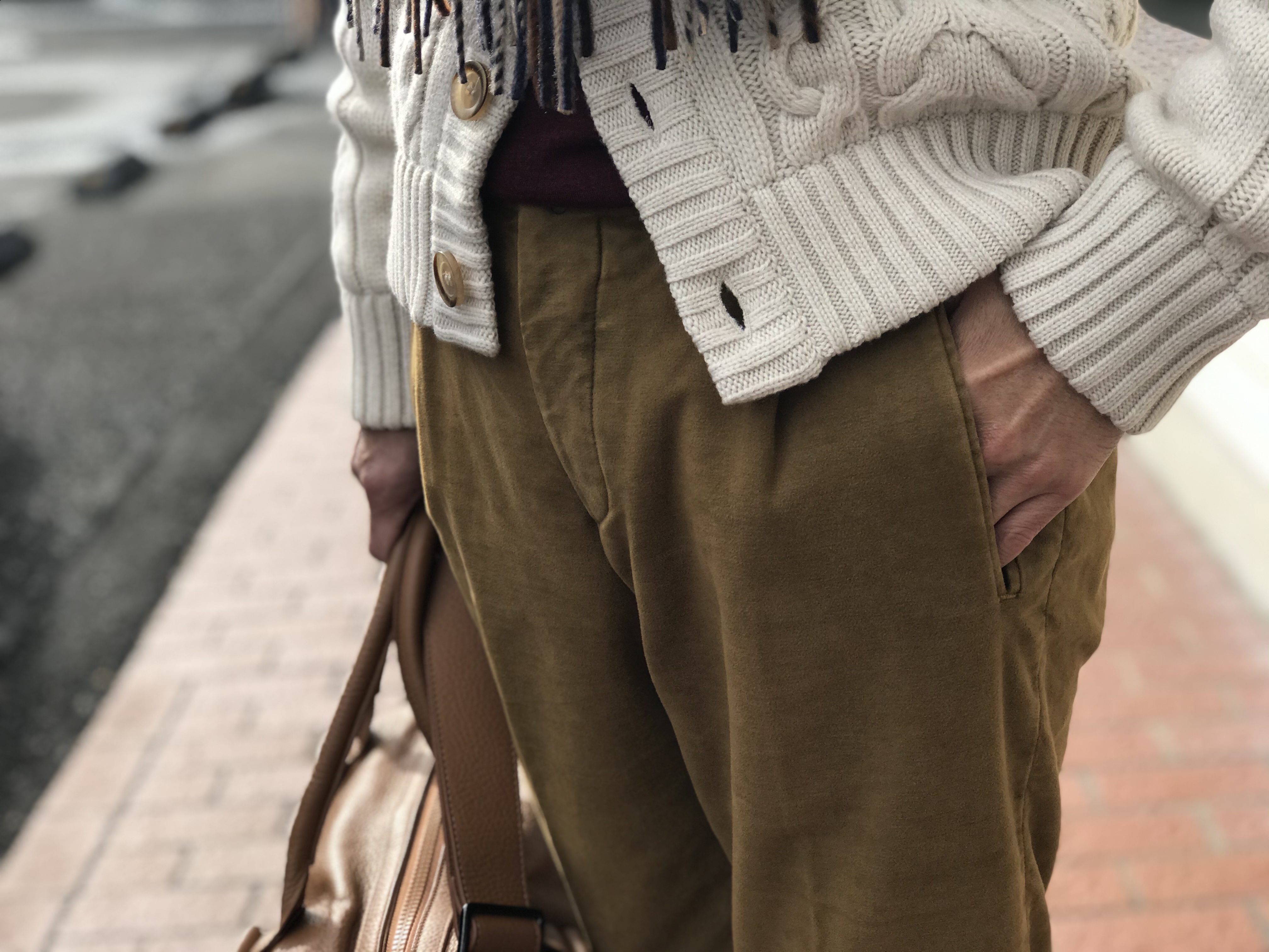 パンツはINCOTEXのモールスキンパンツ。ここでは色合いを大切に、全体の印象をゴチャゴチャさせないように、同色系でまとめました。また、ニットの風合いにモールスキンの質感も馴染ませています。
