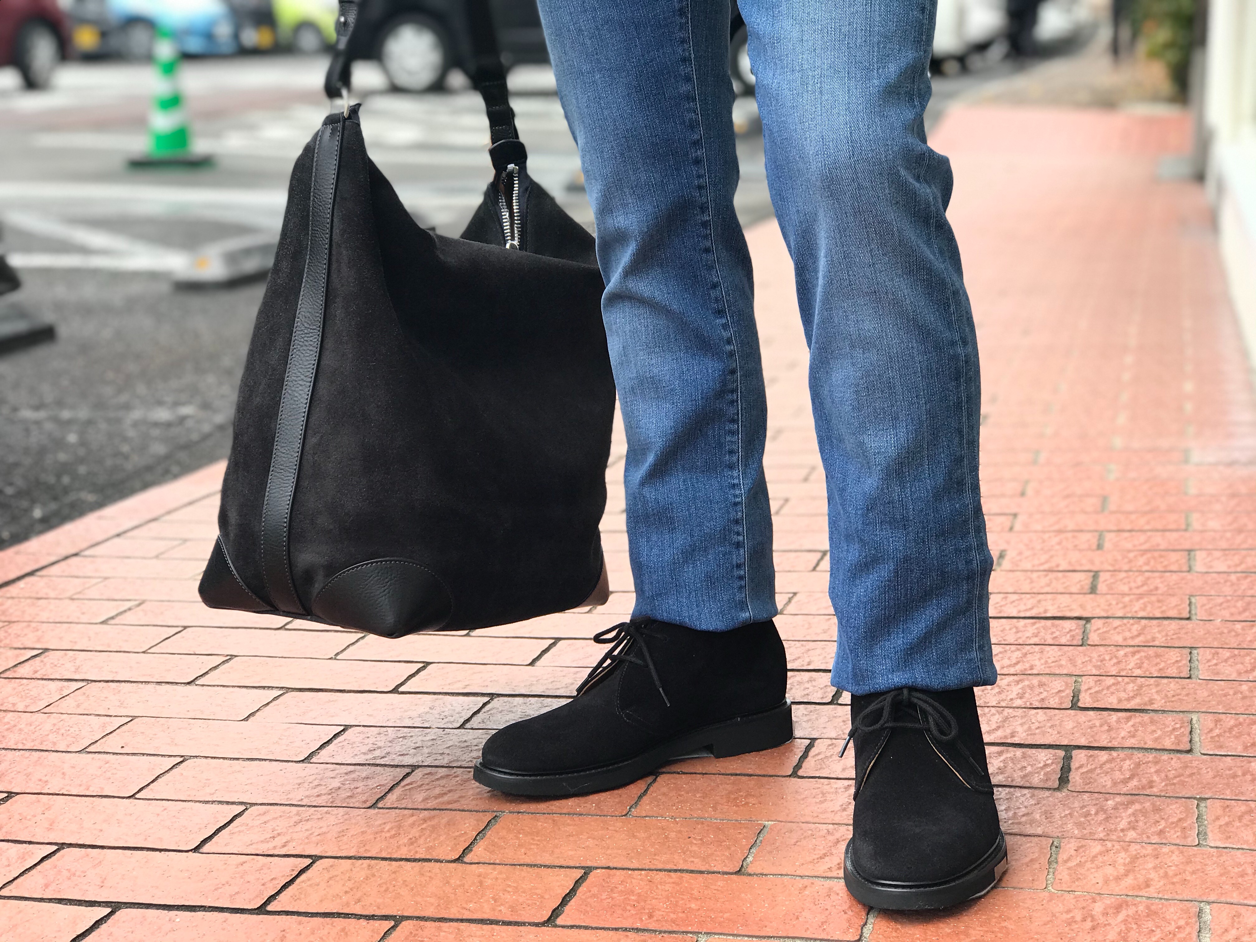 Daniel&BobのワンショルダーバッグとDOUCAL'Sのチャッカブーツは、共にブラックスエードです。