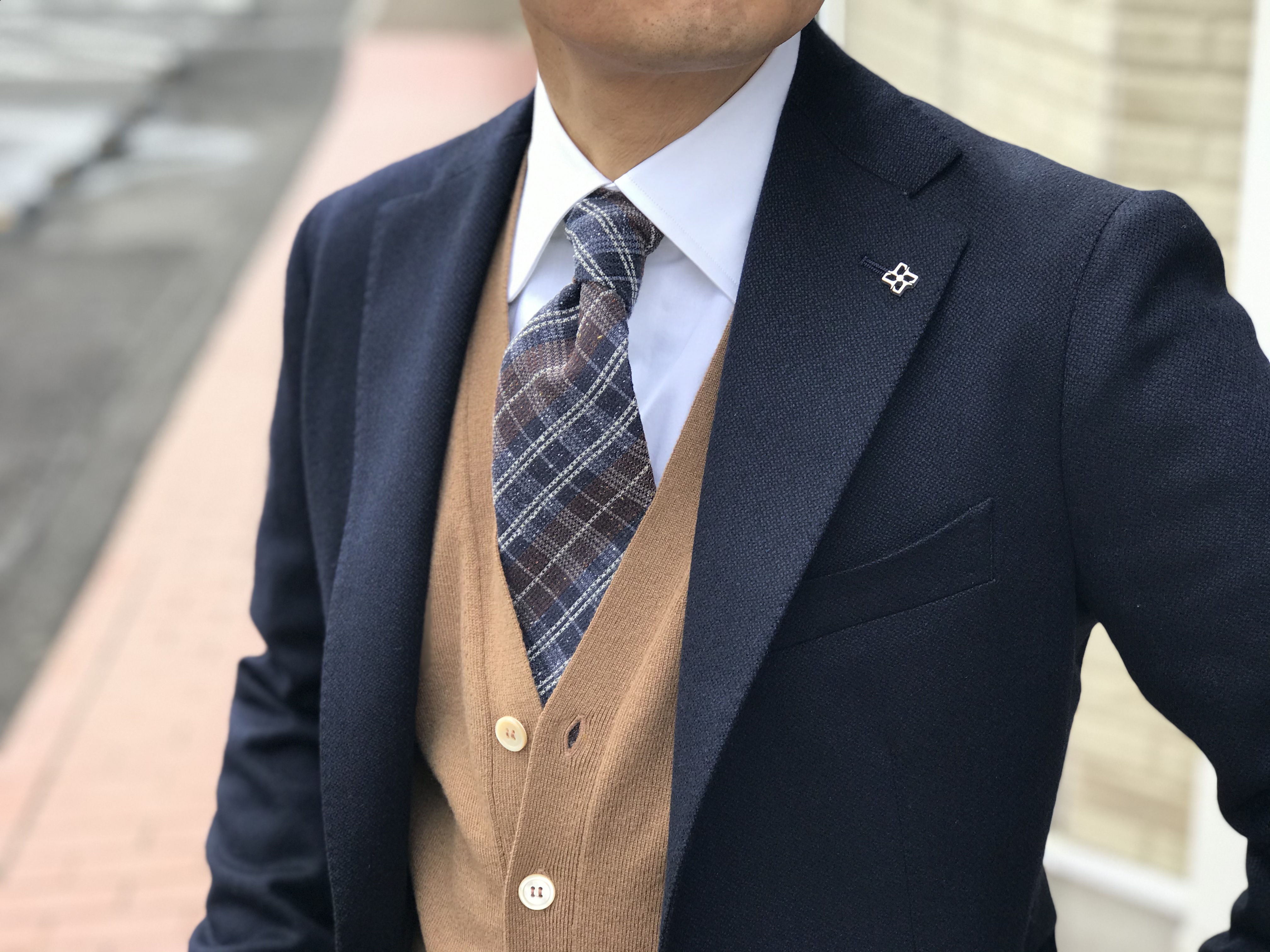 コーディネートしたのは、TAGLIATOREのメタル釦ジャケットとLUIGI BORRELLIのチェックタイ。トラッドなスタイリングが今の気分です。