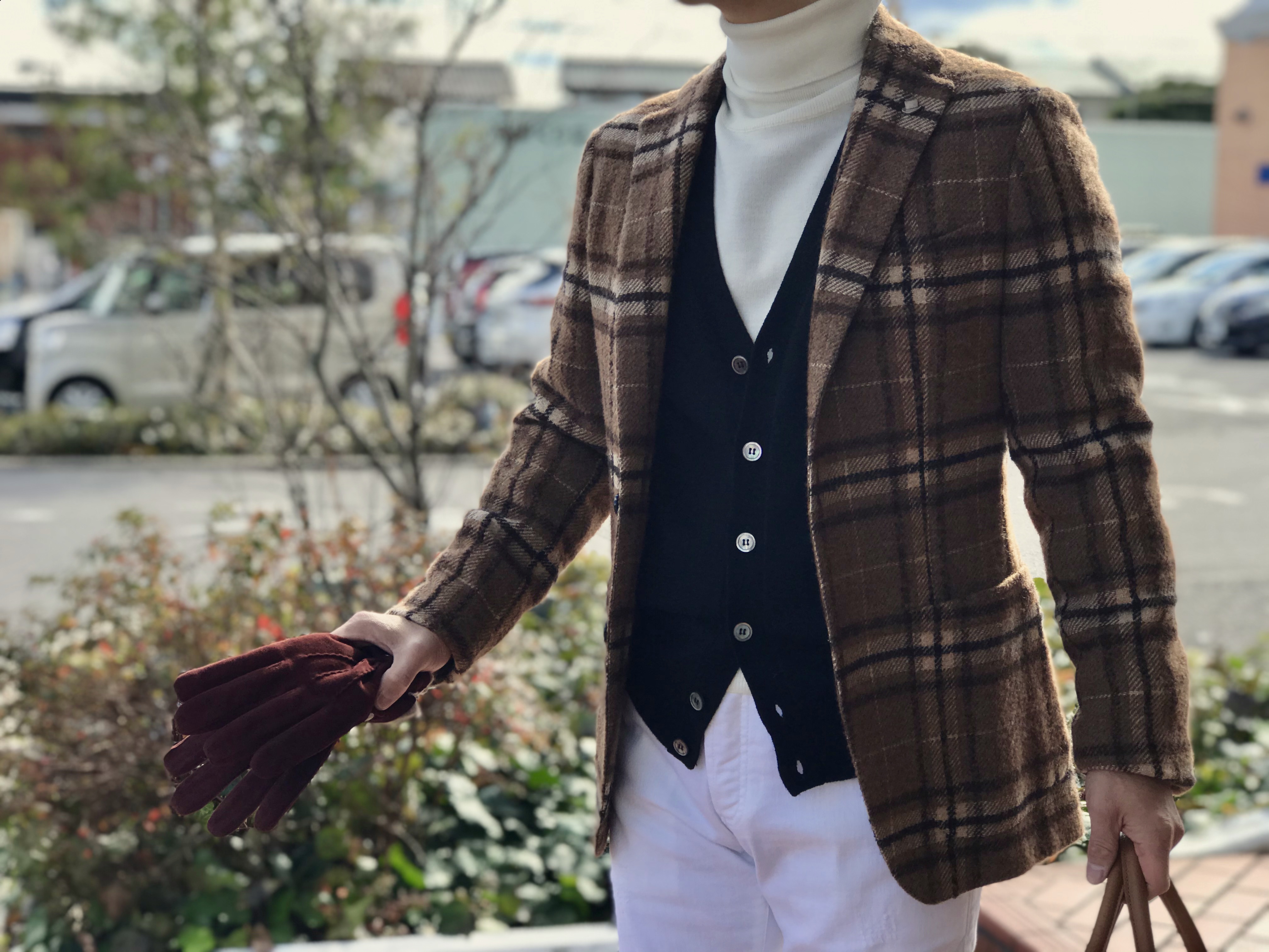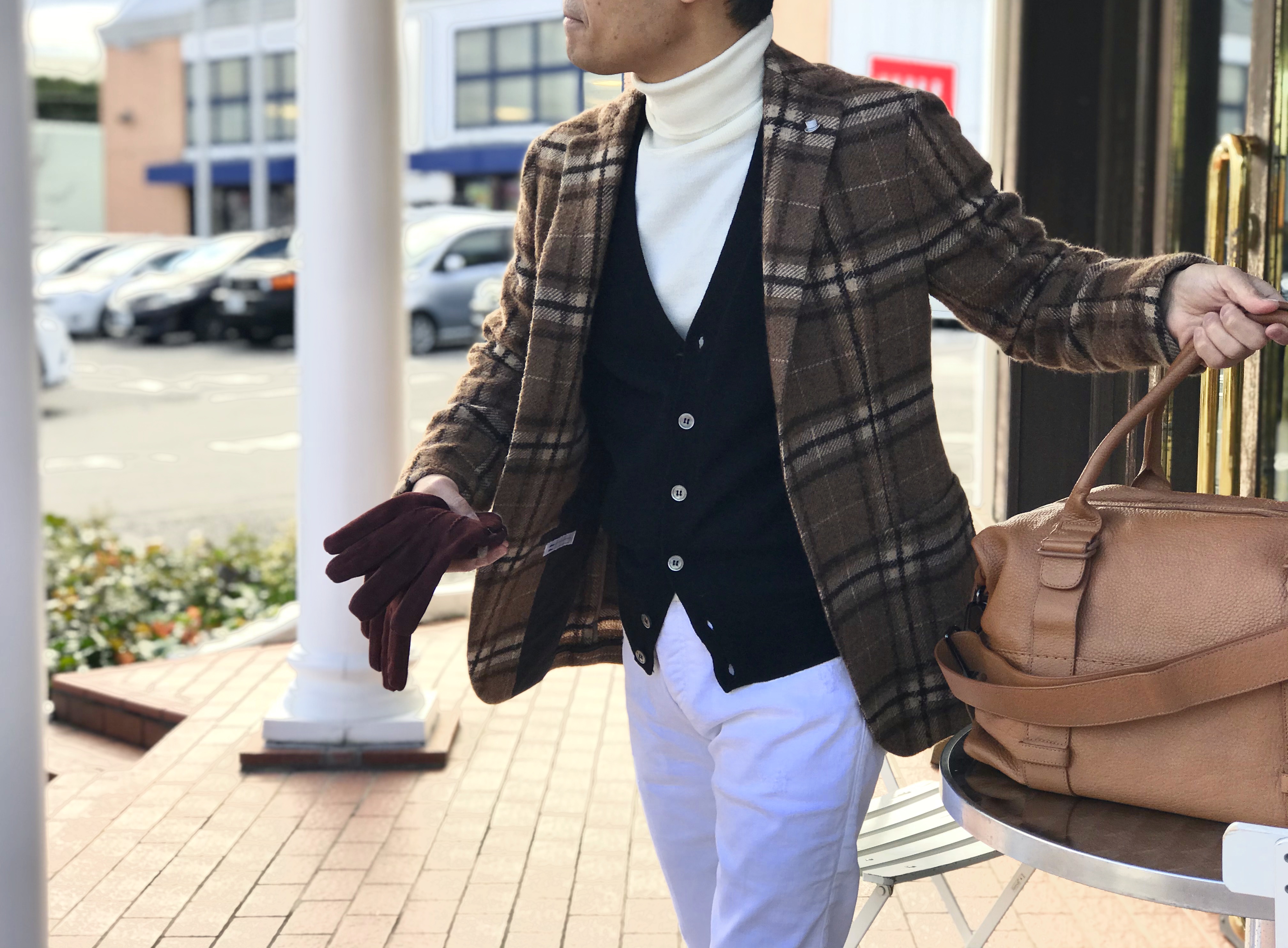 選んだのは、シャツではなくJOHN SMEDLEYの24ゲージタートルネック「CONNELL」。レディースだけでなく、今ではメンズでも広がりを見せるツインニット提案。でも、ニットの柔らかさだけでは可愛い過ぎると言うので、間にMONTEDOROのミニ千鳥格子柄ジレを挟んで、ジャケットスタイルのような印象にまとめました。