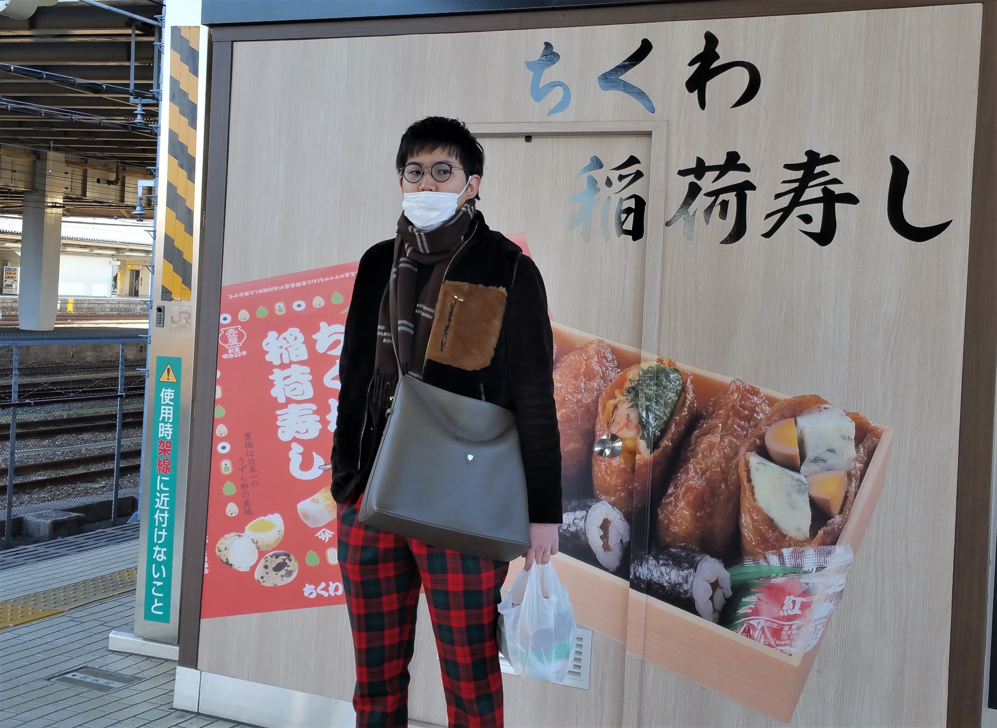 30日、木曜日に出かけた東京。豊橋駅のホームでの一枚。気になるのは、コロナウィルス。流行に乗りたくないと駅でマスクを買い、万全の装備。でも、この写真を上さんに送ったら、「鼻を隠さないと意味ないよ」の返信。実は私も知らなかった、慣れないマスク付け。早い時期の収束を願うばかりです。それにしてもお気に入りの服を全身にまとったジュニア。マスクと手に持った稲荷寿司以外はすべてグローリーガイです。
