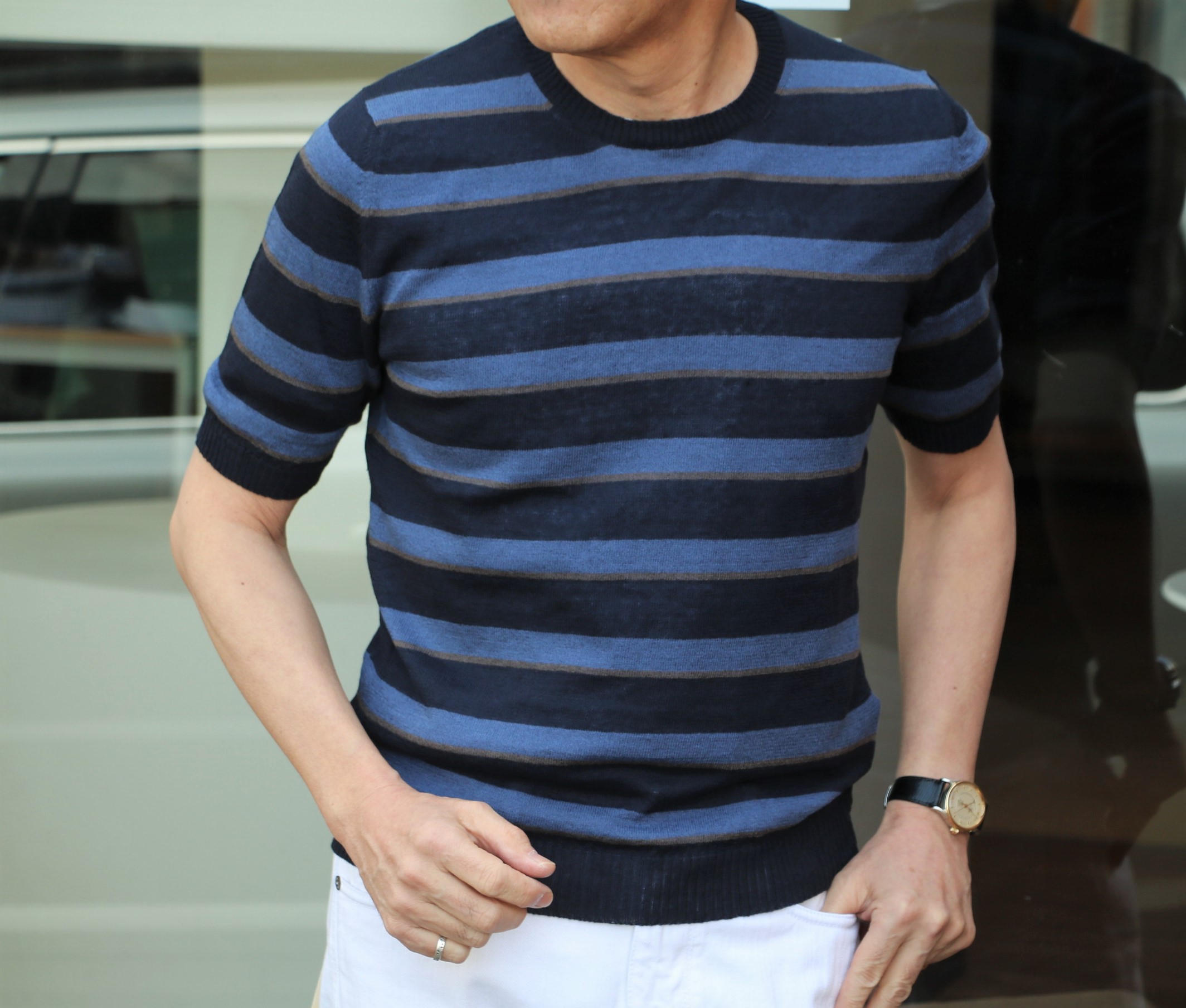 MODEL:半袖ボーダー柄ラウンドネックセーター