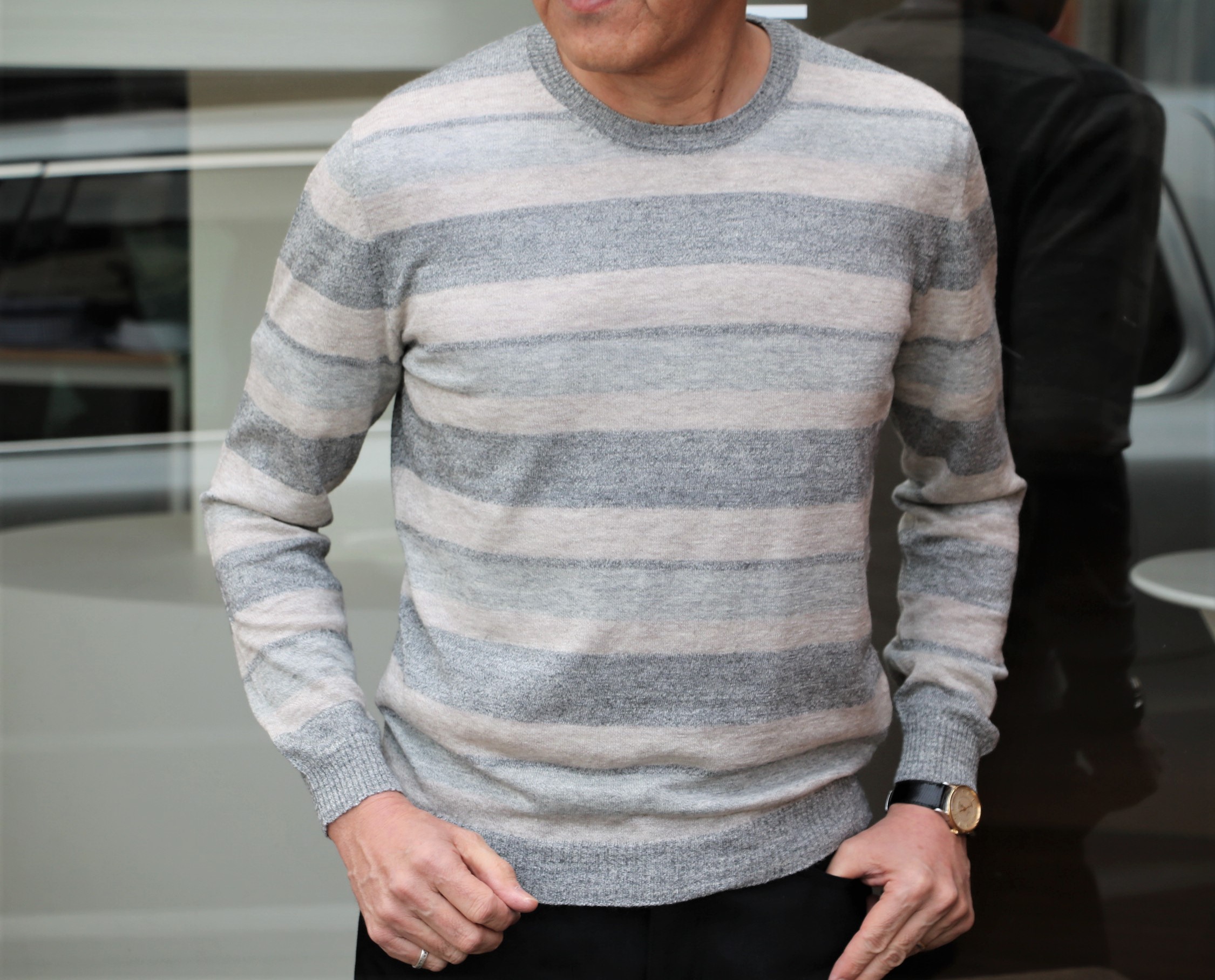 カシミア・シルク・リネンのソフトな風合いとグレイベージュの優しいボーダー柄ラウンドネックセーターです。このエアリーさを表現できるのは、現代の編み機と違い、今となっては稀有なスイス製ヴィンテージ編立て機を使い、熟練した職人が時間をかけて、ゆっくりゆっくりと編みこんでいくからです。ただ甘いだけではなく、型崩れのしない芯の強い、しっかりしたニットが出来上がります。まるで甘さだけではなく、アーモンドの香ばしさが口に残る「小枝」のように...いや、そんな庶民的な意見では語れないニットでした。