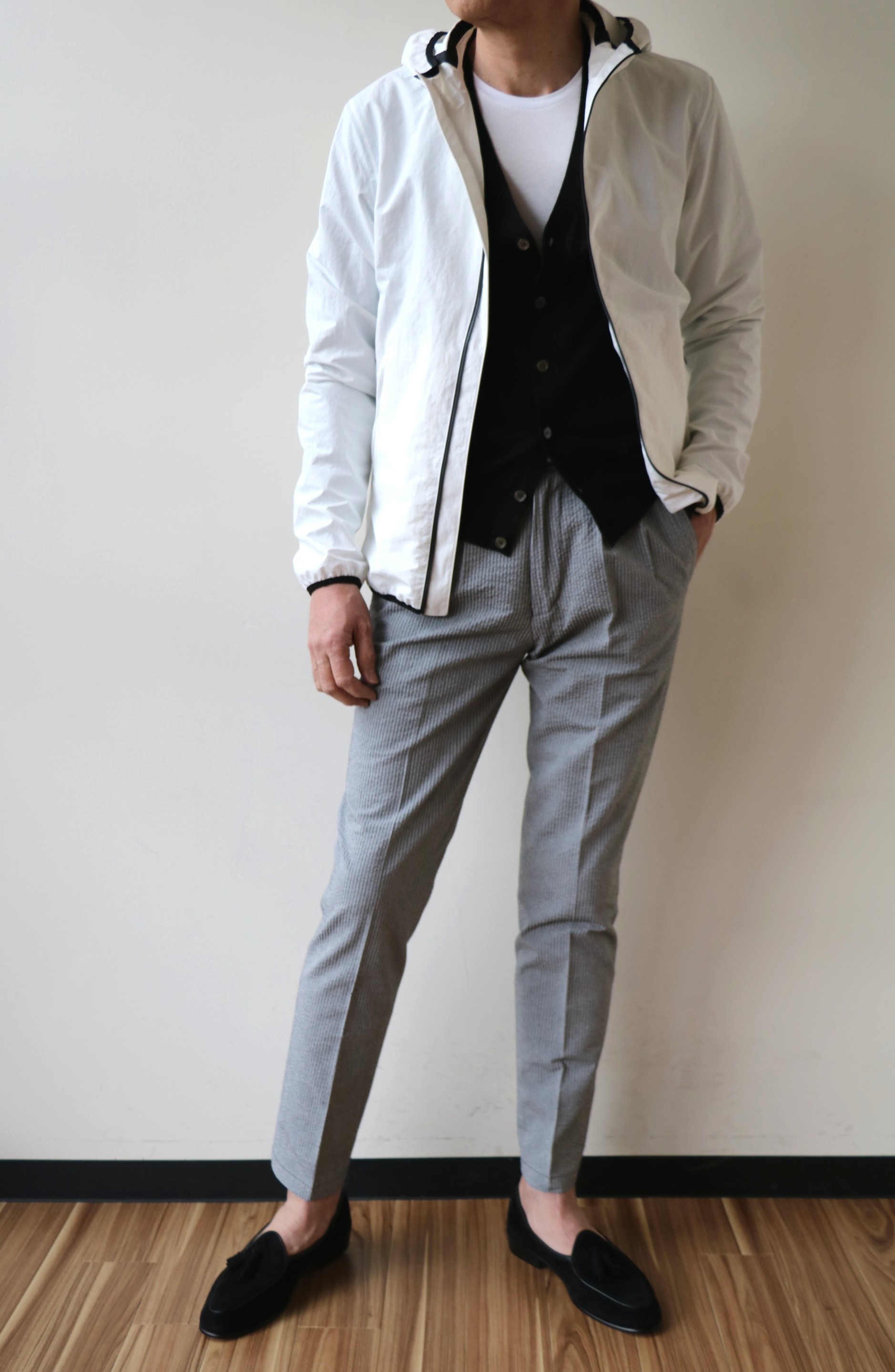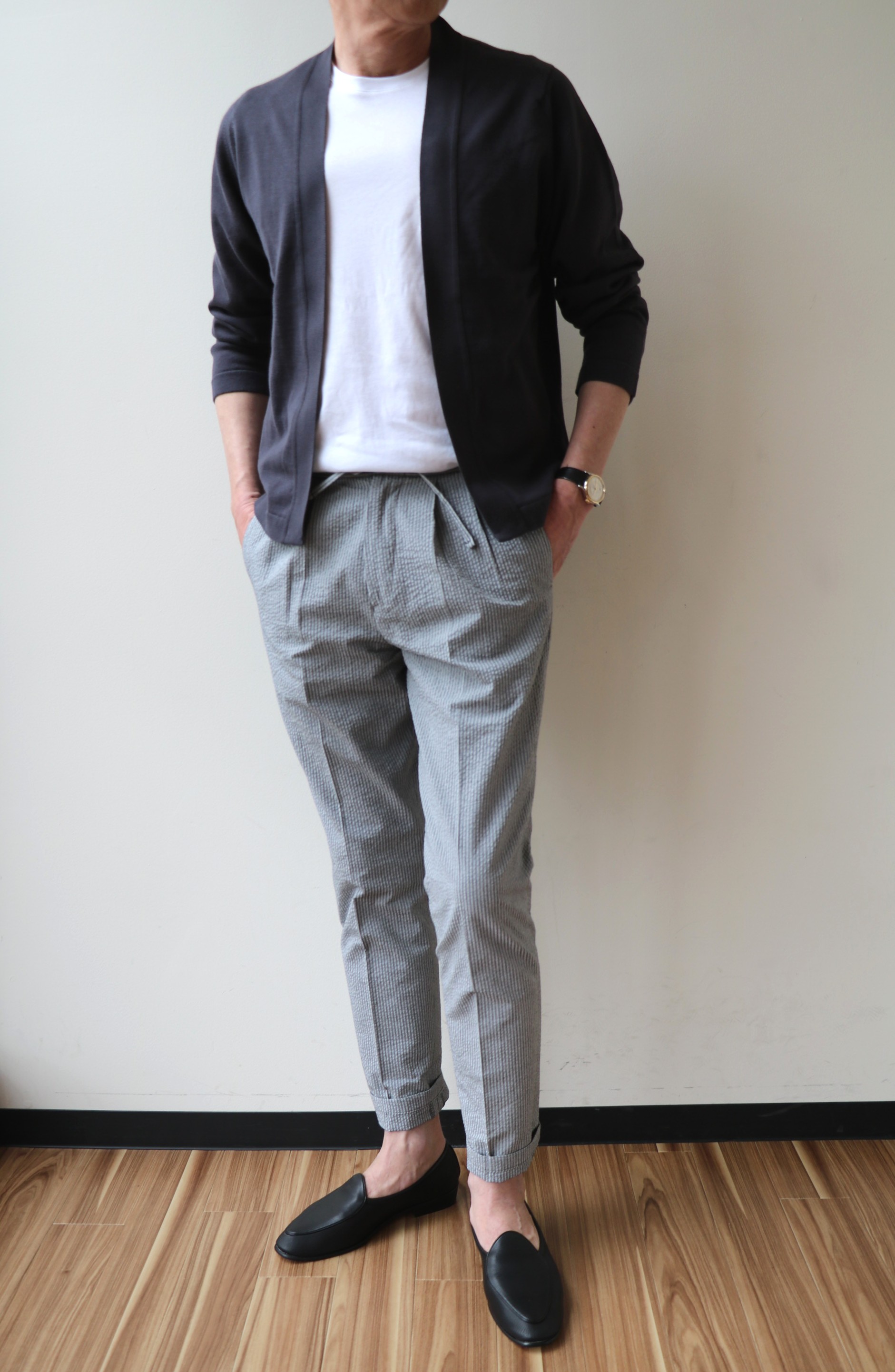 魅力は、釦のない気楽さとスタイリッシュなデザイン。春にももちろん、真夏の太陽から肌を守ったり、冷房対策としても活躍する、春夏の必需品になることは間違いありません。合わせたパンツはVIGANO(ヴィガーノ)、カットソーは私物のmey story(マイストーリー)、靴はBAUDIN&LANGE(ボードインアンドランジ)です。