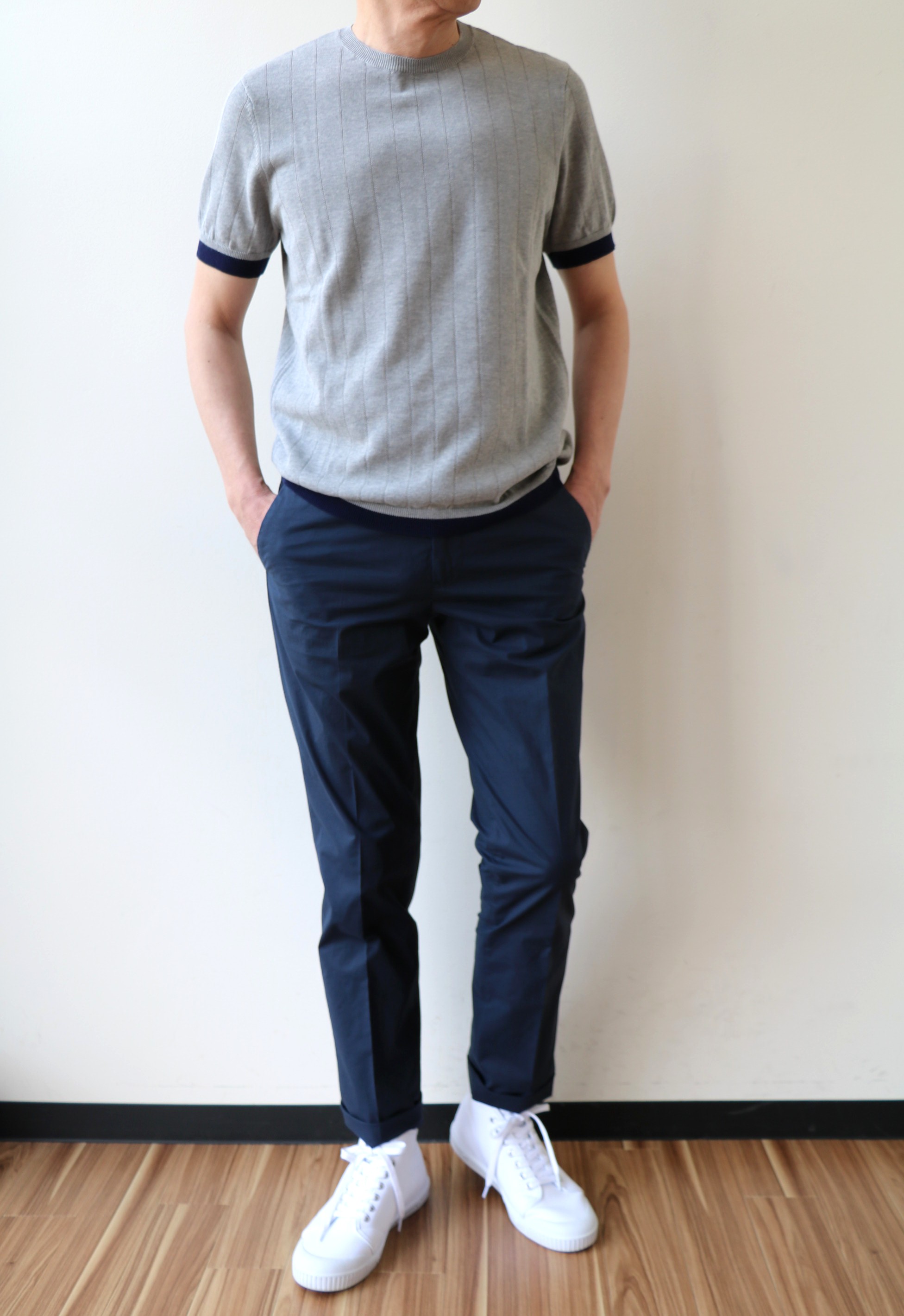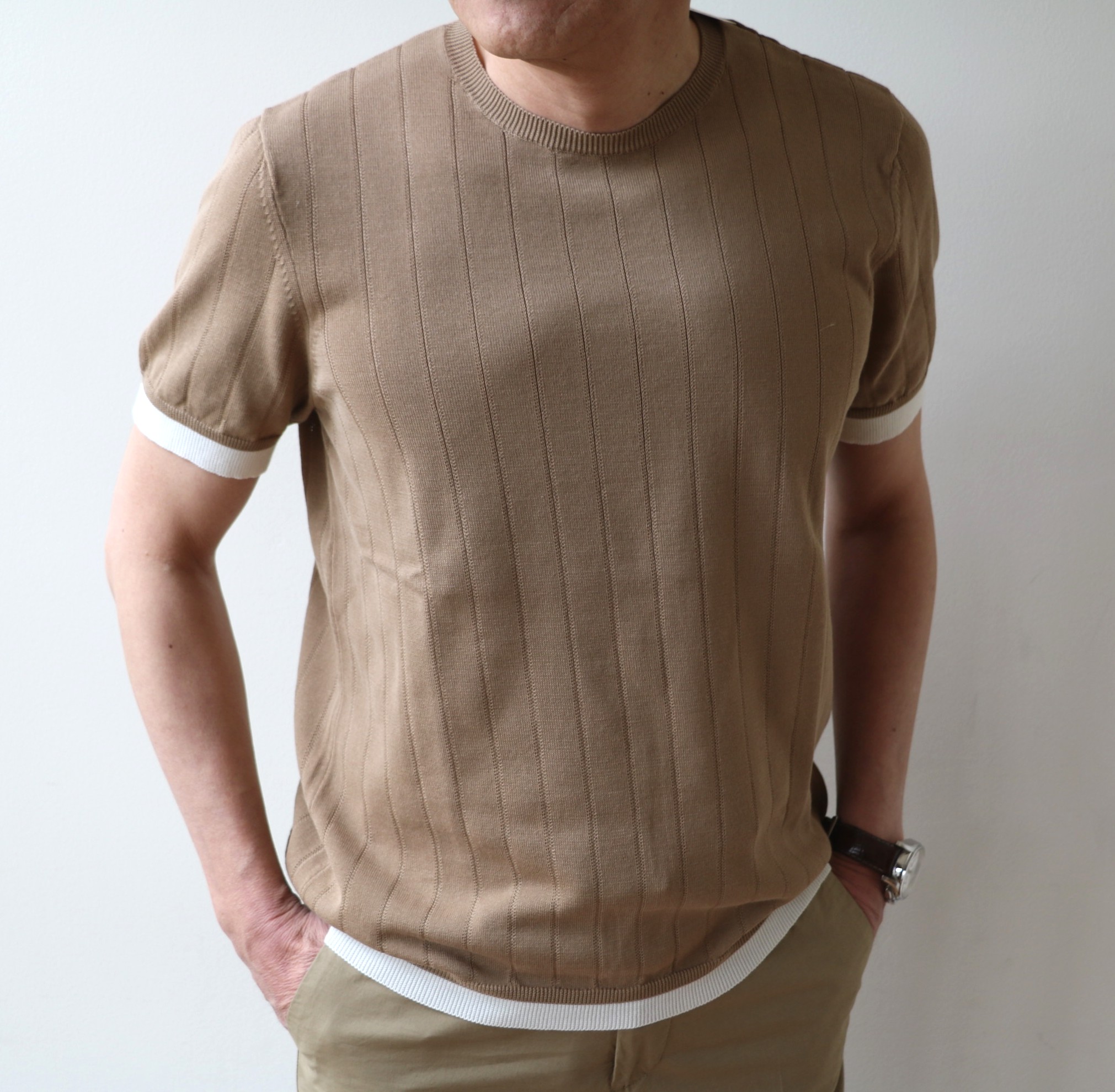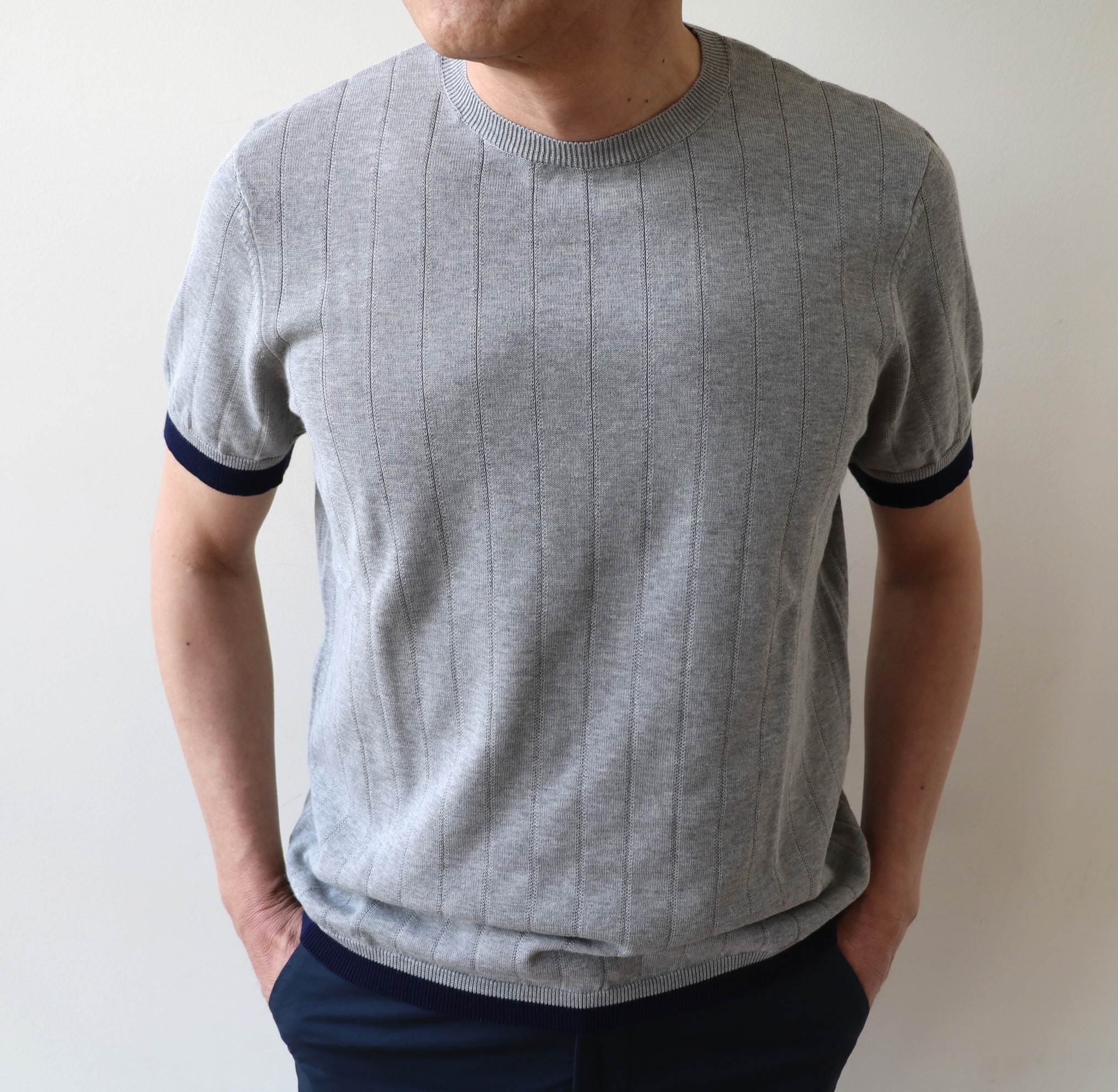 いきなりの半袖です。展示会でまず最初に目に付いたのが、編地と袖、裾口の切り替えがアクセントのクルーネックニット。「ジェントルマンフィット」の紳士に合わせた、ゆとりのあるフィッティングです。サイズ46を着用しております。