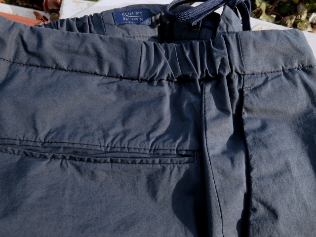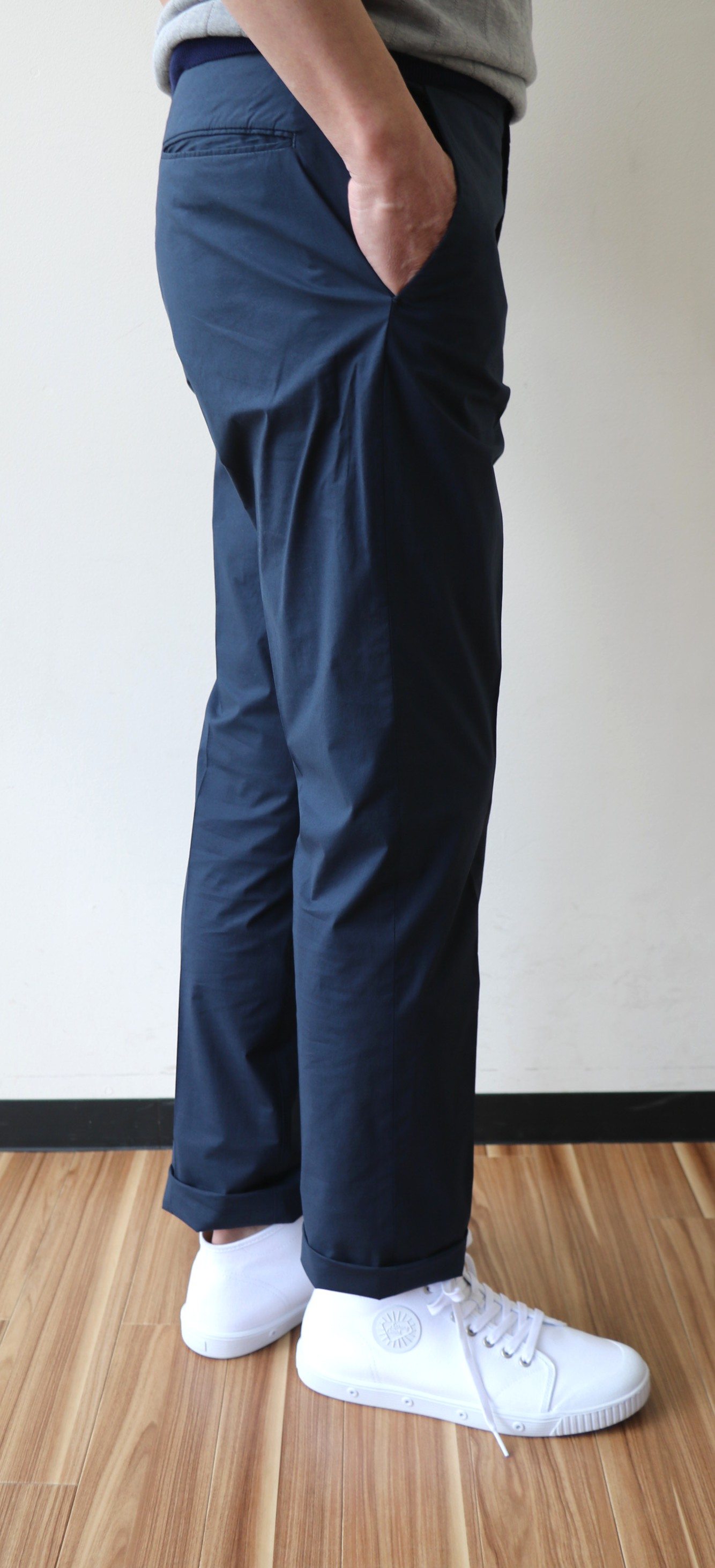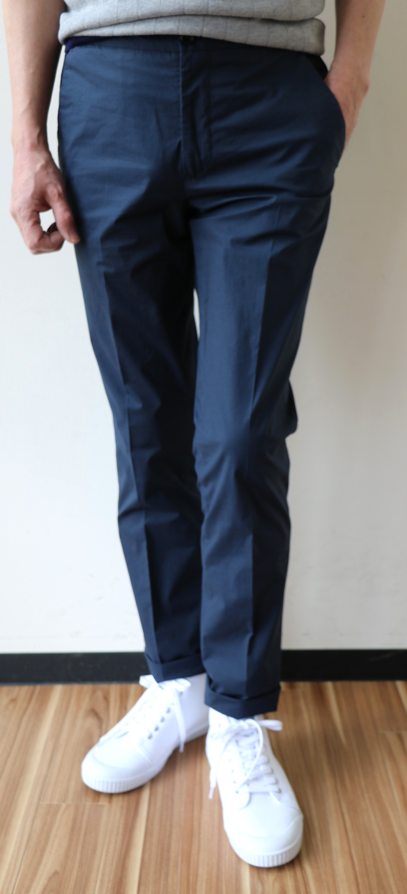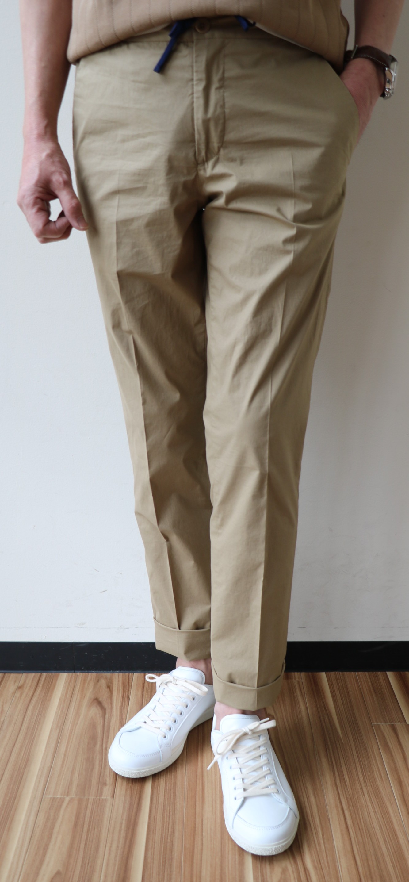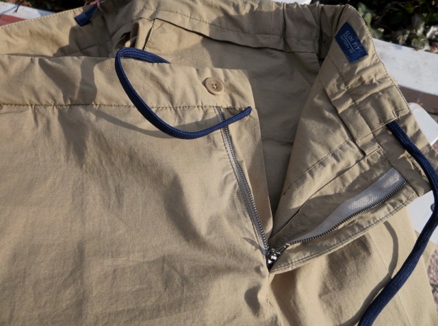 合わせたのは、ドローコードが内側に付いたコットンポプリンのストレッチパンツ。「SLIM FIT」の程よい抜け感のある、すっきりフォルムと、真夏でも穿ける、軽い穿き心地が魅力です。セレクトカラーはキャメルとネイビー。太陽光の下で、やや明るくなっております。