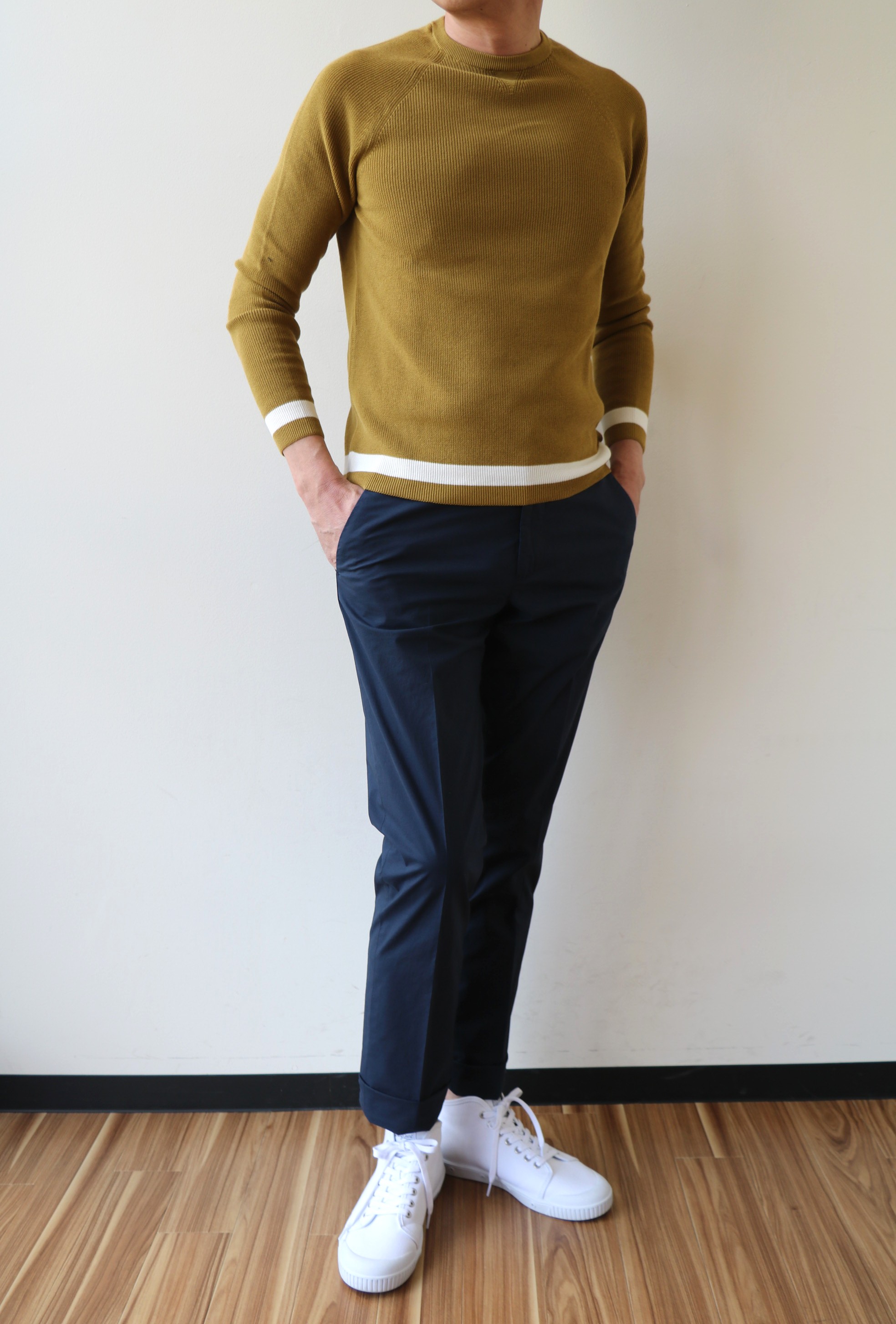 MODEL:袖、裾ライン入り長袖クルーネックニット