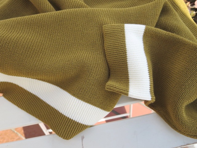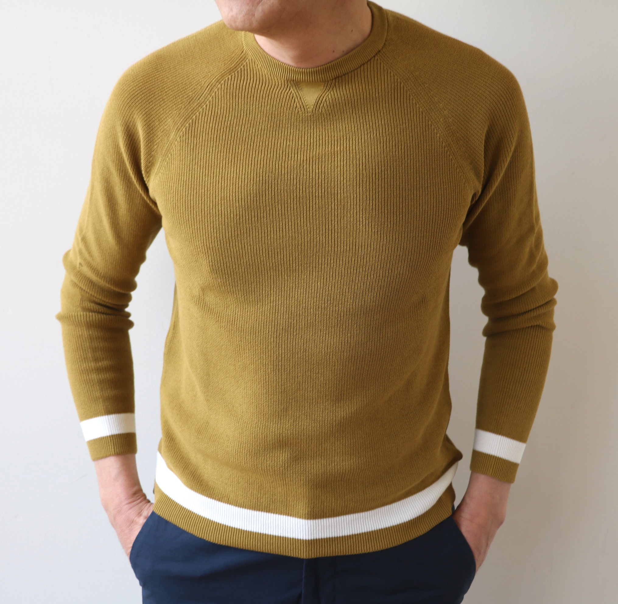 新しい感覚のニットです。「カレッジラグランクルーニット」とでも呼びましょうか。潔く、このマスタード一色でのセレクトです。