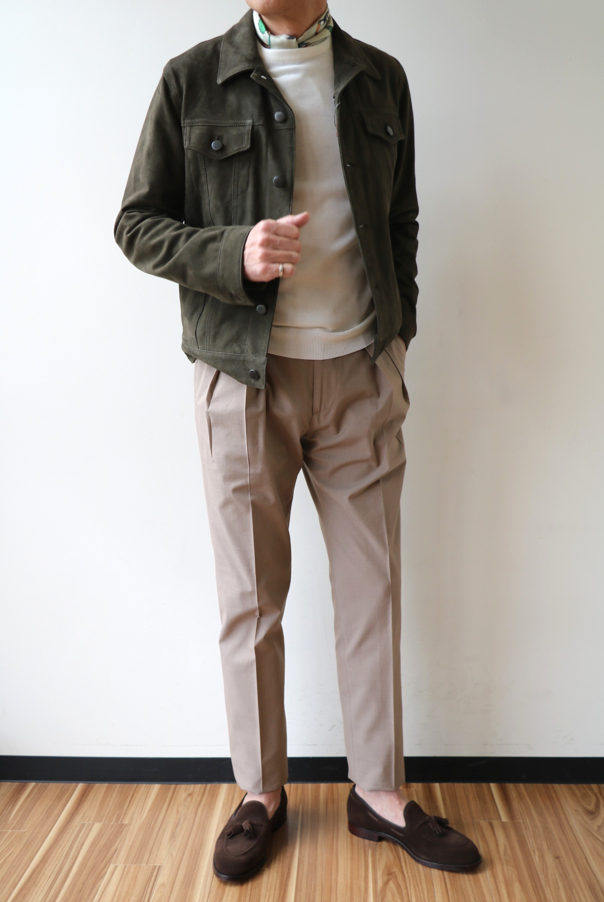 ホワイトはサイズ46を、キャメルとグレイは48を着ております。従来通り、ジャストで着るならば46ですが、ゆとりを取るなら、サイズ48でしょうか。インにシャツを合わせるなら、私の場合、48を選びます。