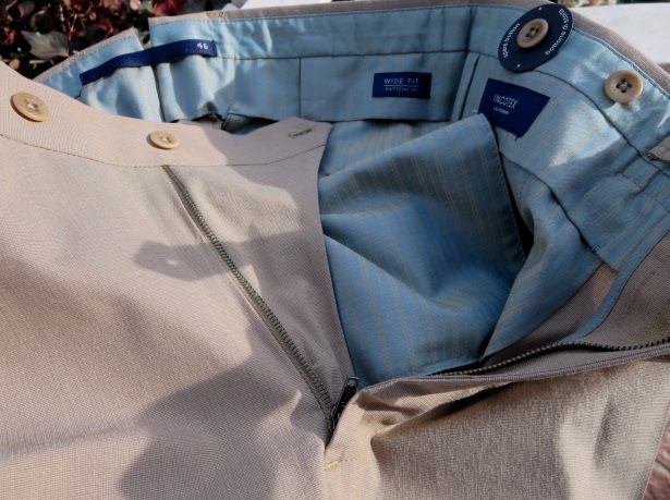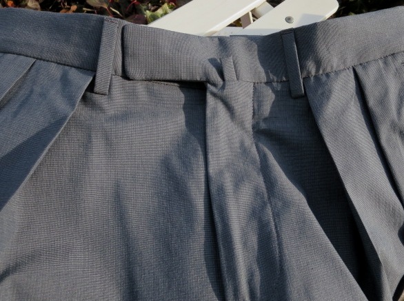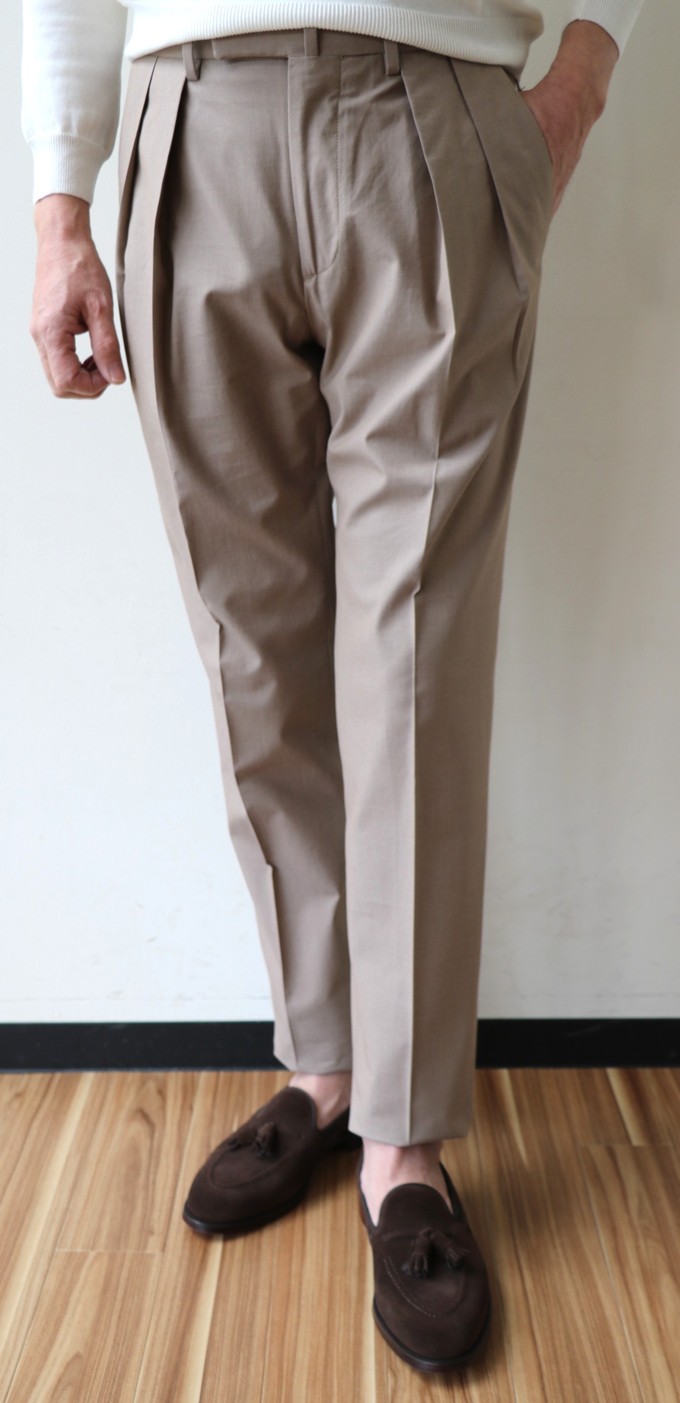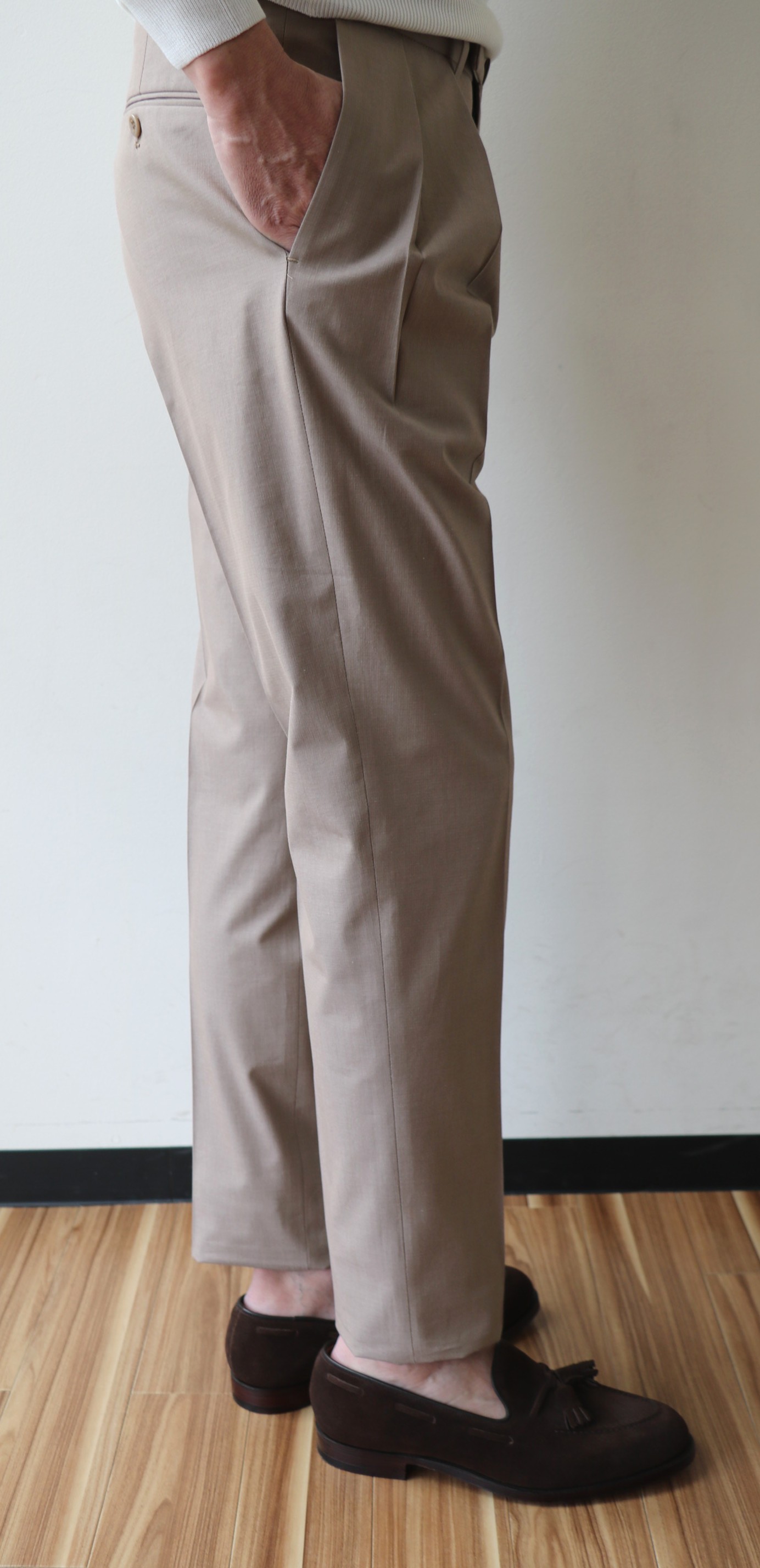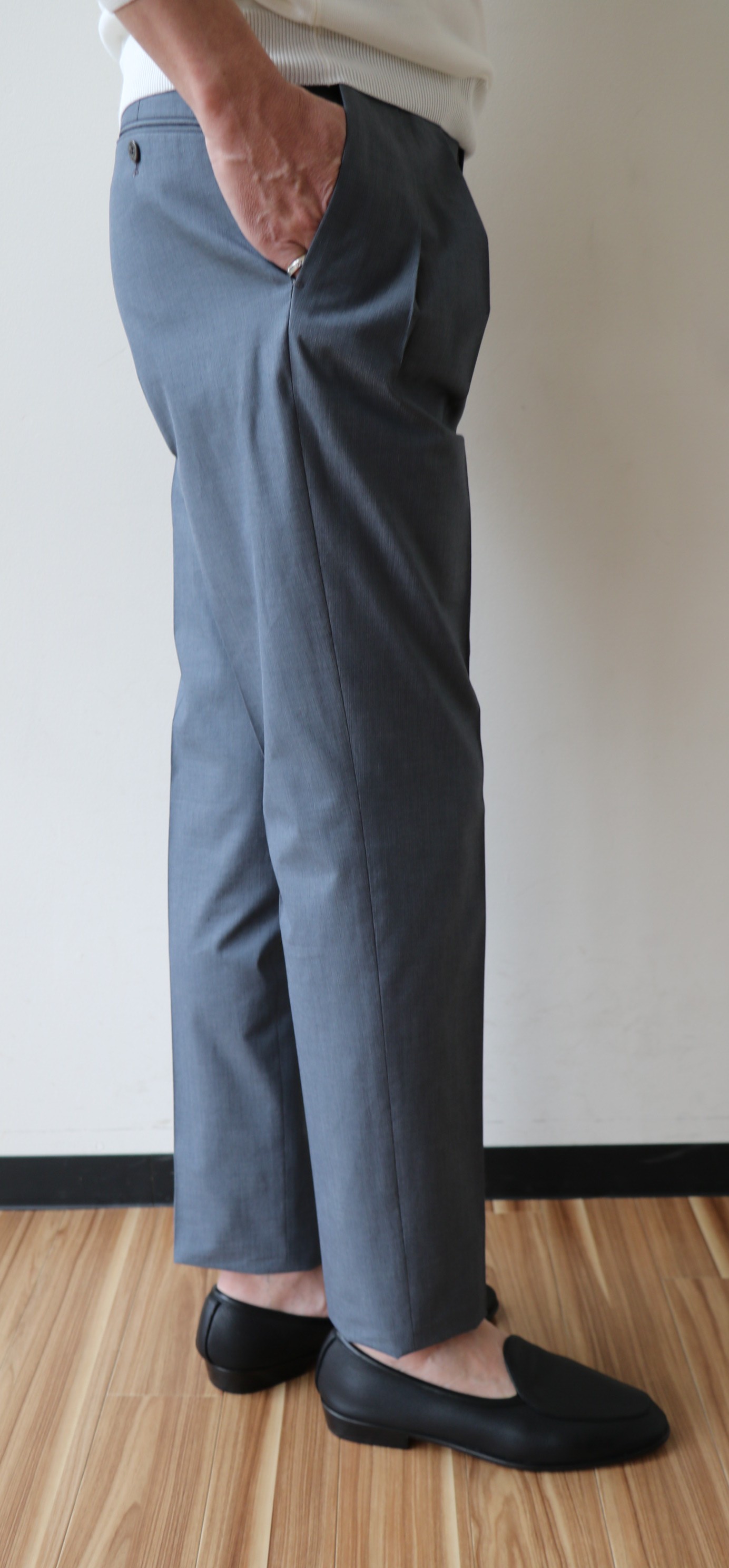 プレコレクションの際に写した写真です。手帳を見れば、昨年の7月3日でした。コレクションの中で、最も気になったのが、この深いひだのツープリーツ。それも外側ではなく、内側のインプリーツに。いつもなら、殆ど試着しないでオーダーするのですが、穿いてみたいと、その気にさせてくれたパンツです。インプリーツは、正式には、Forward Pleat/フォワード プリートと言いますが、英国のパンツに多く見られます。逆のアウトプリーツは、Reverse Pleat/リバース プリートといい、アメリカやイタリアのものに多いデザイン。よりエレガントに見えるのは、内側のものです。英国趣味だった私は、20代の頃から好んで穿いていたのが、インのツープリーツ。当時はブレイシーズ(サスペンダー)をつけていましたが、このモデルの良いところは、深すぎない股上。サスペンダーなしで、英国的な装いを楽しめることです。