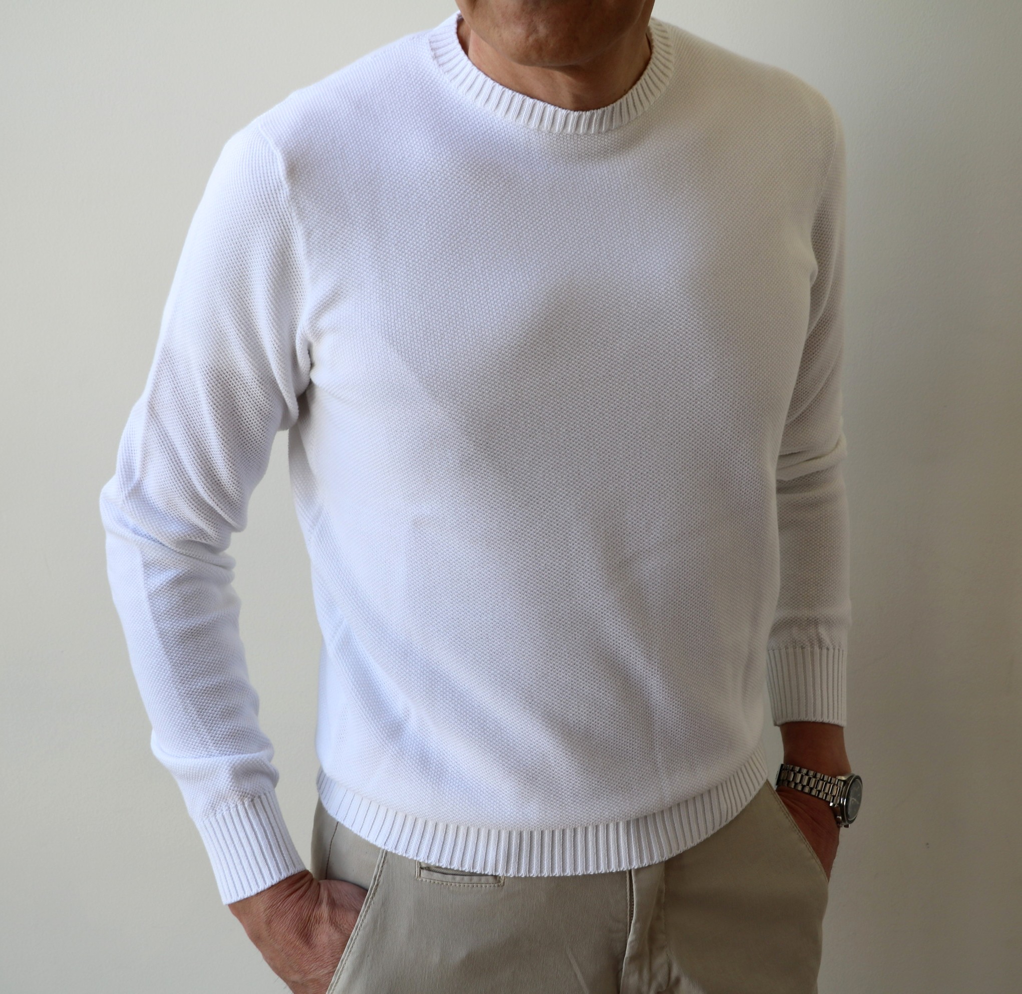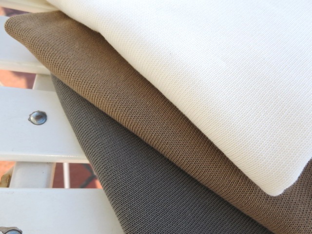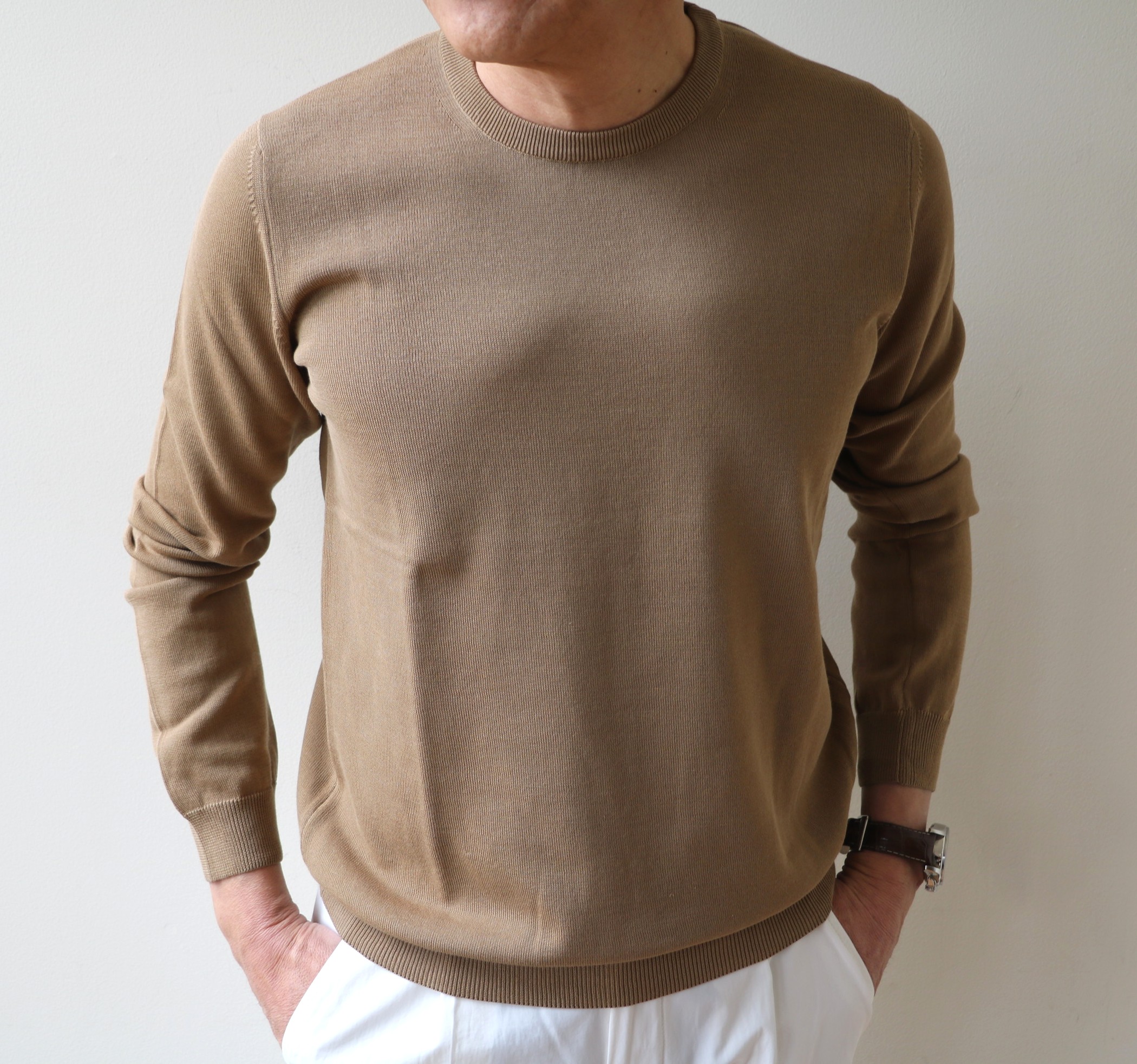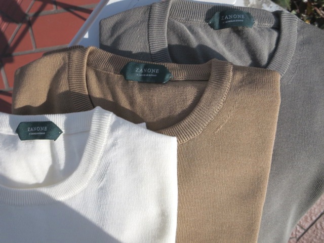 再び、ザノーネのニットに戻ります。ベーシックな12ゲージコットンのクルーネックで選んだ色は、3色。やや生成りがかったホワイトと、ベージュより黄色味のあるキャメル、そしてオリーブがかったグレイです。