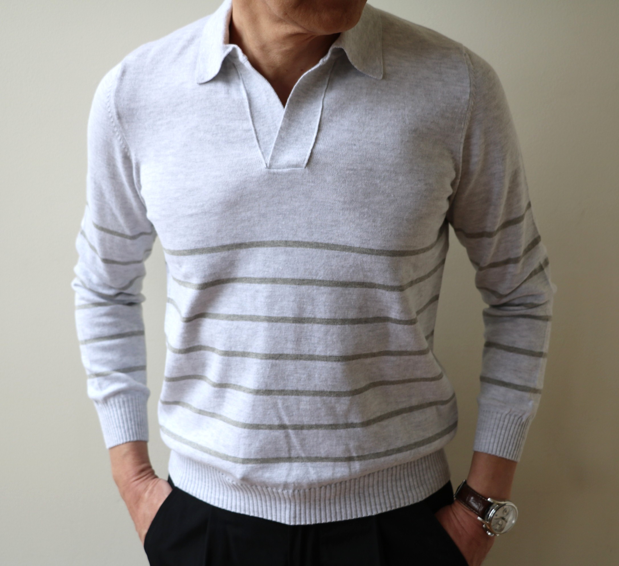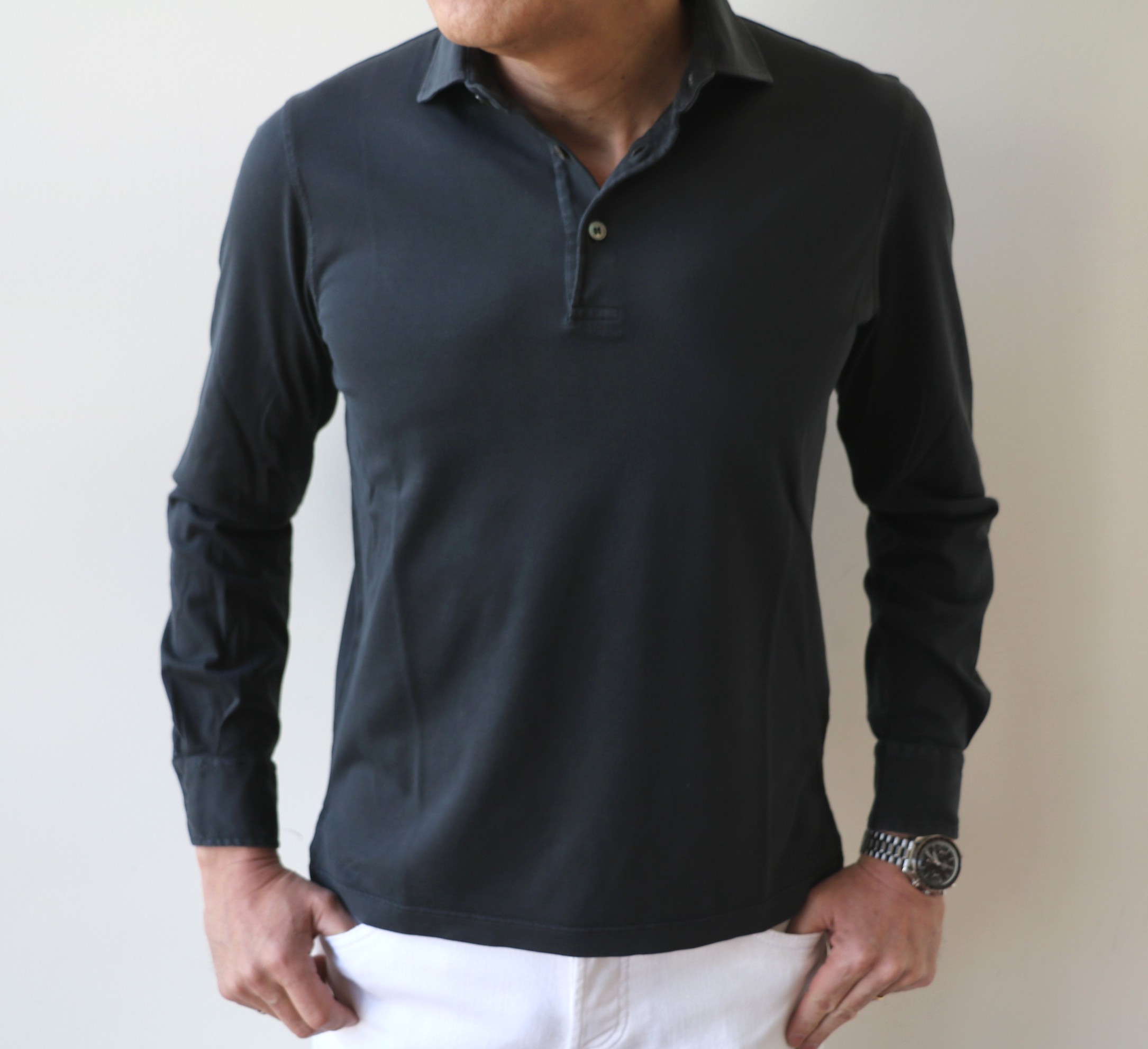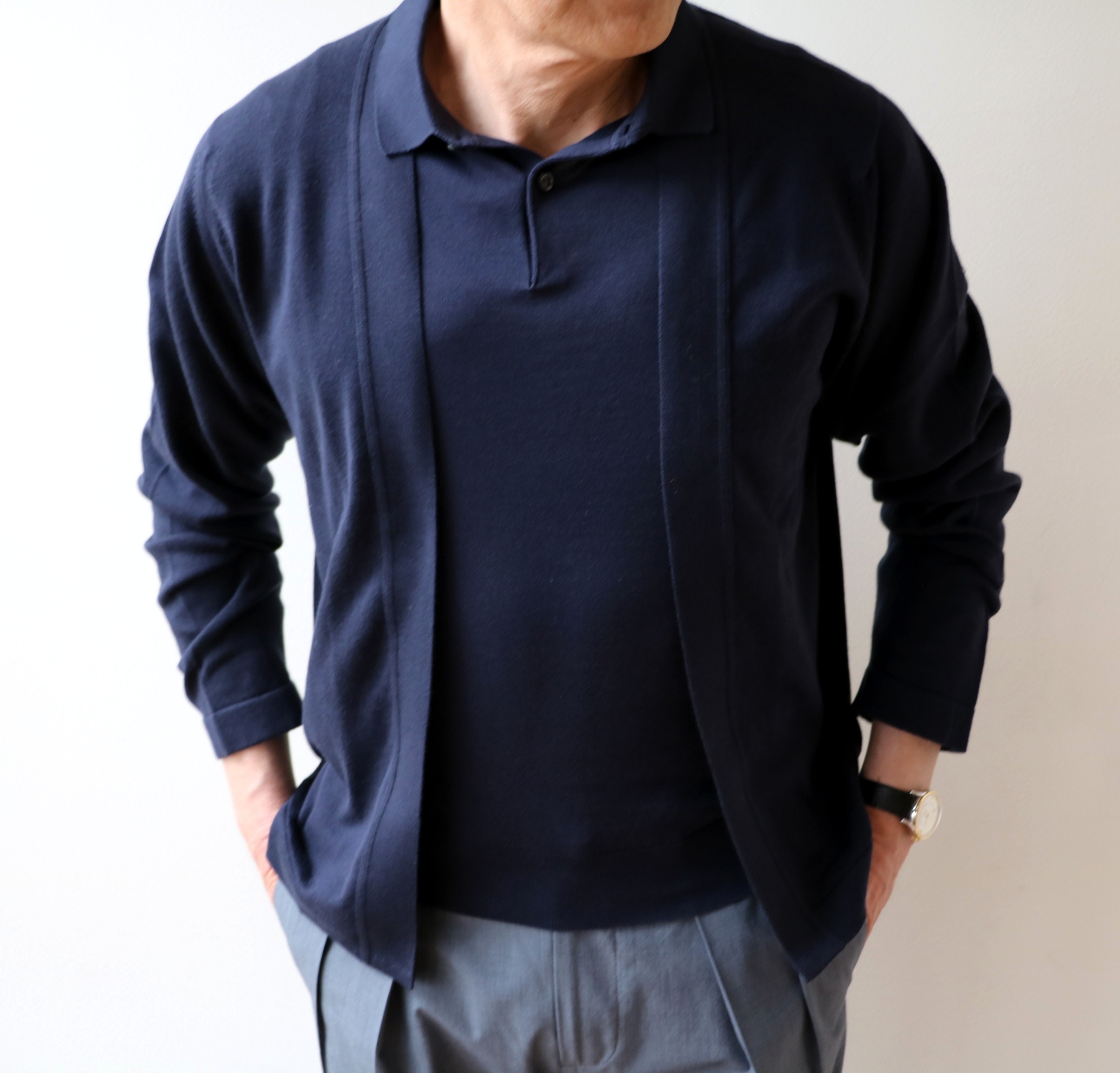 今季の推奨作 INCOTEX(インコテックス)の「コットンシルク マイクロチェック柄ストレッチパンツ」に、THE GIGI(ザ ジジ)のジャケットを羽織って合わせたのは、【JOHN SMEDLEY/ジョン スメドレー】のロングスリーブのポロニット。足元はBAUDOIN&LANGE(ボードインアンドランジ)でエレガントに。昨年、FEDELI(フェデーリ)で展開し、好評でしたが、もう少しこなれた価格帯での要望がかなり多くありました。ならば、ここしかないと選んだのが、こちらです。