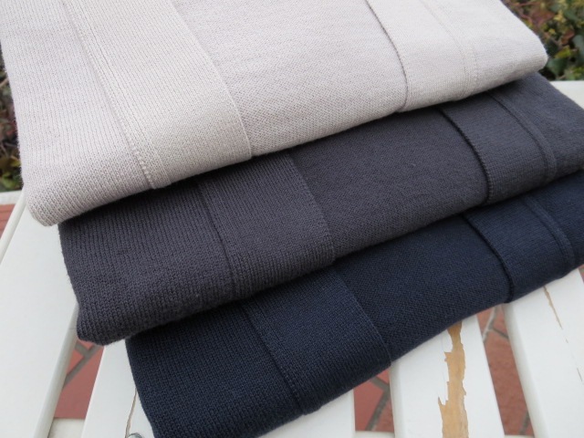 コットン70%、カシミア15%、シルク15%は、不動の混率です。しなやかな肌触り、温もりのある風合い、光沢のある質感と、見た目も申し分ありません。ナチュラルなオフベージュの他にもう一色と、相変わらず自己中心的なセレクトで、やや明るめのネイビーをご用意させていただきました。価格は据え置き、いや、5,000円下がりました。嬉しい配慮です。